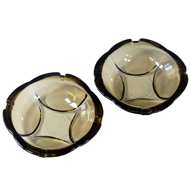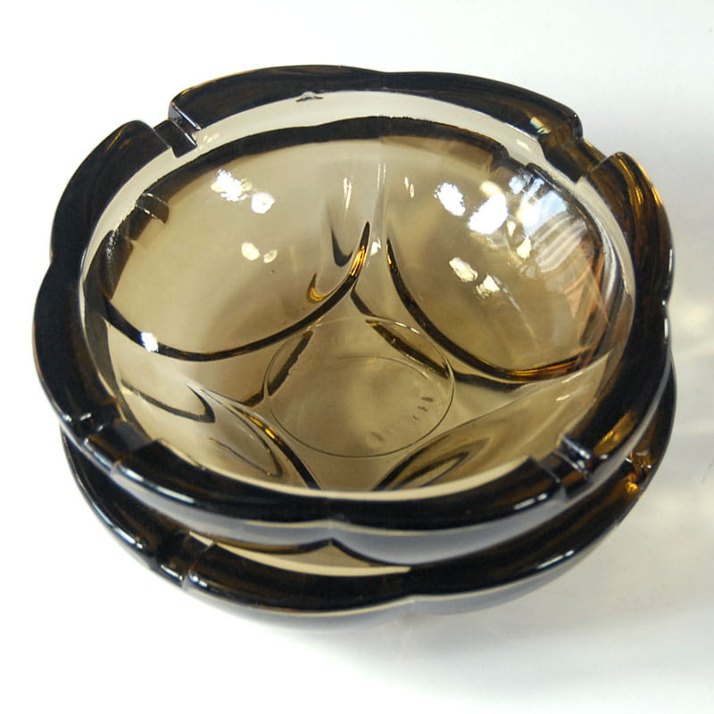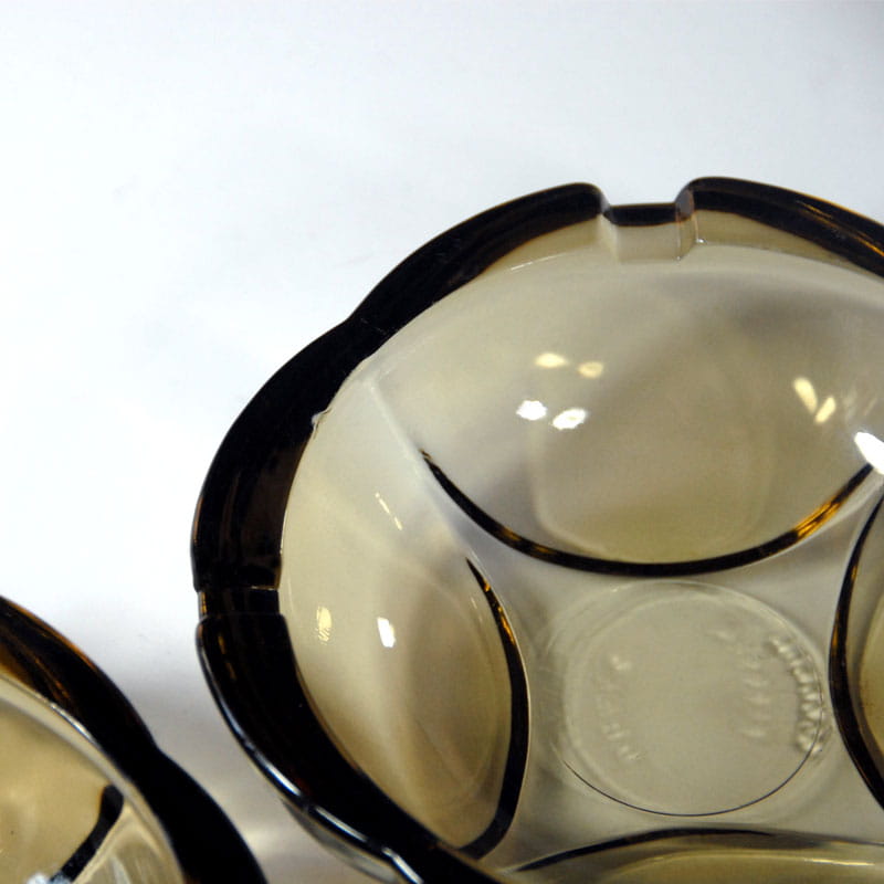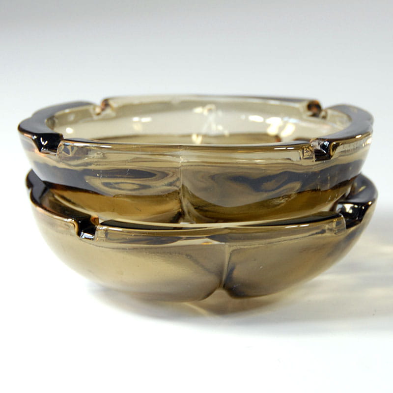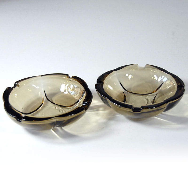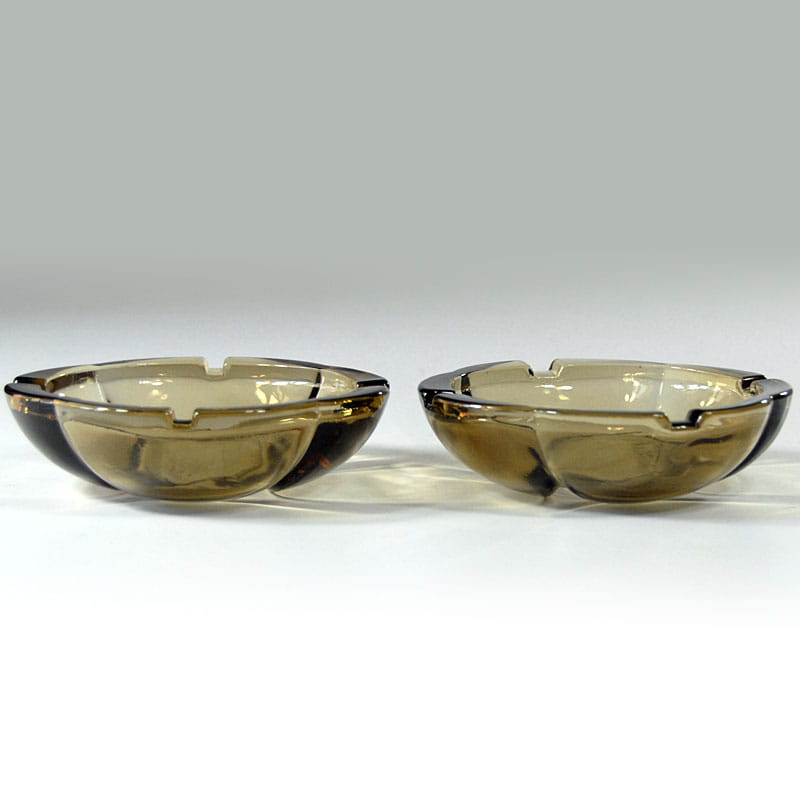 Para popielniczek w pięknym dymnym kolorze zrobionych ze szkła prasowanego. Pochodzą z włoskiej wytwórni Fidenza z lat sześćdziesiątych XX wieku. Sygnowane. Zachowane w bardzo dobrym stanie. Drobny ubtyek na górnej krawędzi jednej z popielniczek. Średnica: 12 cm.