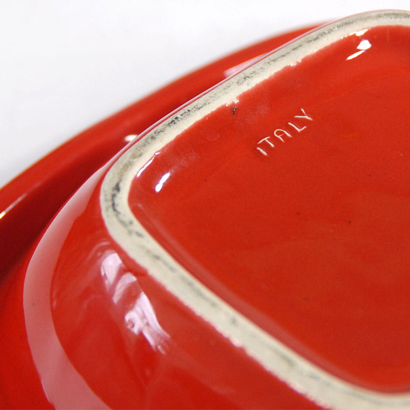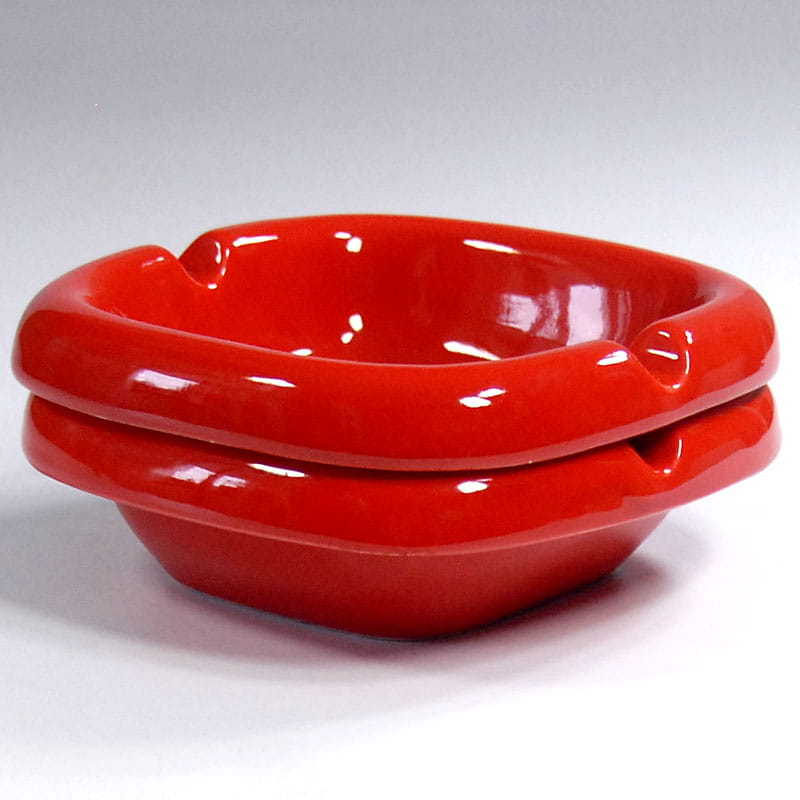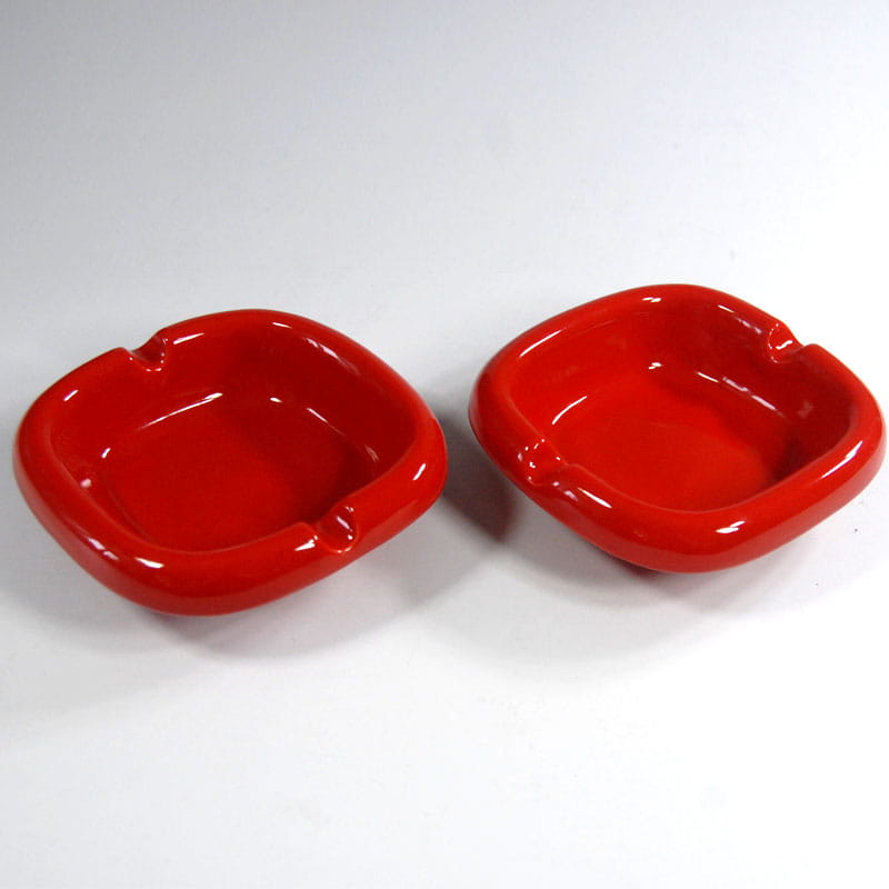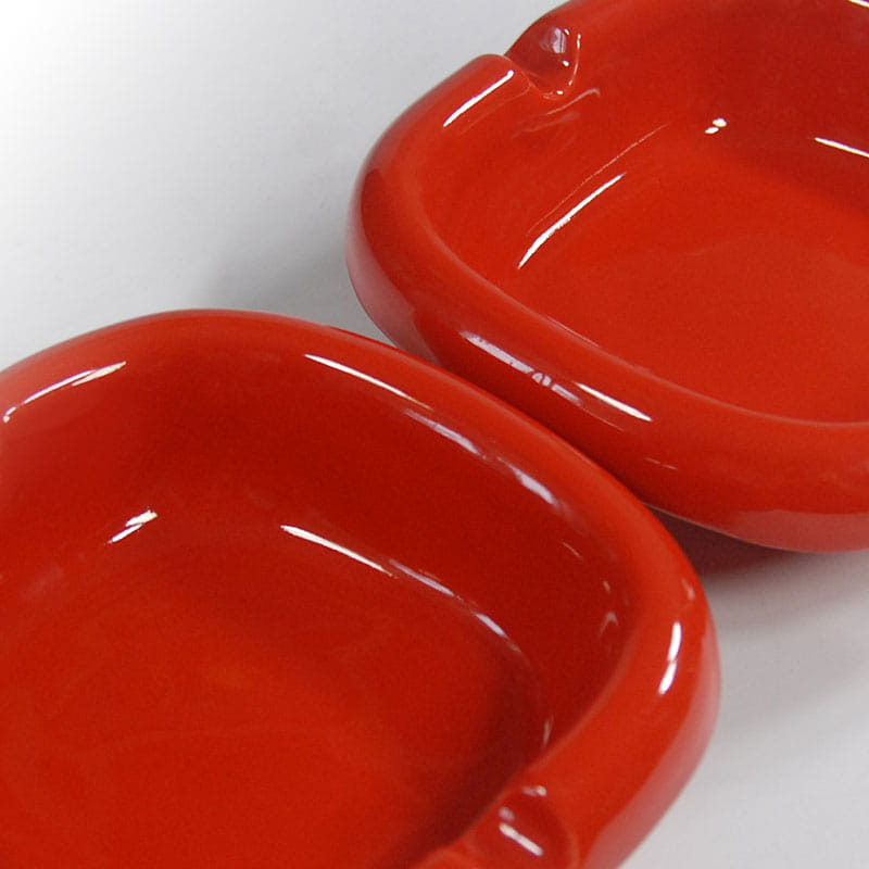 Para dużych, szkliwionych popielniczek w kolorze intensywnej, energetycznej czerwieni. Zaprojektowane zostały w stylistyce Space Age i pochodzą z Włoch z lat siedemdziesiątych XX wieku. Bardzo dobry stan zachowania, z niewielkimi śladami używania. Wymiary: 16 x 16 x 5 cm.