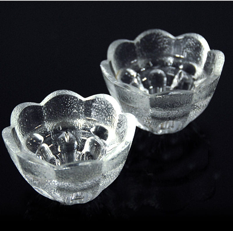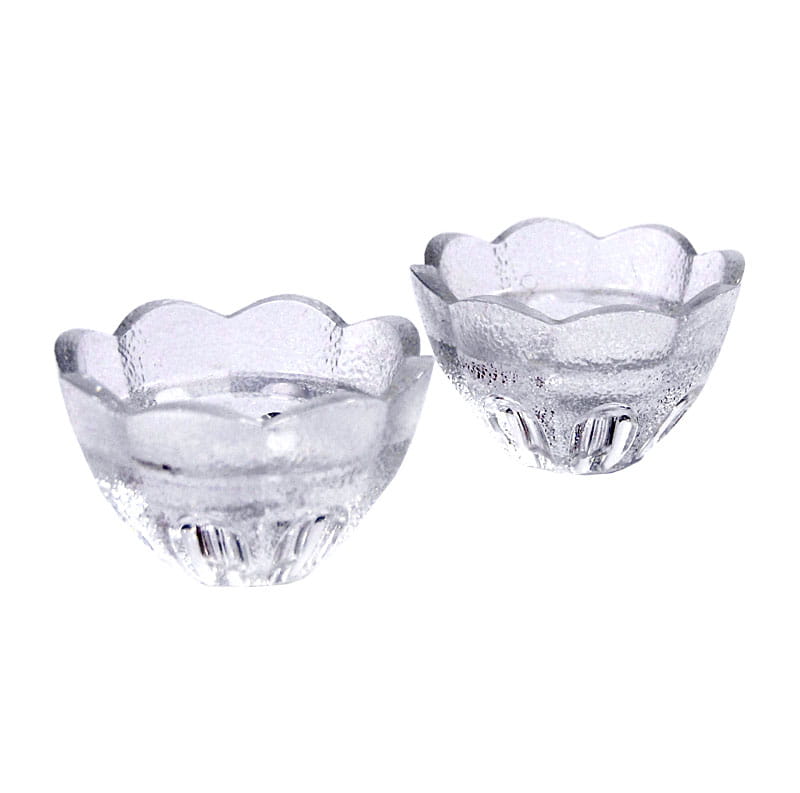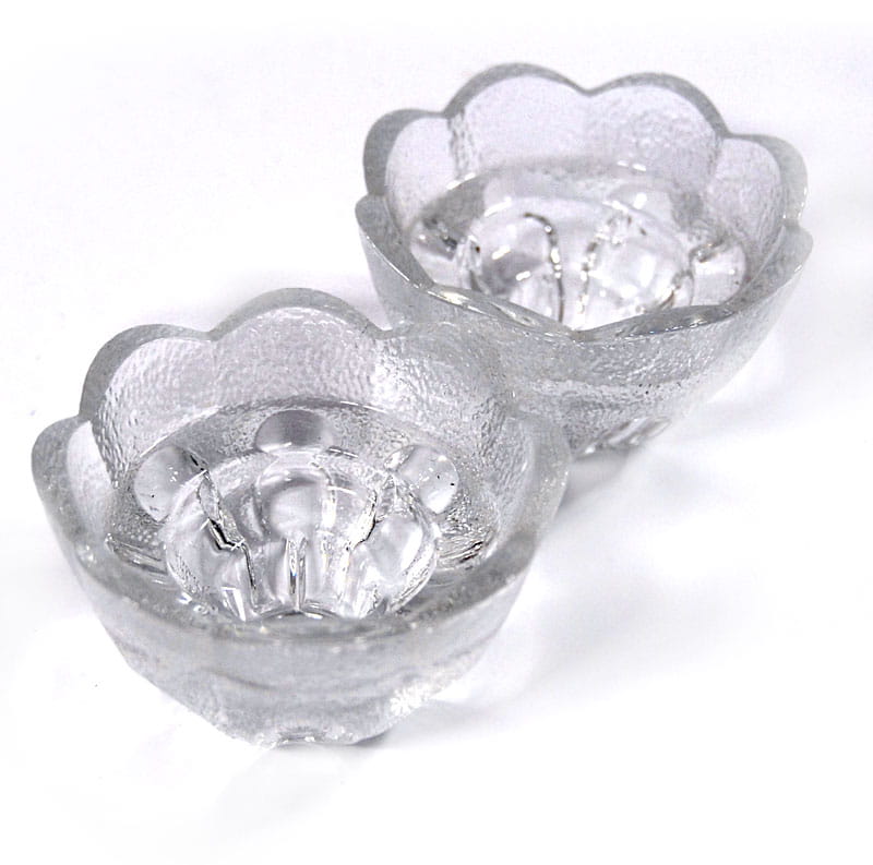 Para świeczników ze szkła prasowanego. Pochoodzą z renomowanej duńskiej wytwórni Holmegaard z lat siedemdziesiątych XX wieku. Średnica: 8,5 cm. Wysokość: 5 cm.