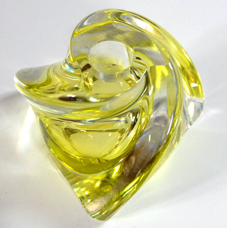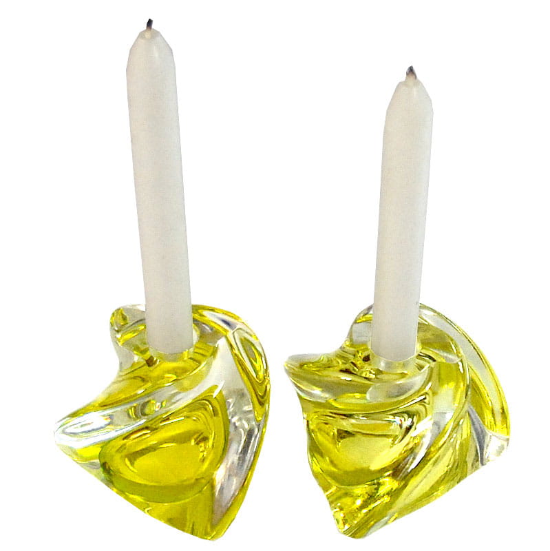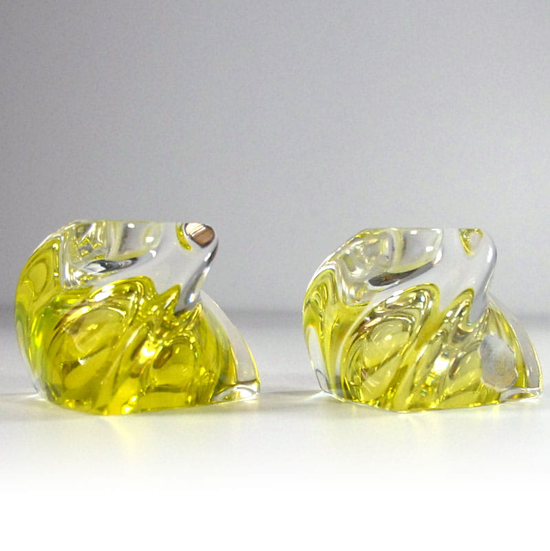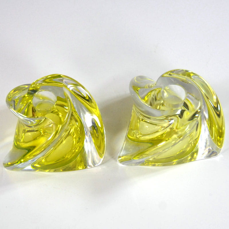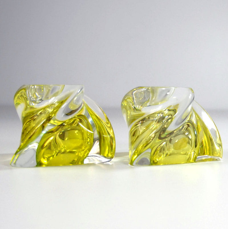 Para świeczników stołowych zrobionych z barwionego szkła kryształowego o bardzo pięknym, cytrynowo zielonym kolorze. Pochodzi z renomowanej belgijskiej wytwórni Val St Lambert z lat sześćdziesiątych XX wieku. Ślady używania w postaci delikatnych zarysowań powierzchni. Wymiary podstawy: 10 x 10 x 10 cm. Wysokość: 7,5 cm.