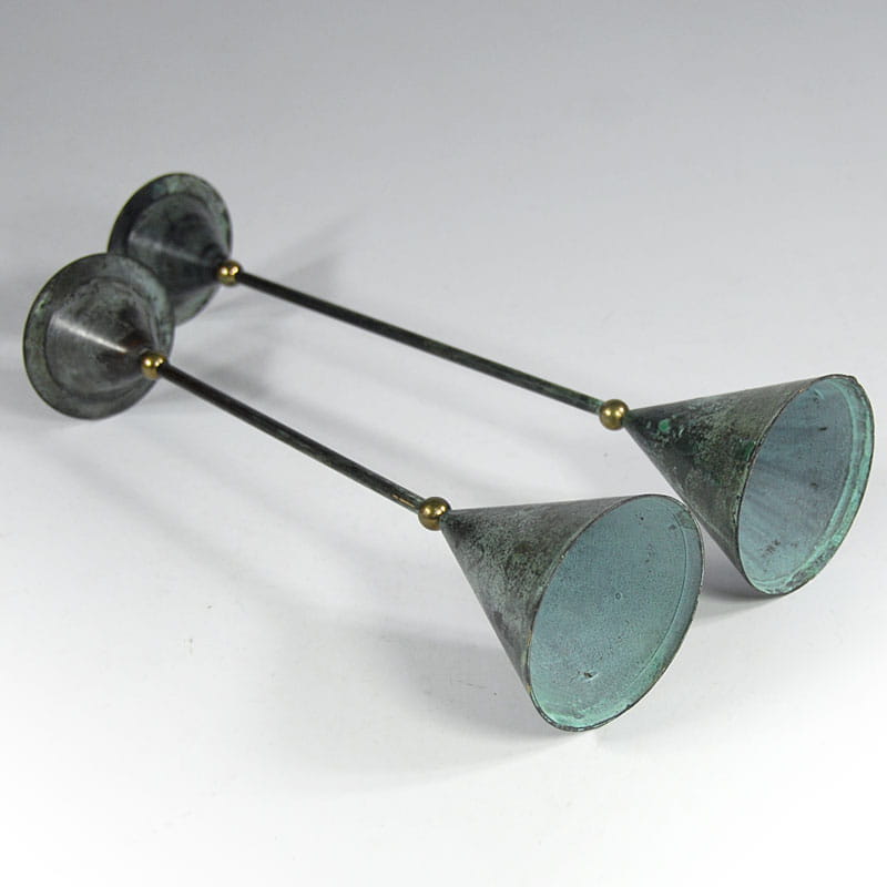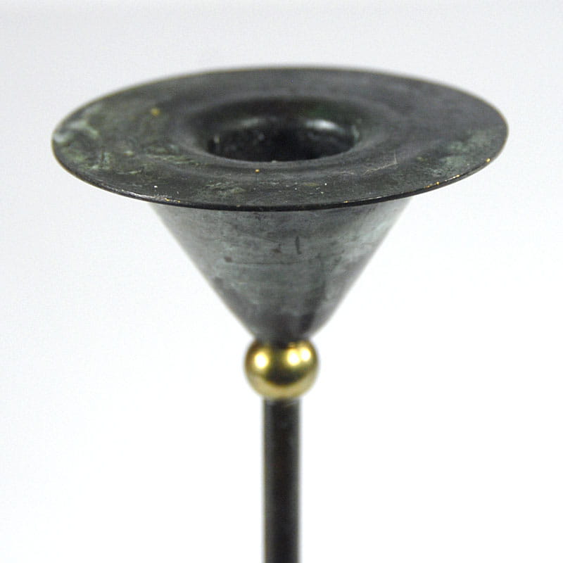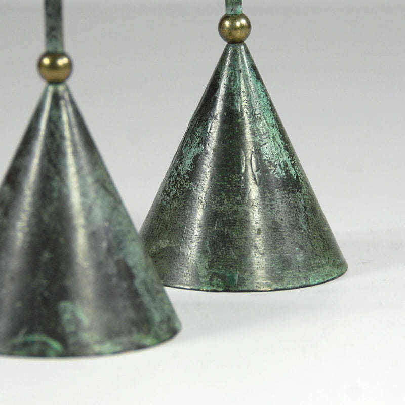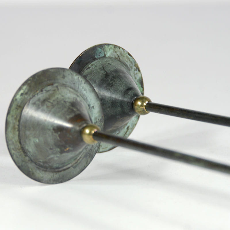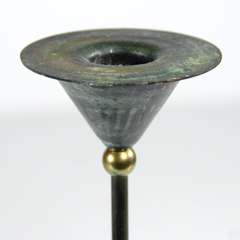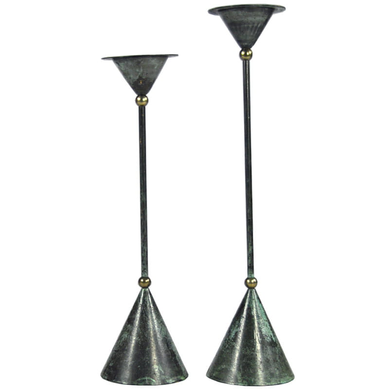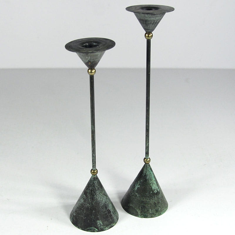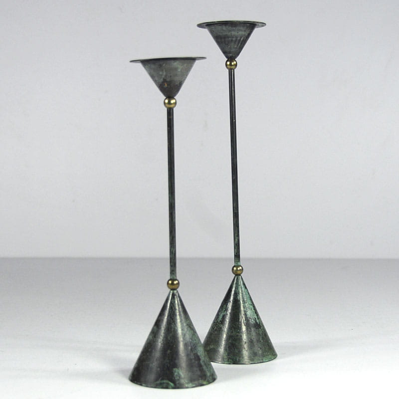 Para dekoracyjnych świeczników stołowych zaprojektowanych w stylu Memphis Group. Zrobione są z malowanej i patynowanej blachy metalowej. Bardzo dobry stan zachowania. Pochodzą z Niemiec z lat osiemdziesiątych XX wieku. Wysokość: 32,5 i 28,5 cm. Średnica podstawy: 7,5 cm. Średnica góry: 6,5 cm.