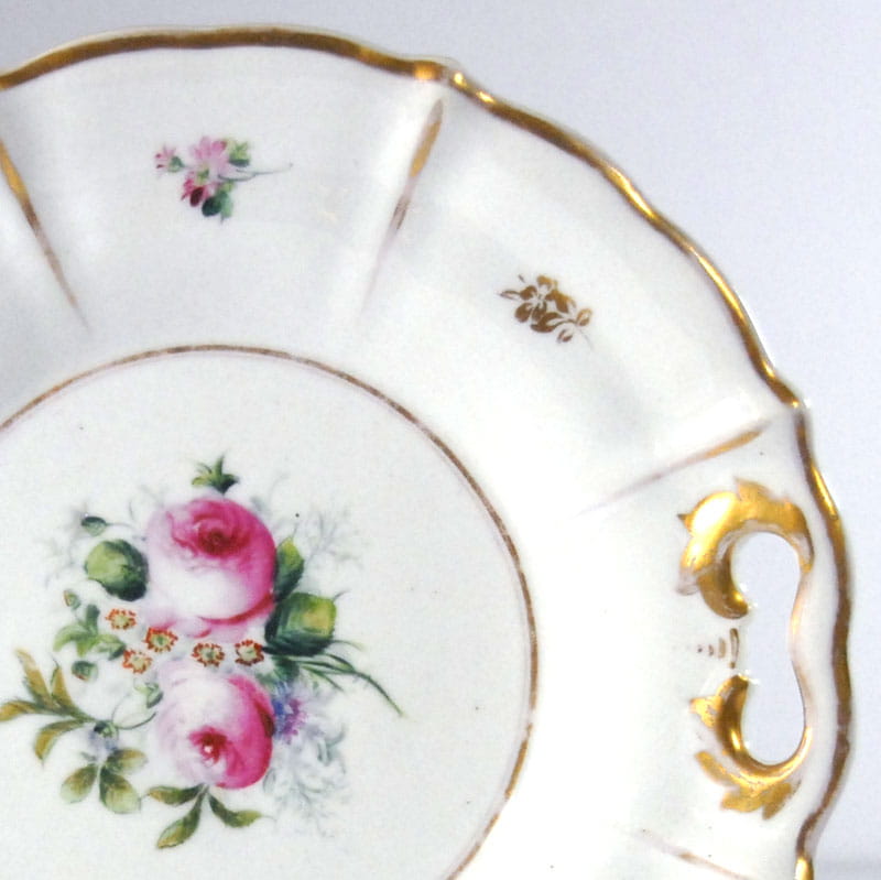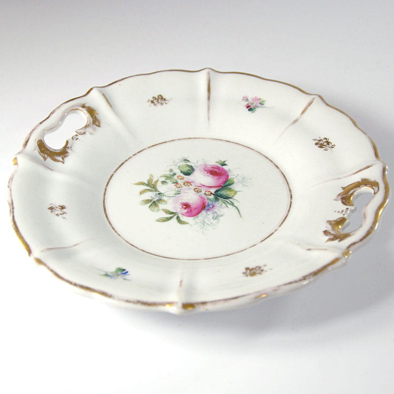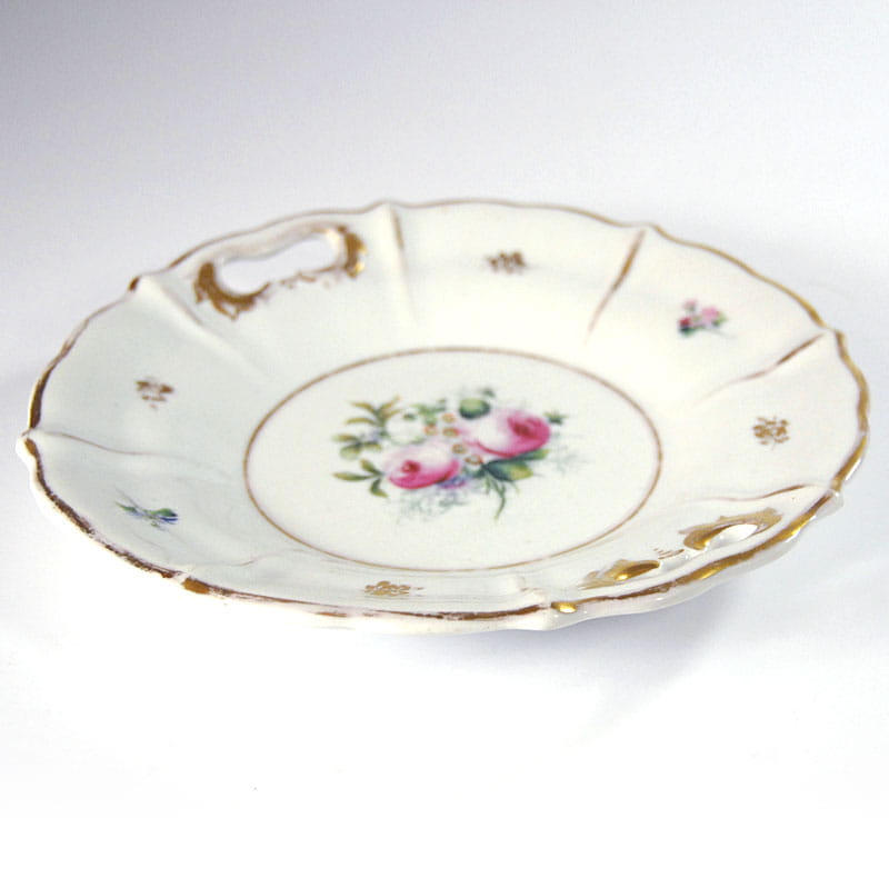 Spora, efektowna patera zrobiona z białej porcelany. Ręcznie zdobiona kwiatowym motywem dekoracyjnym. Lekko złocona. Pochodzi z królewskiej manufaktury Bing & Grondahl w Kopenhadze z połowy XIX wieku. Sygnowana. Ślady używnia głównie w postaci przetarcia złoceń i dekoracji malarskiej. Średnica: 29 cm. Wysokość: 4 cm.