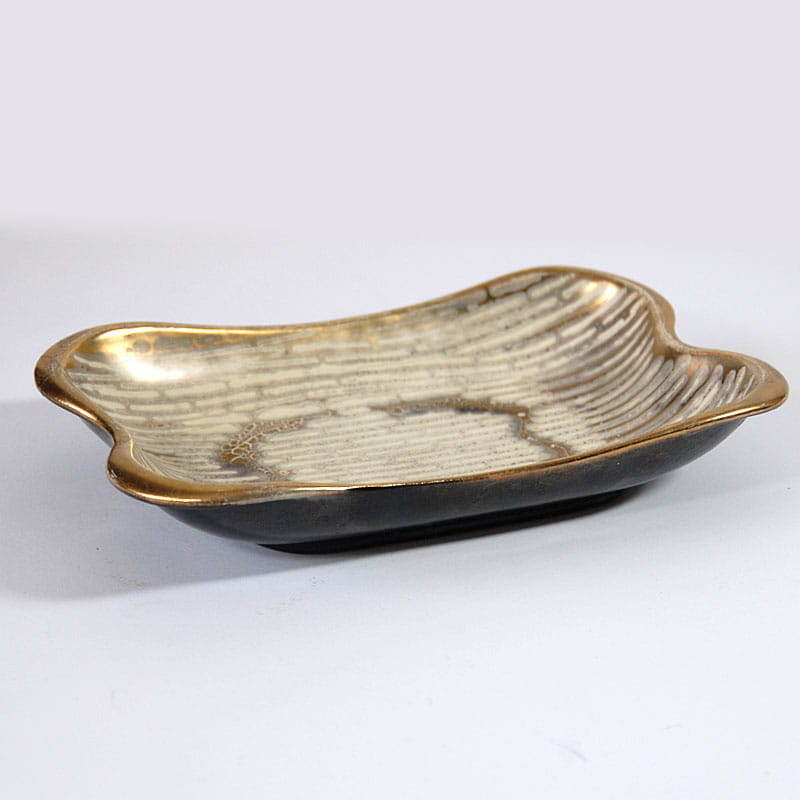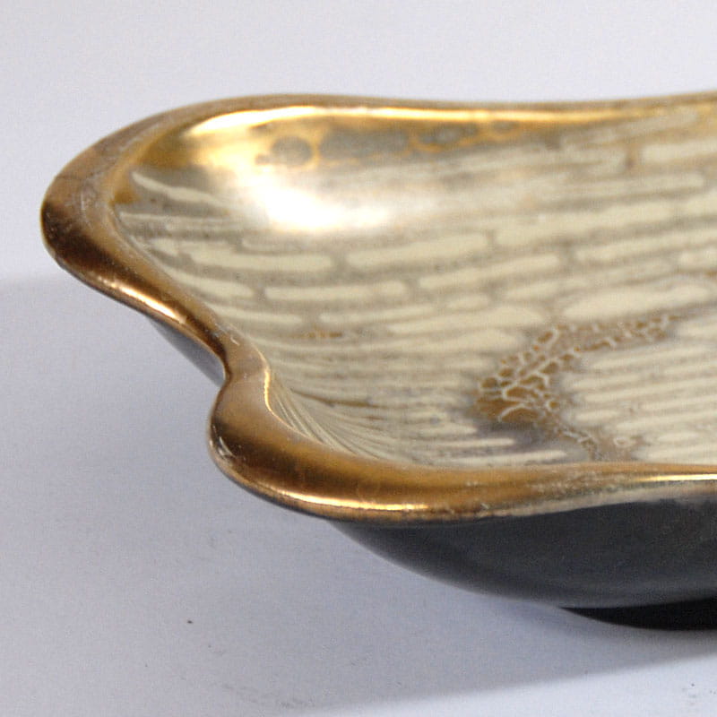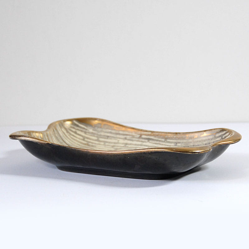 Dekoracyjna, ceramiczna misa/patera w pięknej formie. Szkliwiona w lekkim macie i złocona. Wyprodukowana w Niemczech przez firmę Carstens. Sygnowana numerycznie. Przedmiot oryginalny z lat sześćdziesiątych XX wieku. Wysokość: ok. 4 cm. Szerokość w najszerszym miejscu: ok. 25 cm.