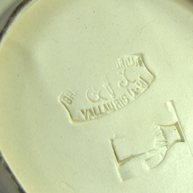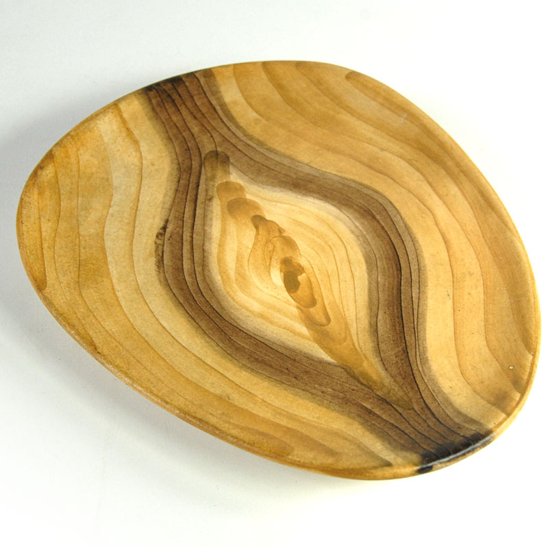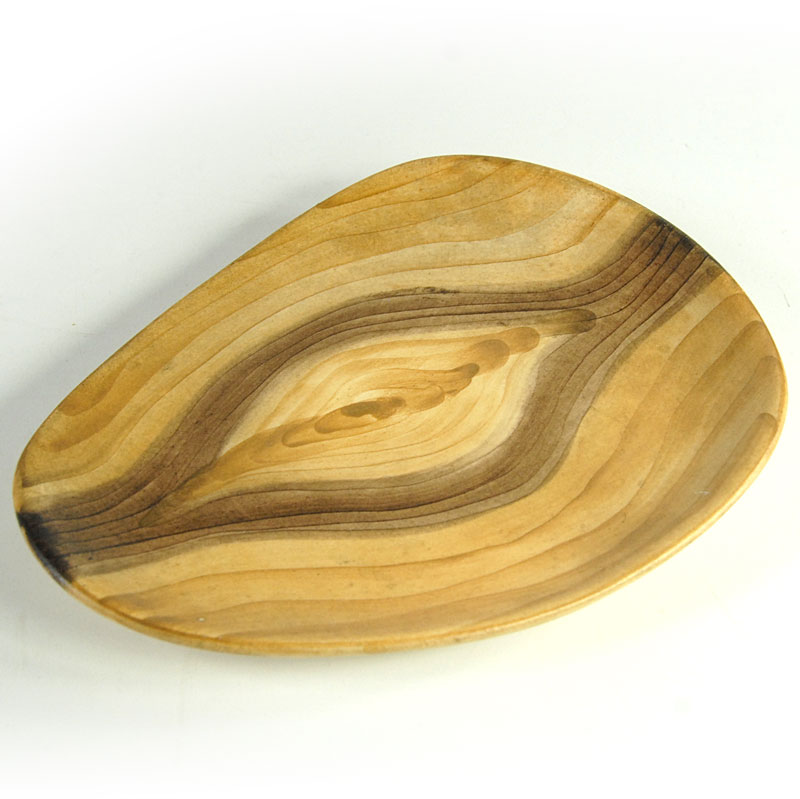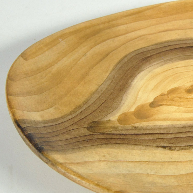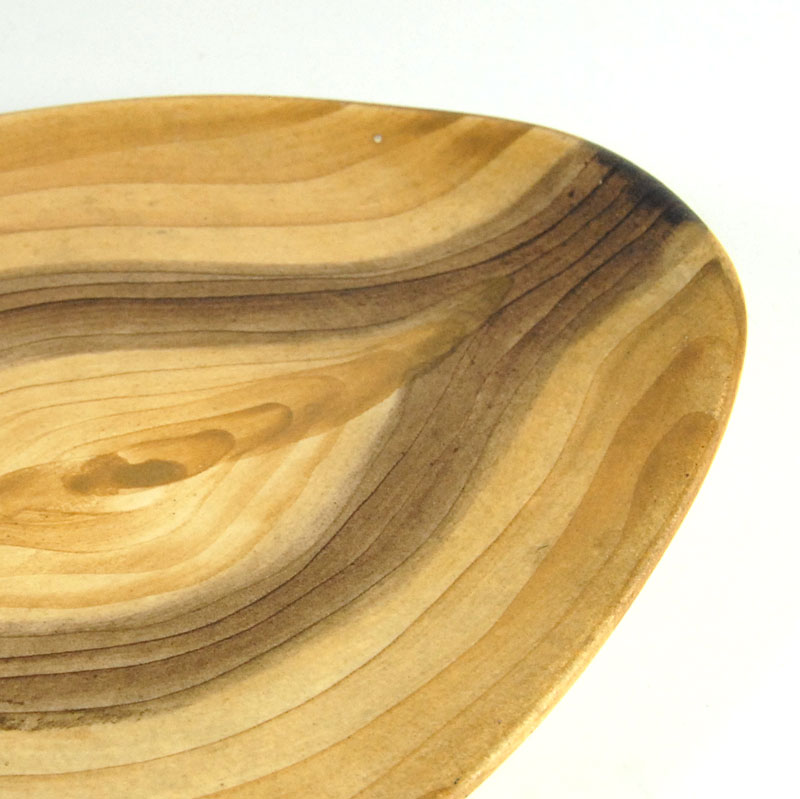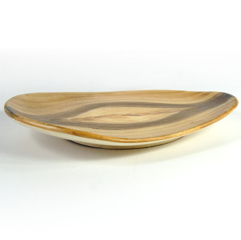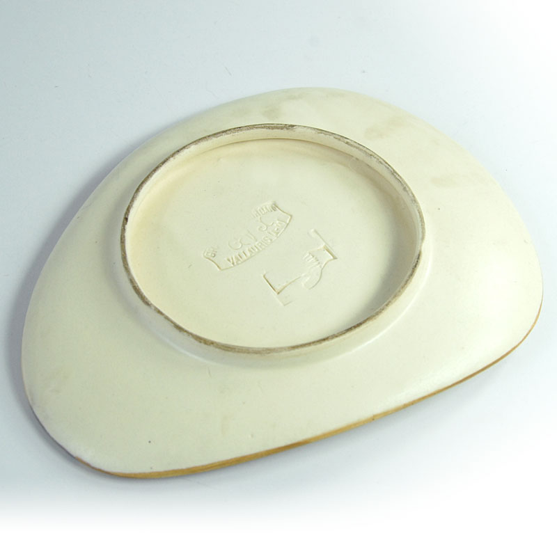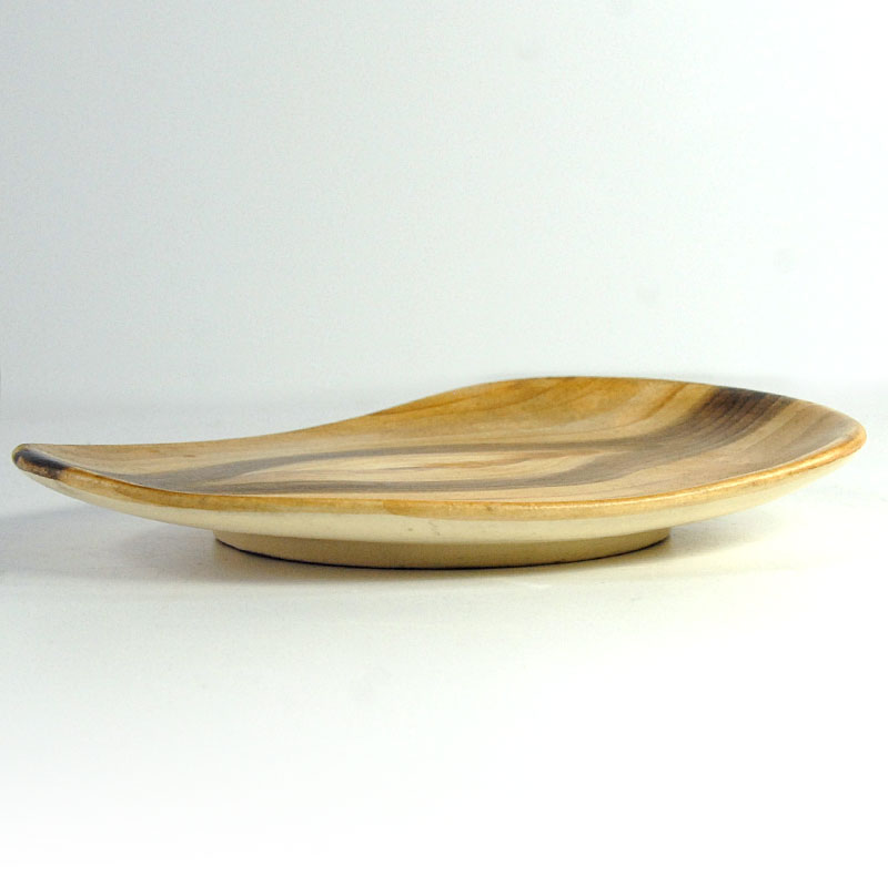 Bardzo efektowna patera ceramiczna pochodzący z francuskiej wytwórni Grandjean-Jourdan, która znajdowała się w Vallauris. Została zaprojektowana tak, że jej wzór do złudzenia przypomina fakturę drewna. Patera jest ręcznie malowana. Sygnowana znakiem wytwórni. Pochodzi z lat sześćdziesiątych XX wieku. Wymiary: 19 x 15 cm. Wysokość: 3 cm.