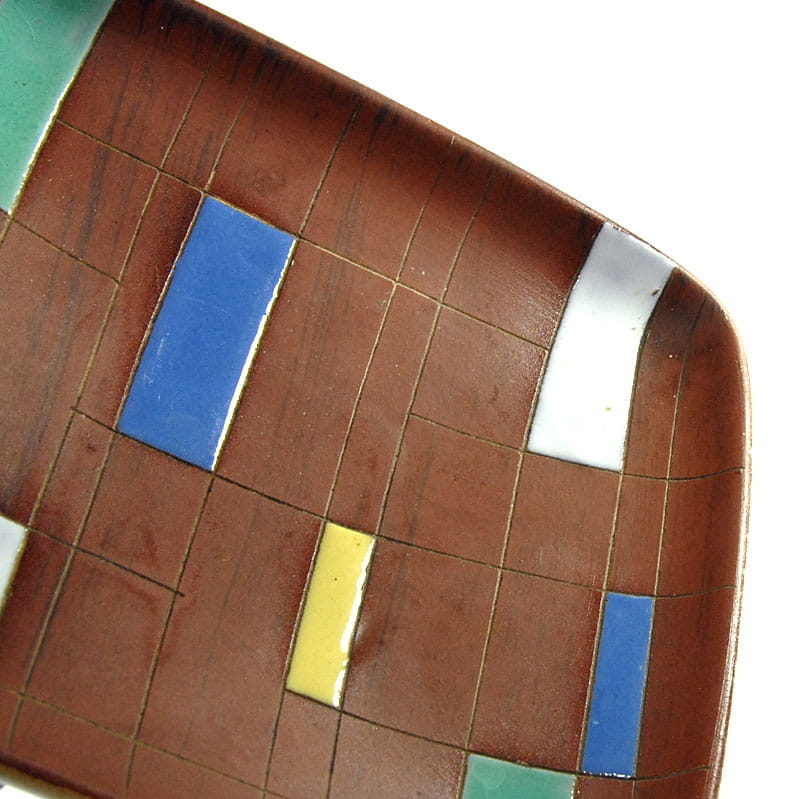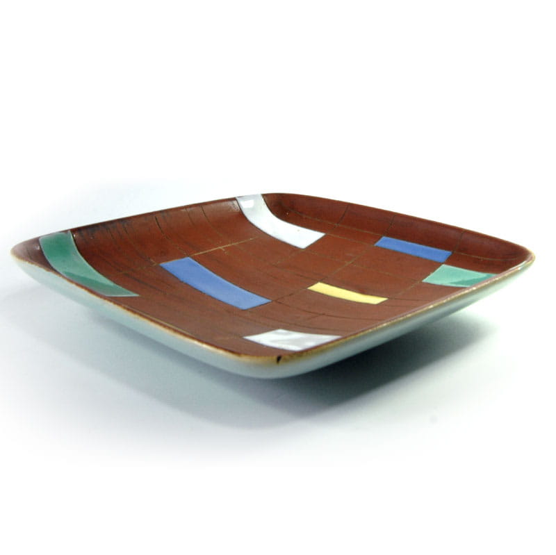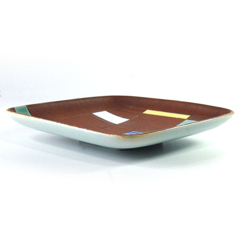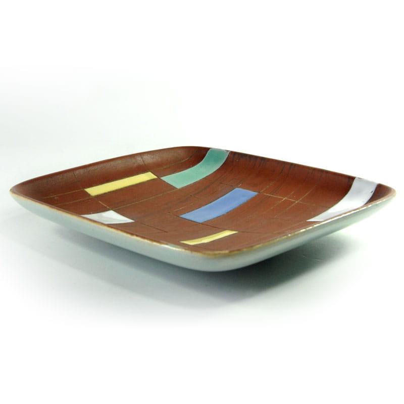 Piękna, efektowna patera ceramiczna zdobiona szkliwem matowym oraz miejscowo mocno błyszczącym. Sygnowana: W. Germany oraz numerycznie. Wyprodukowana w Niemczech Zachodnich przez firmę Carstens. Przedmiot oryginalny z lat sześćdziesiątych XX wieku. Zachowana w bardzo dobrym stanie z niewielkimi śladami używania. Wymiary: 22,5 x 22,5 x 3,5 cm.