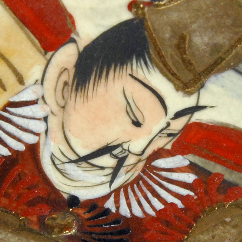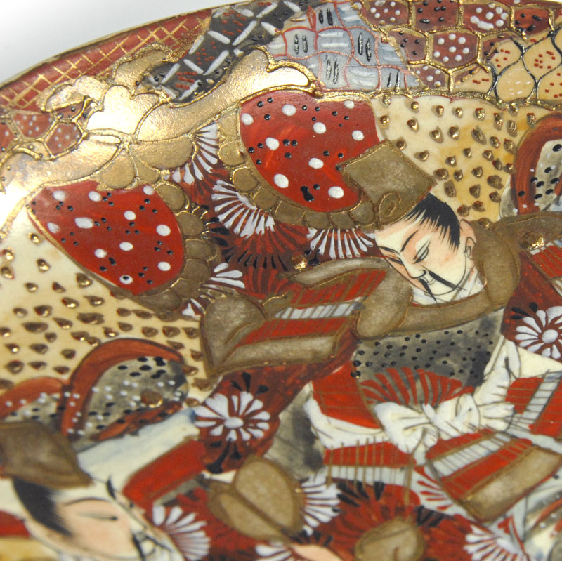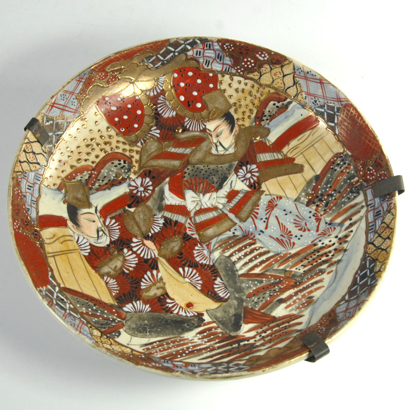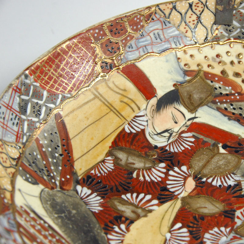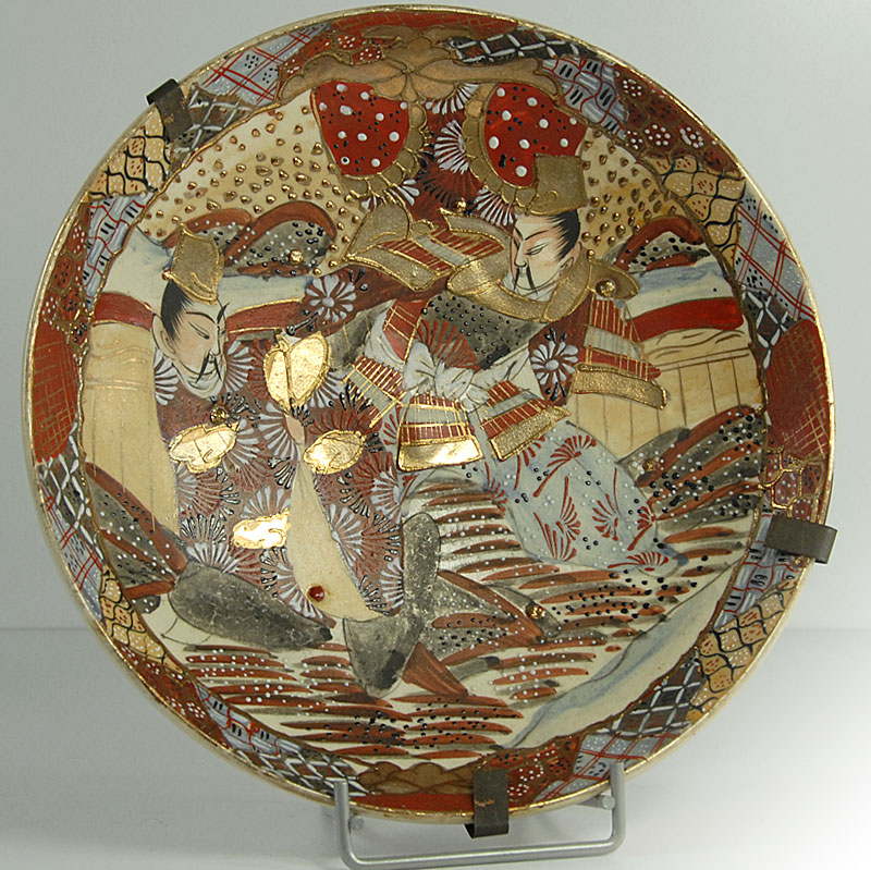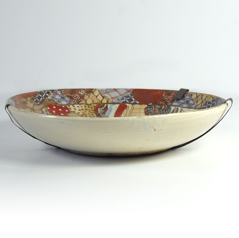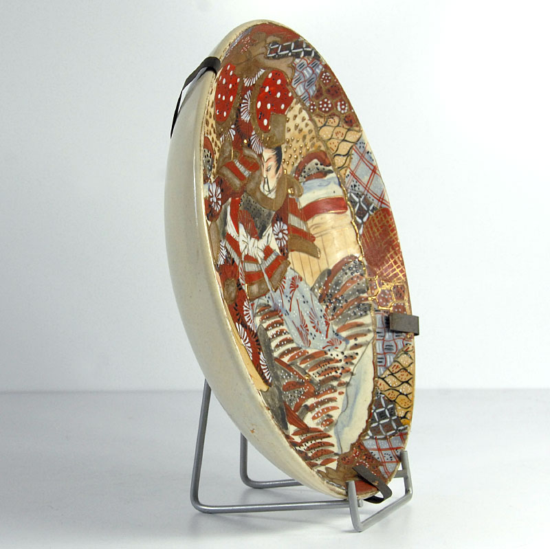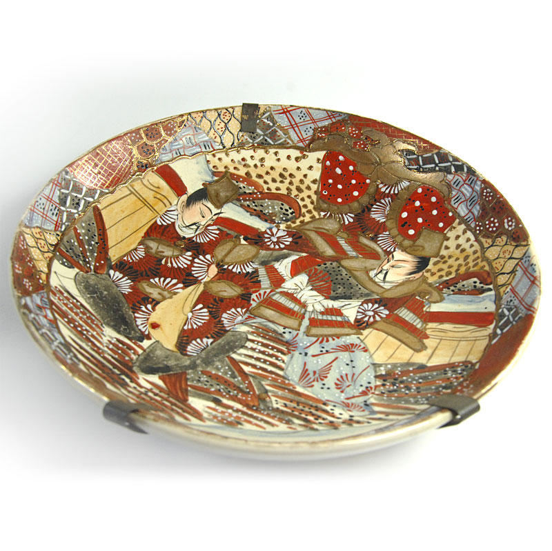 Piękna, bardzo dekoracyjna patera lub misa w typie Satsuma. Zrobiona jest z japońskiego fajansu. Gęsty ornament dekoracyjny jest w całości ręcznie malowany. Dodatkowo patera jest dekorowana grubą, kolorową emalią oraz efektownymi złoceniami. Pochodzi z Japonii z XIX wieku. Zachowana jest w bardzo dobrym stanie. Patera wyposażona jest w stary uchwyt umożliwiający zawieszenie. Średnica: 25 cm. Wysokość: 4 cm.