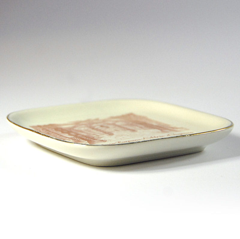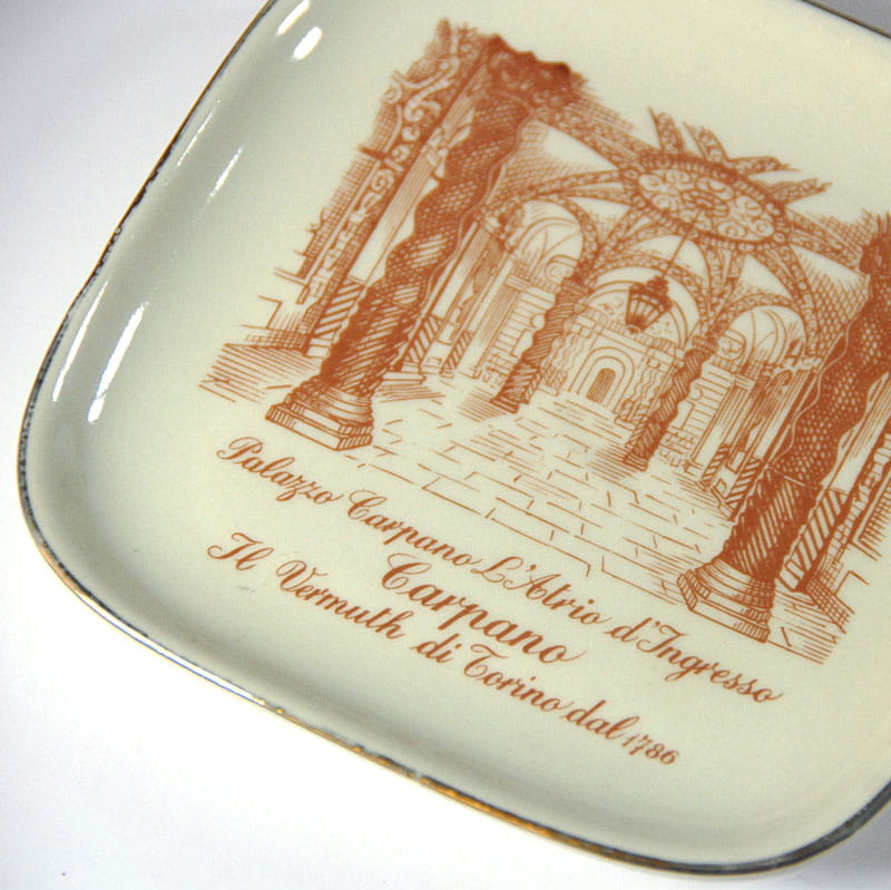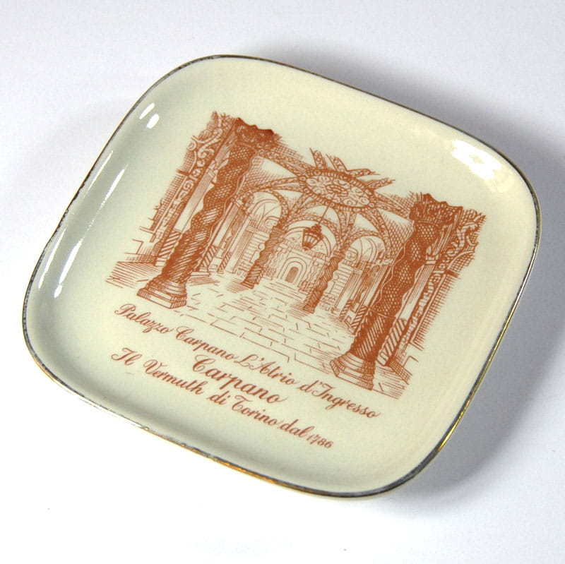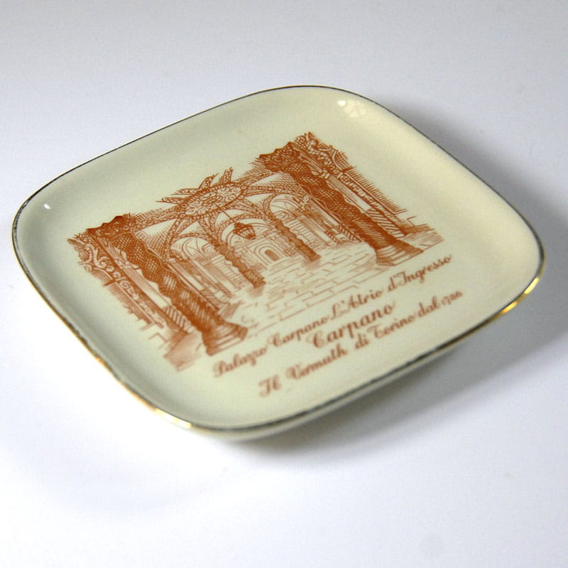 Nieduża, porcelanowa paterka reklamowa pochodząca z wytwórni Richarda Ginori w Sesto Fiorentino pod Florencją. Paterka w kolorze lekko kremowym z nadrukiem Palazzo Carpano. Delikatne przetarcia złocenia na krawędzi. Wymiary: 12,5 x 12,5 cm. Wysokość: 2 cm.