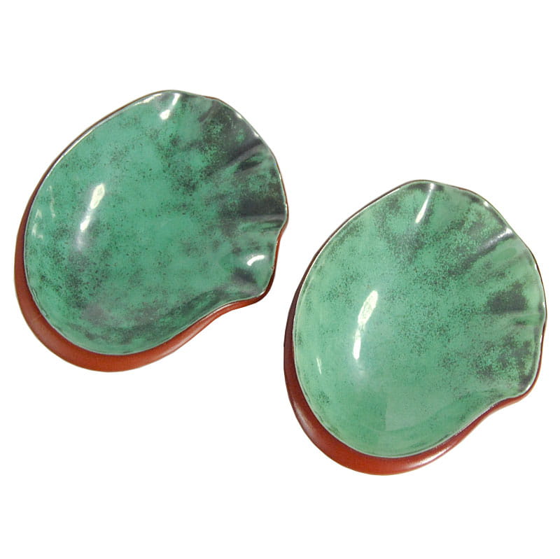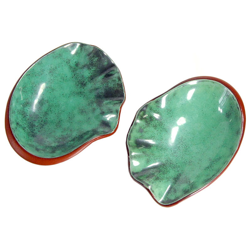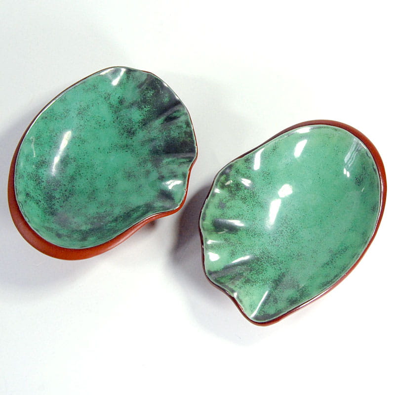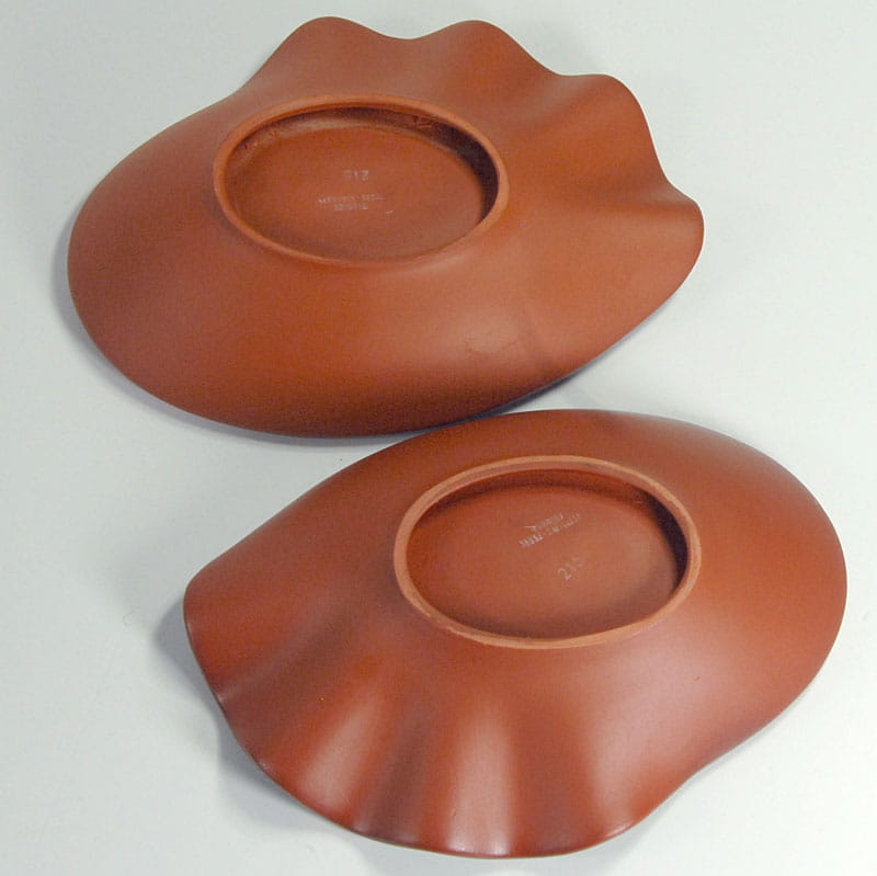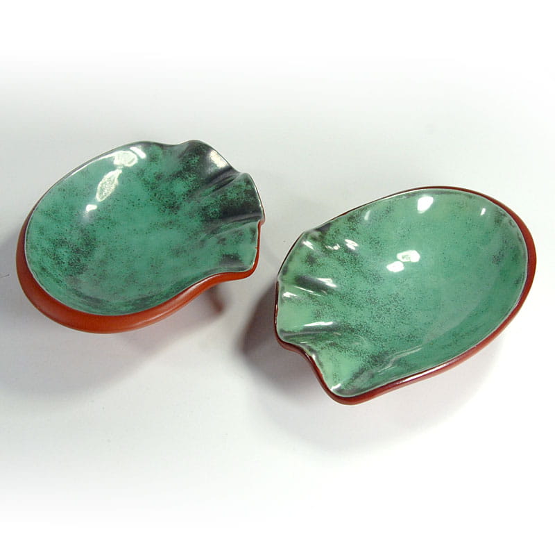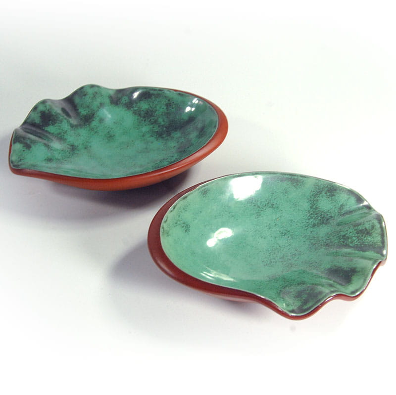 Dwie niewielkie paterki zrobione z ceramiki "terra sigillata". Szkliwione od strony wewnętrznej. Wyprodukowane w pracowni Wormster. Pochodzą z Niemiec z lat siedemdziesiątych XX wieku. Sygnowane. Zachowane w bardzo dobrym stanie. Wymiary: 16 x 11,5 x 3,5 cm.