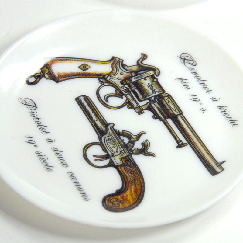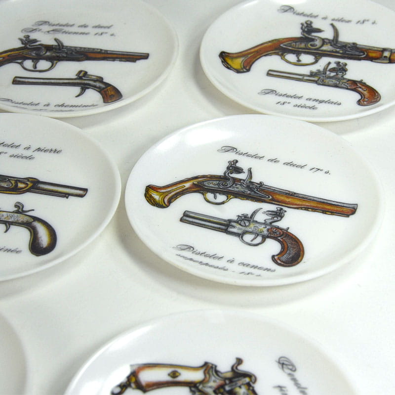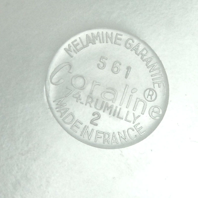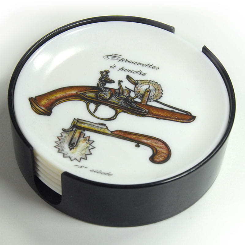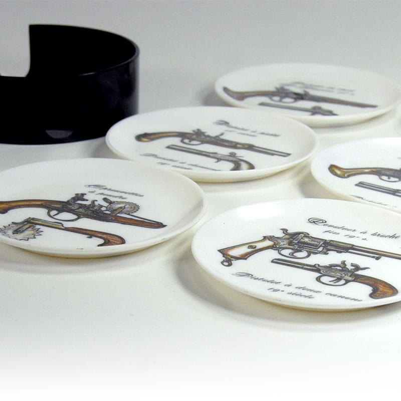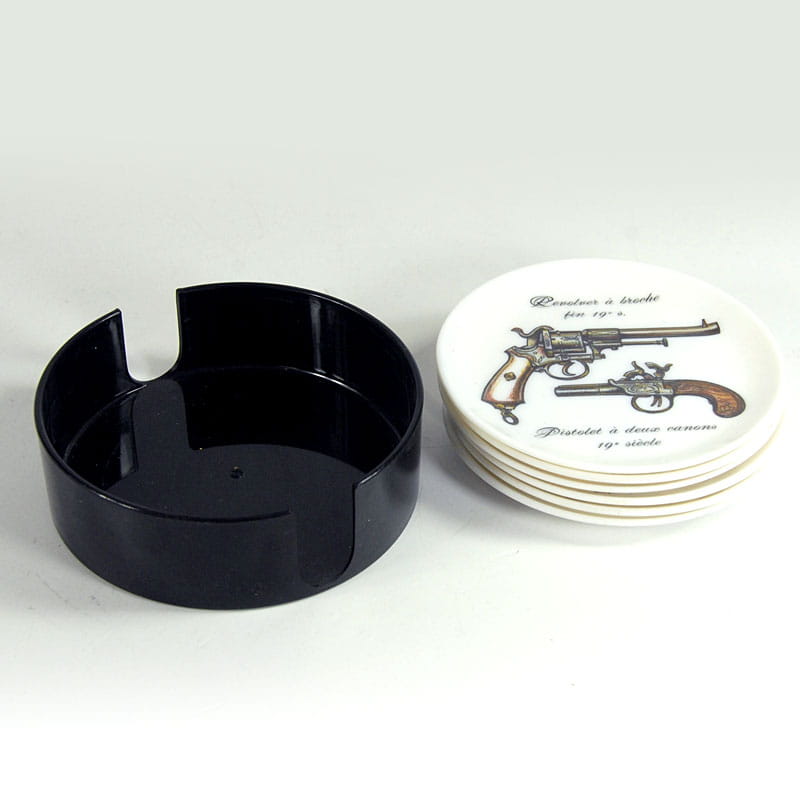 Zestaw sześciu podstawek pod kubki/kieliszki/szklanki zrobionych z melaminy wraz z praktycznym pojemnikiem. Zaprojektowane i wykonane we Francji. Pochodzą z wytwórni Coraline z lat sześćdziesiątych XX wieku. Zachowane są w bardzo dobrym stanie z niewielkimi śladami używania. Średnica: 10 cm.