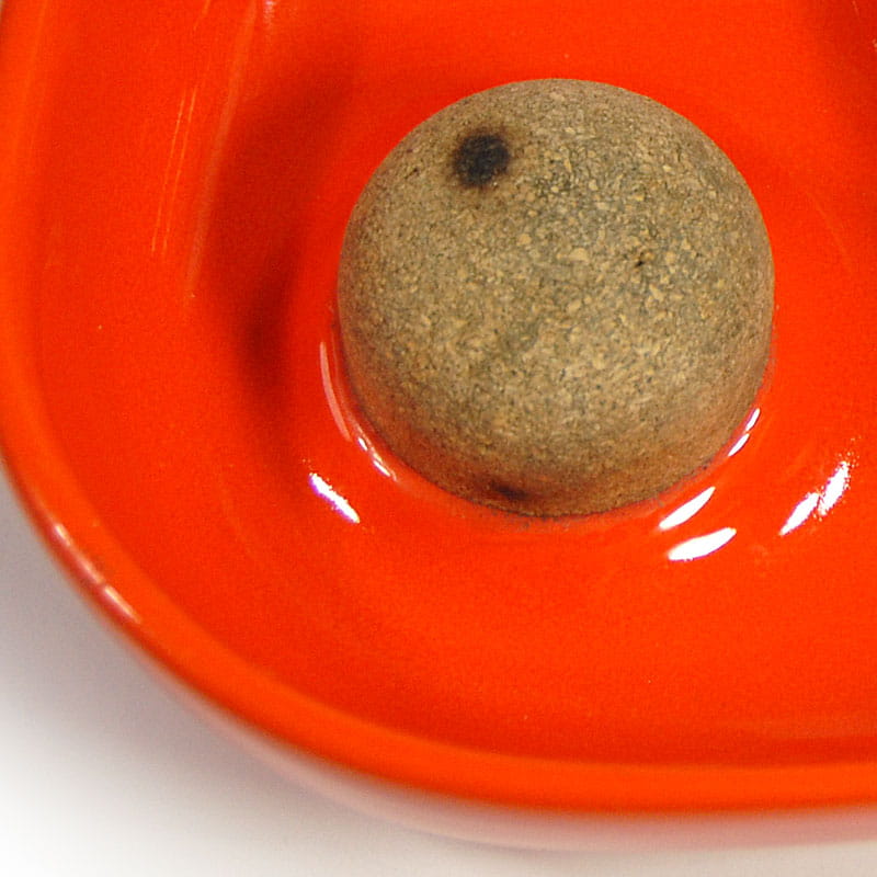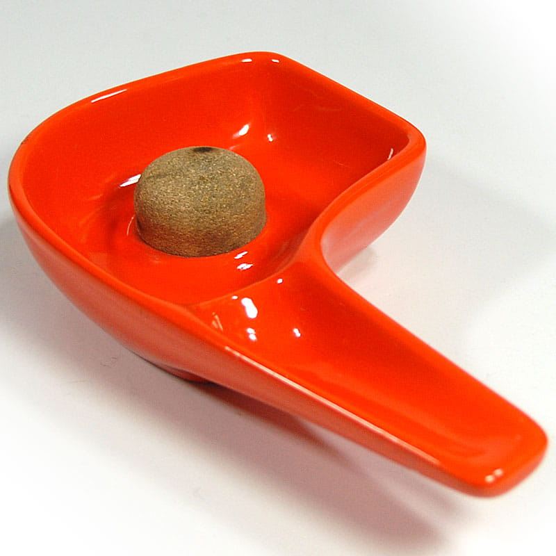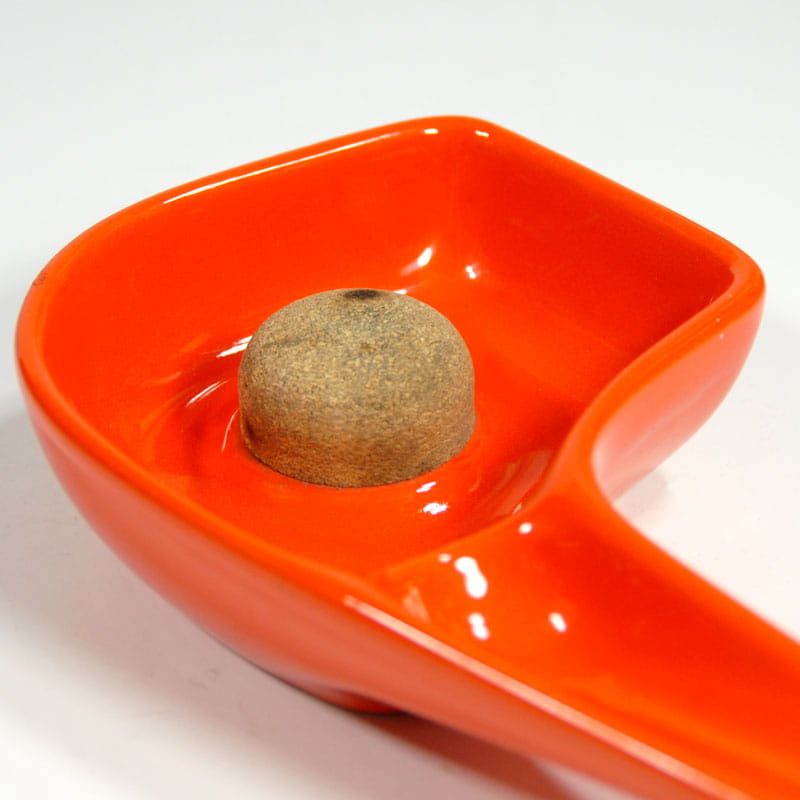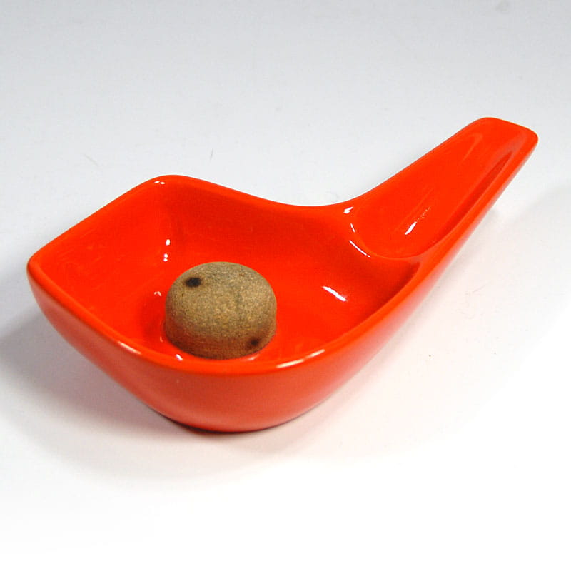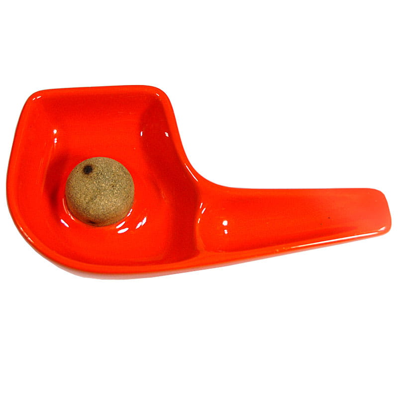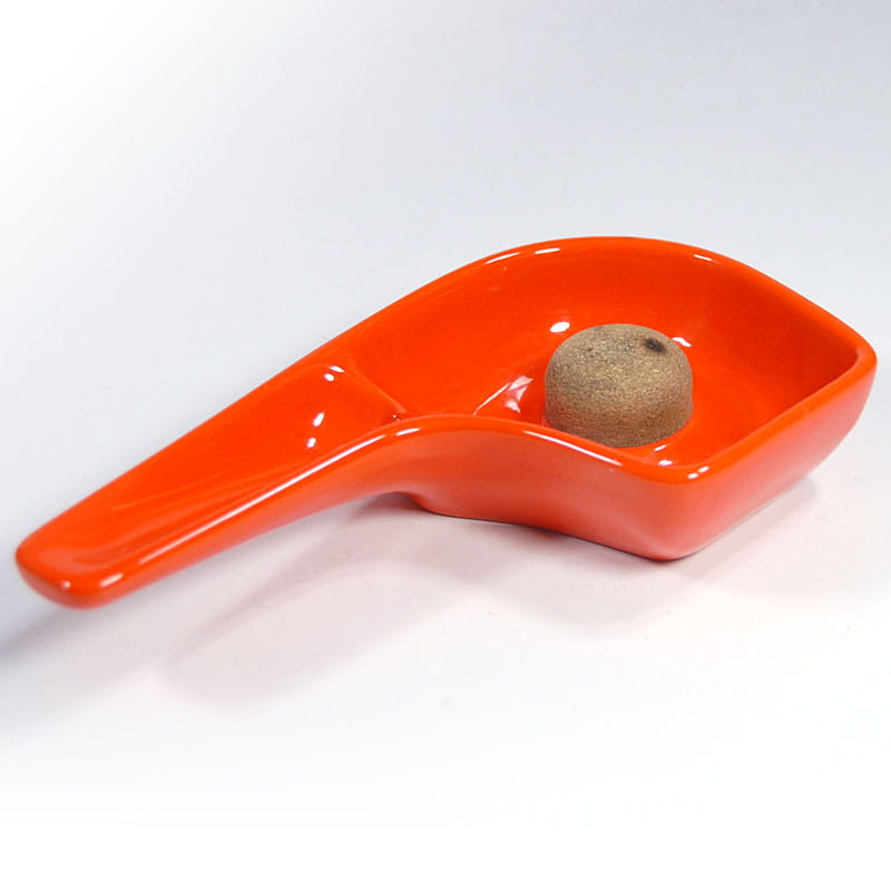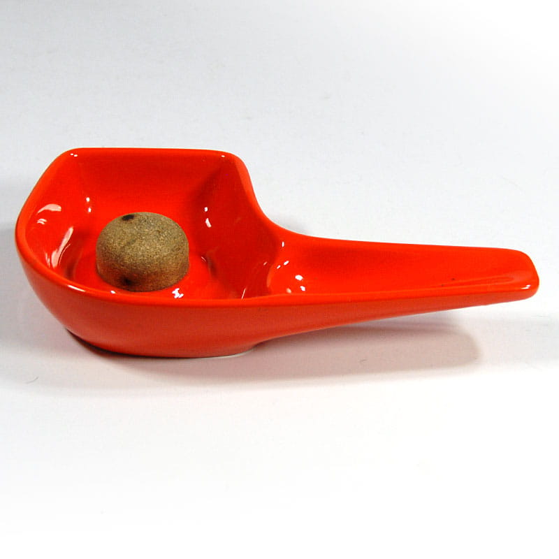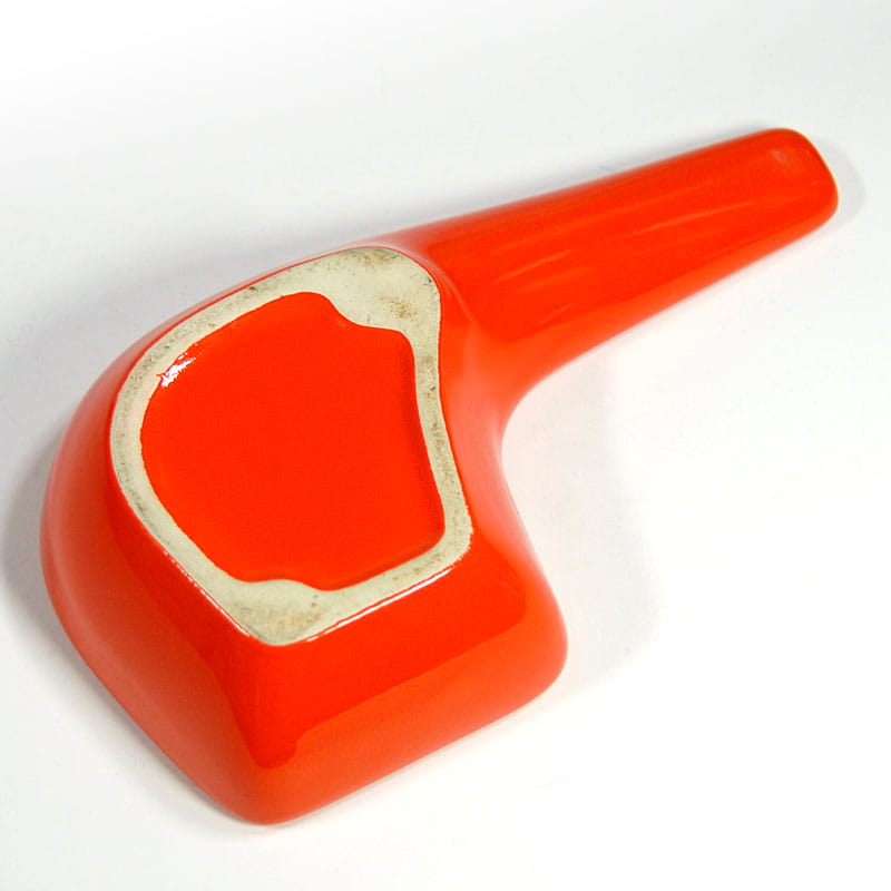 Dekoracyjna, ceramiczna popielnica dla palacza fajki. Szkliwiona w intensywnie pomarańczowym kolorze. Pochodzi z Włoch, z lat siedemdziesiątych/osiemdziesiątych XX wieku. Zachowana w bardzo dobrym stanie z niewielkimi śladami używania głównie na elemencie korkowym. Wymiary: 22 x 12 x 4 cm.