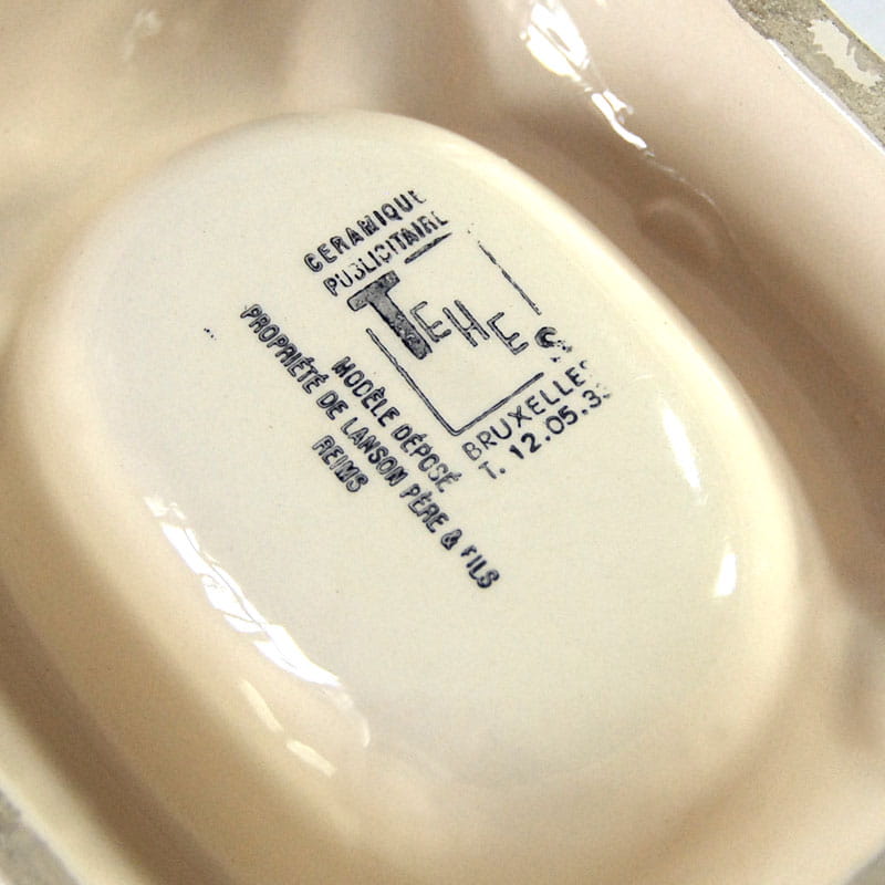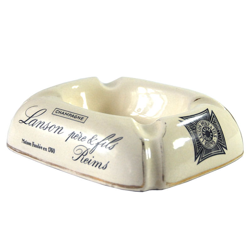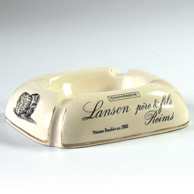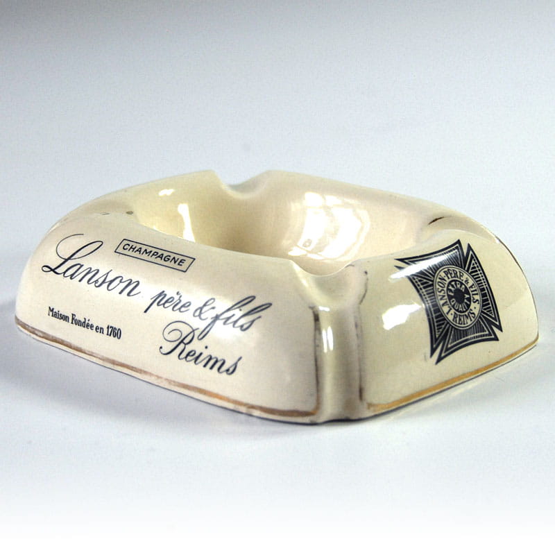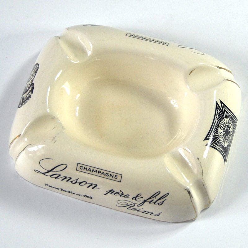 Duża fajansowa popielnica reklamowa. Wyprodukowana na zlecenie firmy Lanson pere & fils z Reims w Szampanii. Pochodzi z lat pięćdziesiątych XX wieku. Sygnowana. Lekkie slady używania, przetarcia nadruku. Wymiary: 16 x 13 x 4 cm.