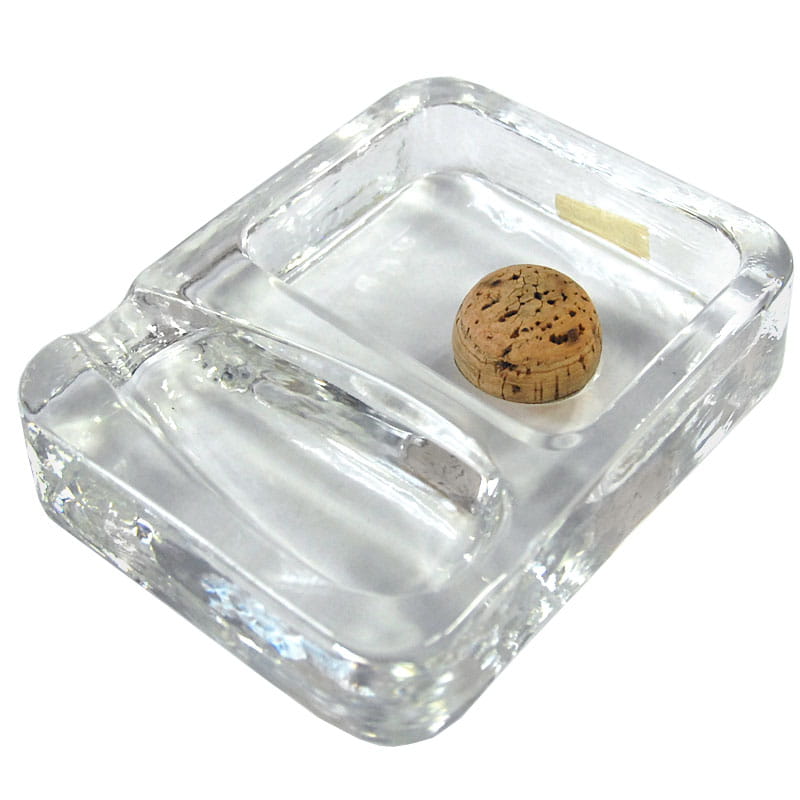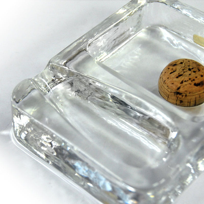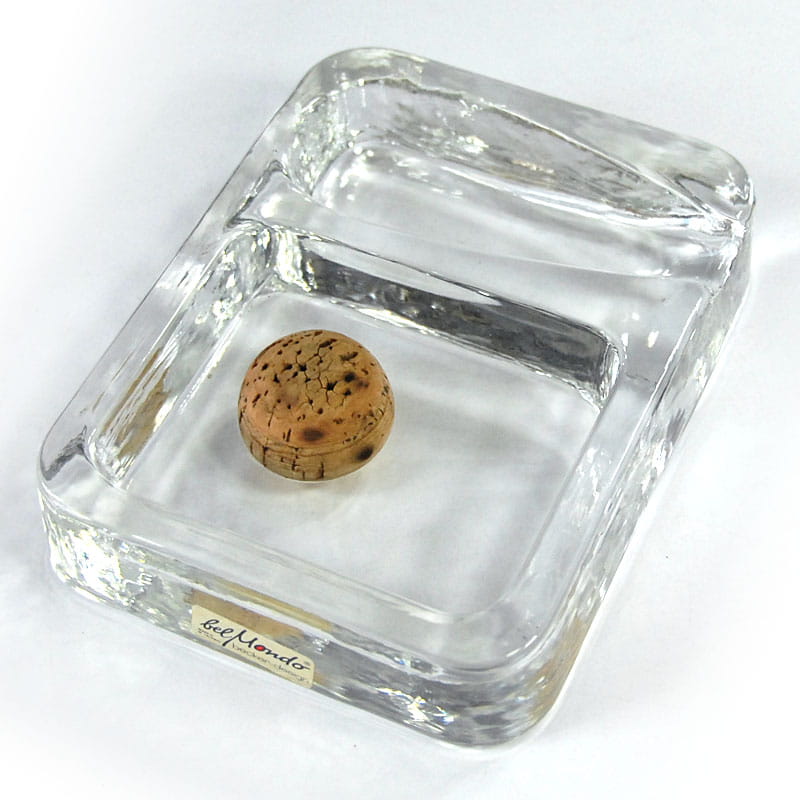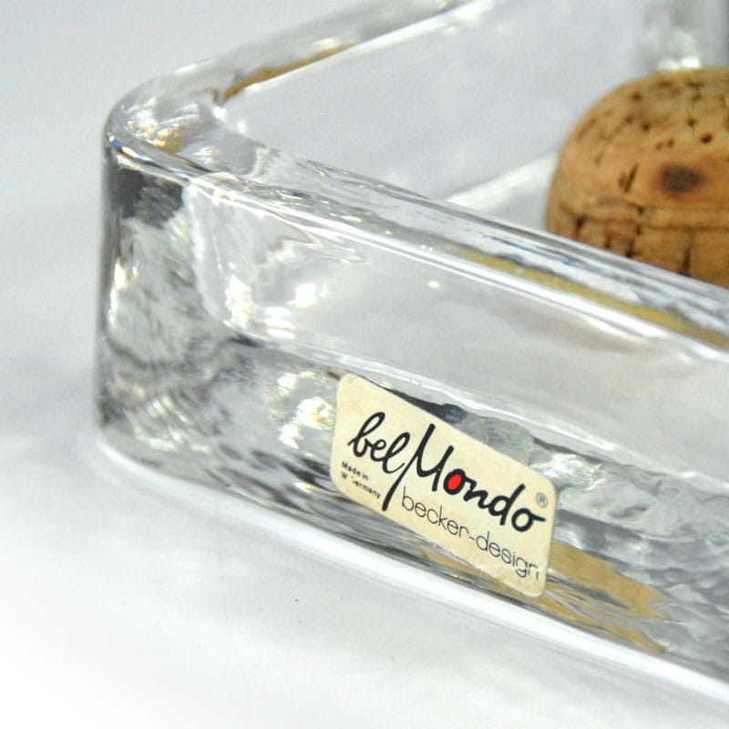 Duża popielnica Belmondo dla palacza fajki, zrobiona z przeźroczystego szkła prasowanego. Projekt Becker Design. Pochodzi z Niemiec z lat siedemdziesiątych XX wieku. Sygnatura na naklejce. Bardzo dobry stan zachowania z delikatnymi śladami używania. Wymiary: 16 x 12,5 4 cm.