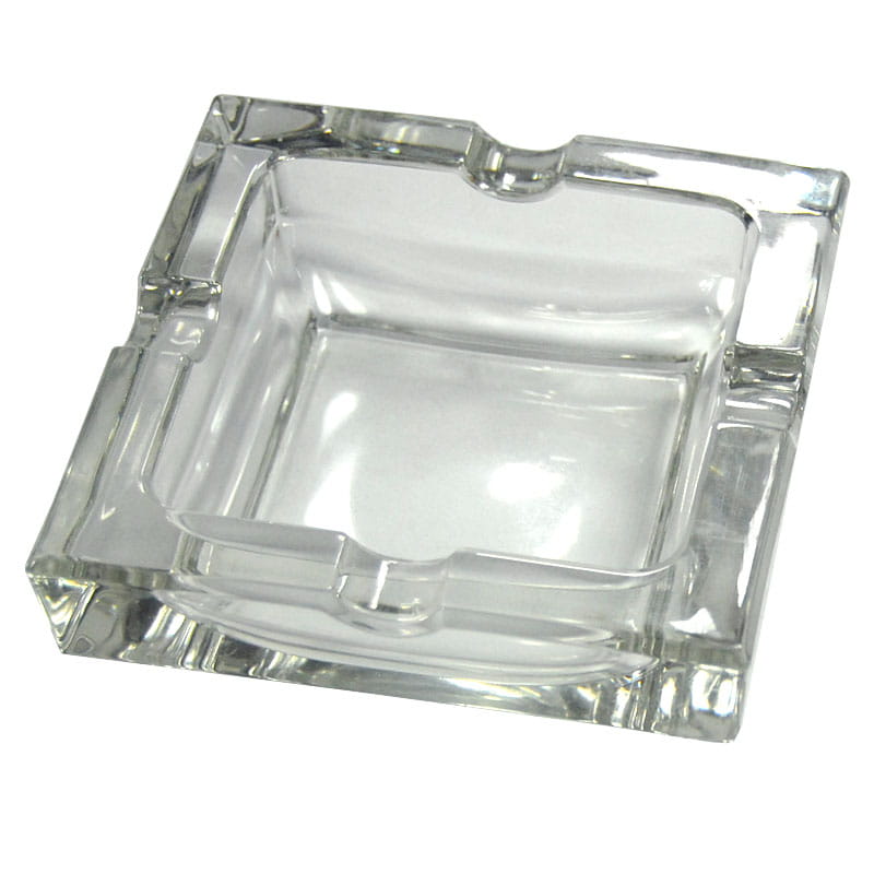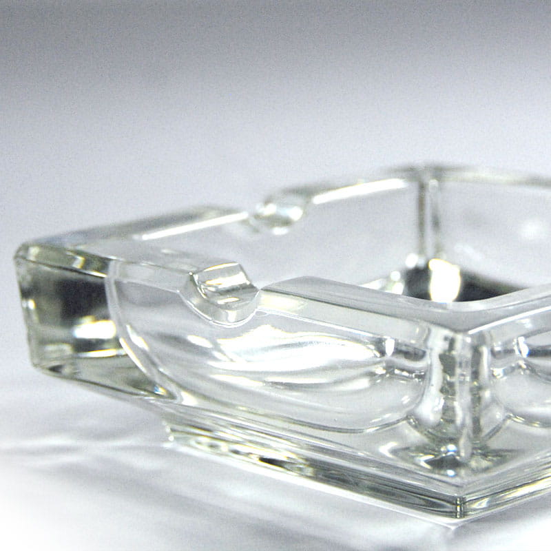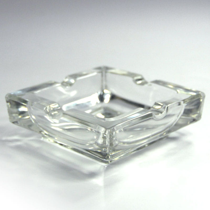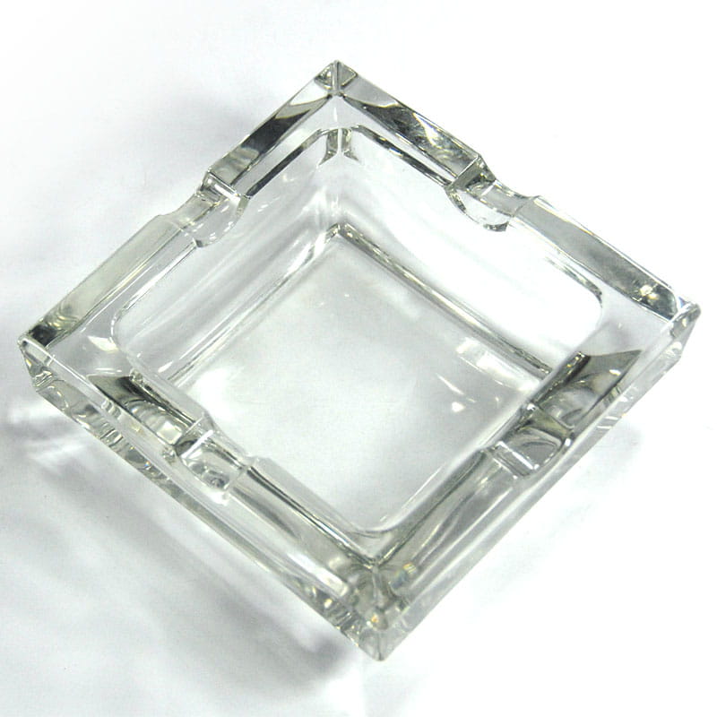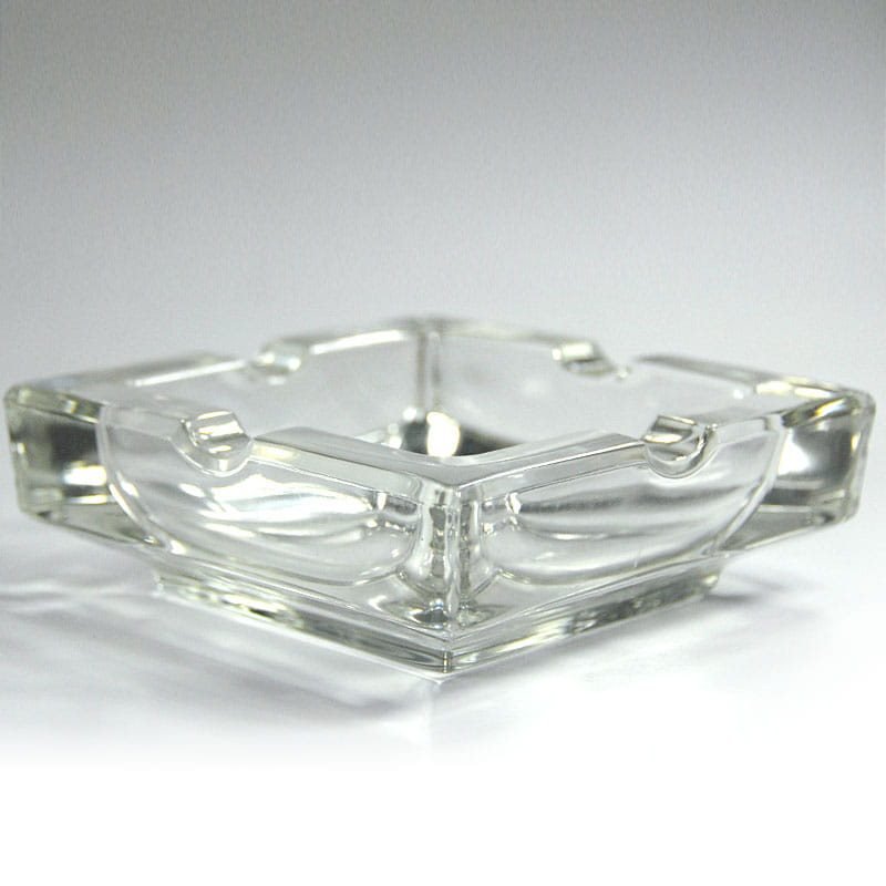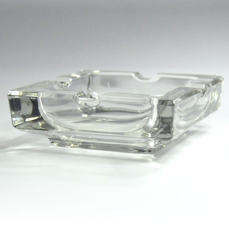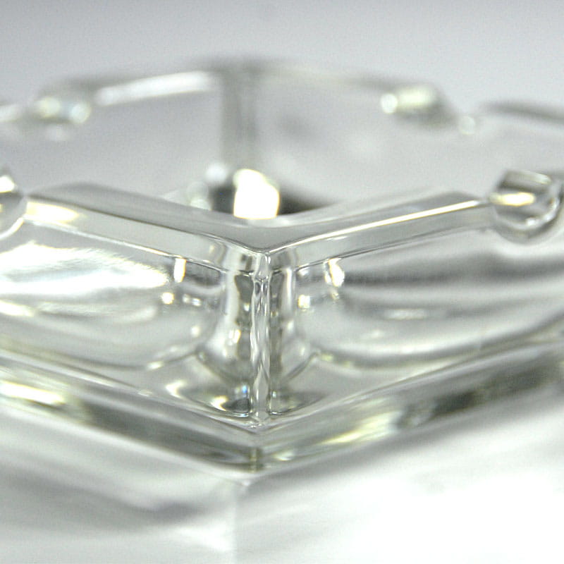 Gruba popielnica przeźroczystego szkła kryształowego. Zaprojektowana i wykonana we Francji w latach 70. Wymiary: 14 x 14 cm. Wysokość: 5 cm.