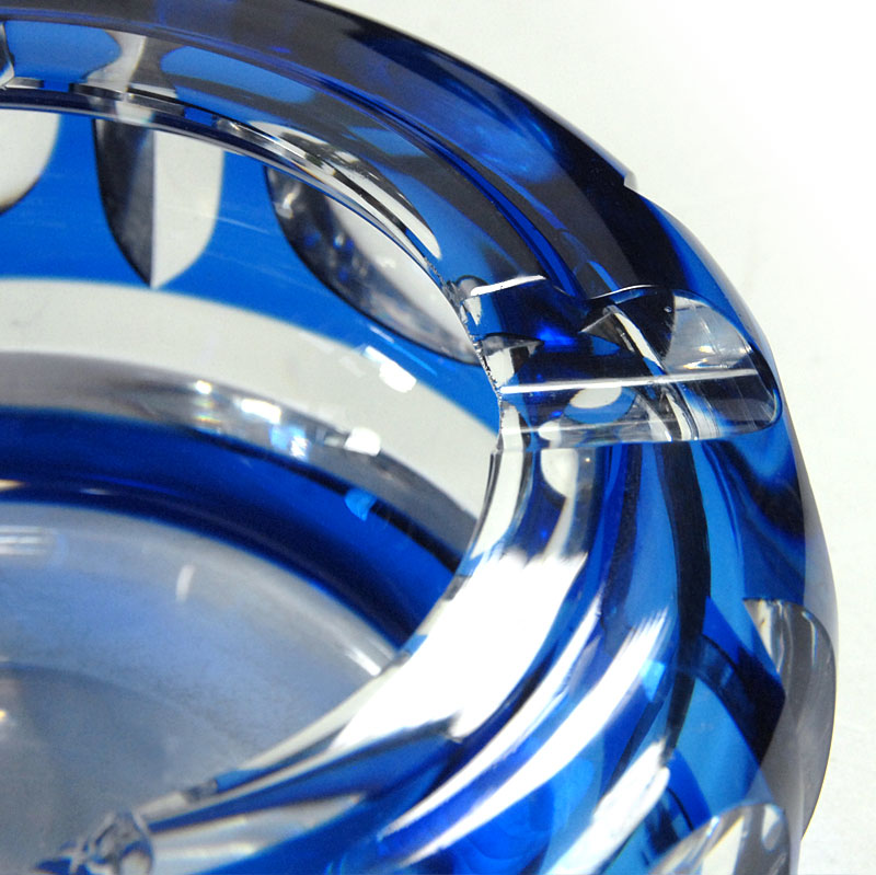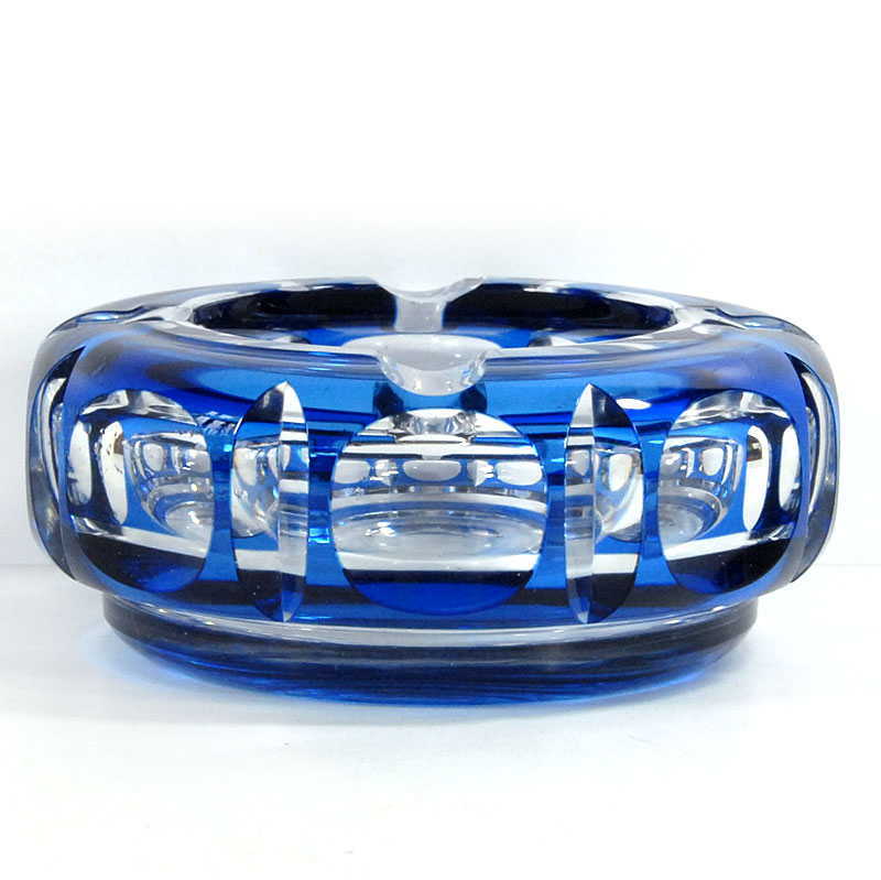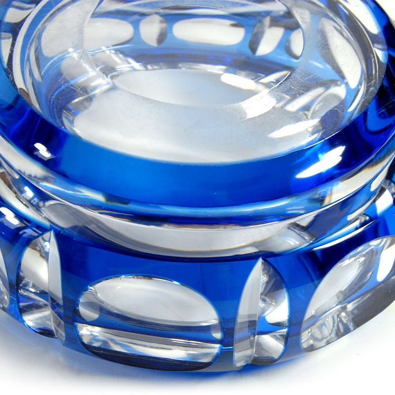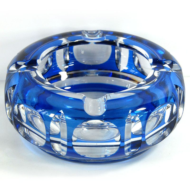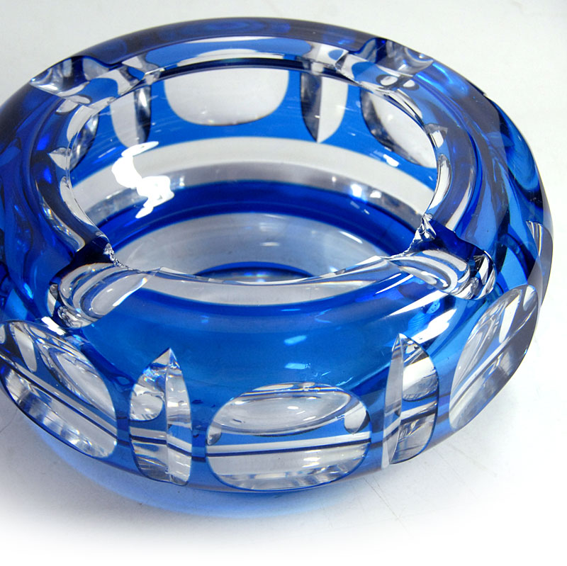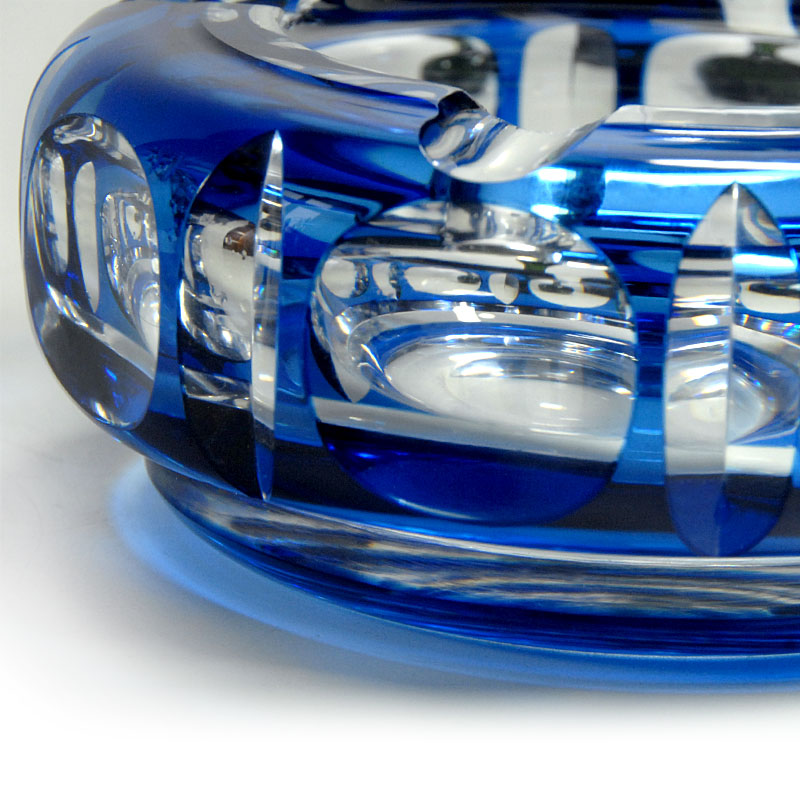 Duża, masywna popielnica ze szlifowanego szkła kryształowego w kolorze szafirowego granatu. Pochodzi z belgijskiej wytwórni Val St Lambert z lat trzydziestych XX wieku. Nosi ślady używania głównie w postaci zarysowań powierzchni i drobnych ubytków przy wewnętrznej krawędzi. Średnica: 16 cm. Wysokość: 6,5 cm.
