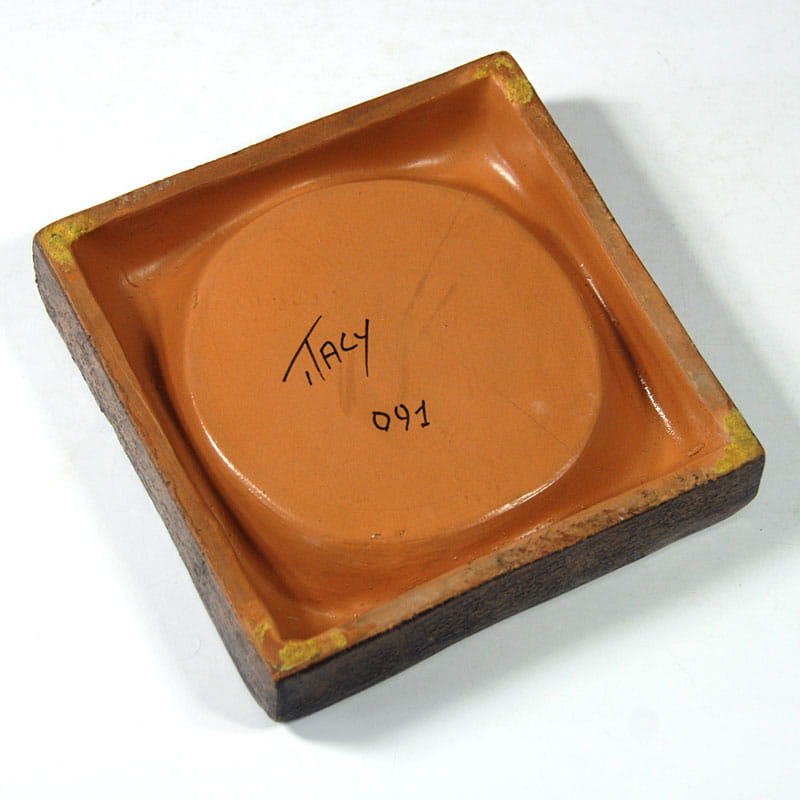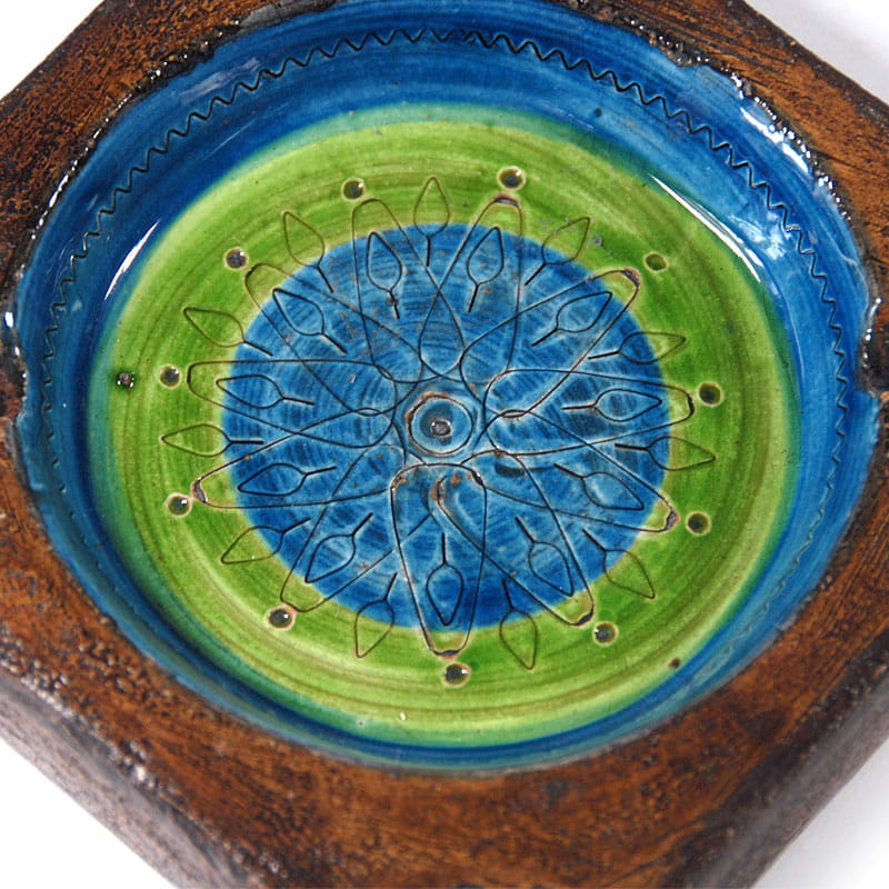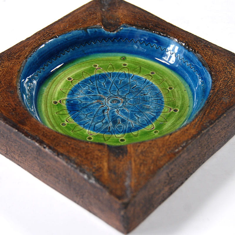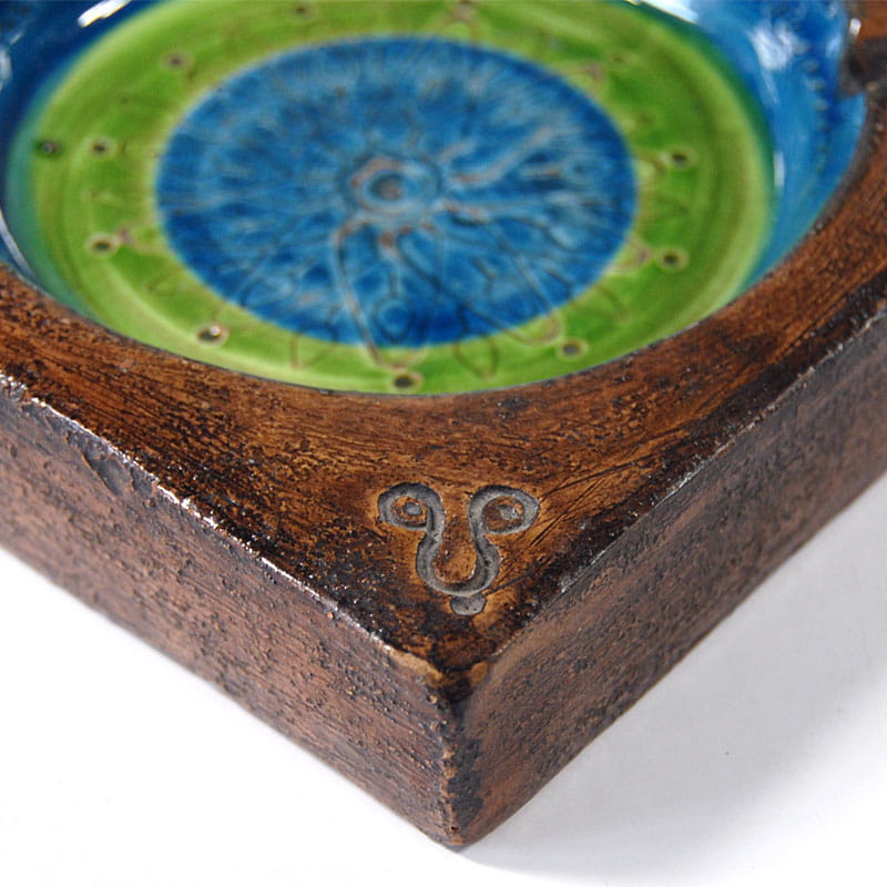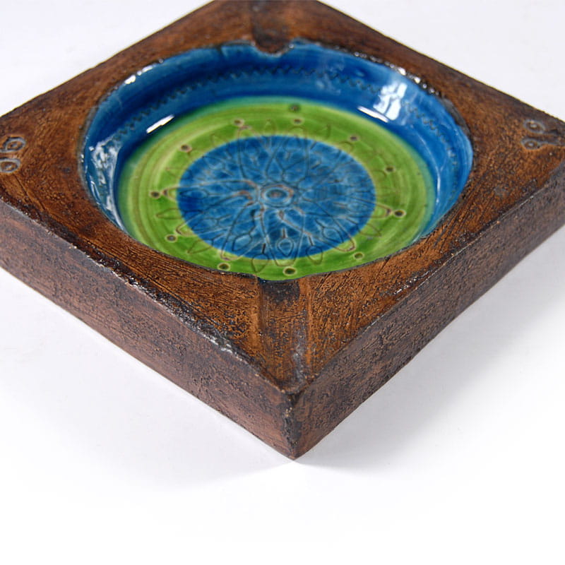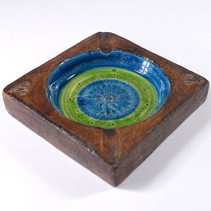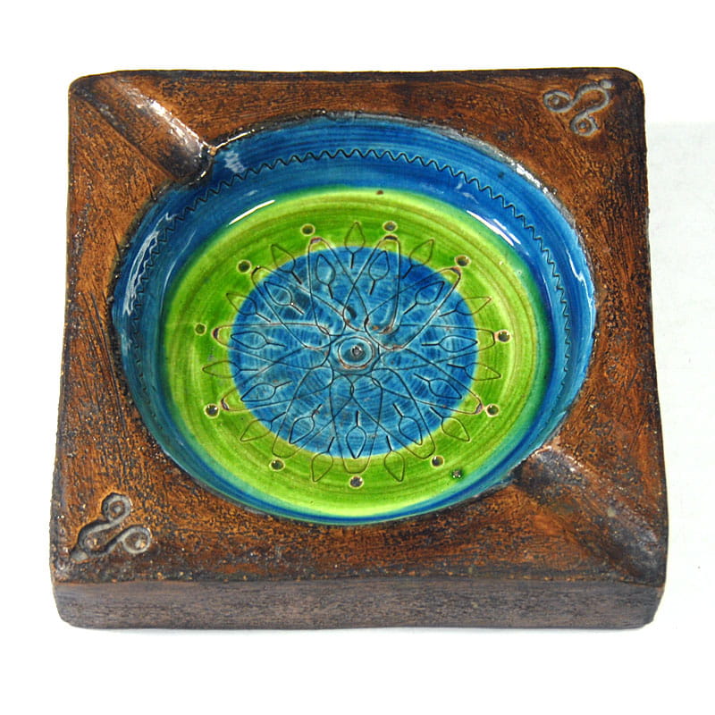 Ceramiczna popielnica, ręcznie dekorowana i wykończona szkliwem Rimini Blue. Projekt Aldo Londi dla Bitossi. Sygnowana. Unikat. Pochodzi z Włoch z lat sześćdziesiątych XX w. Bardzo dobry stan zachowania. Wymiary: 17 x 17 x 3,5 cm.