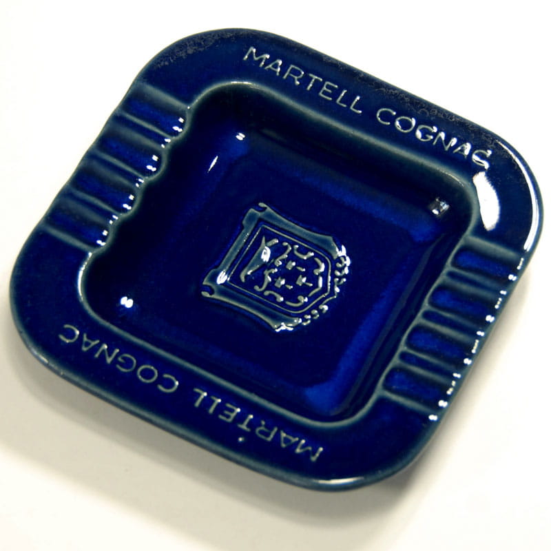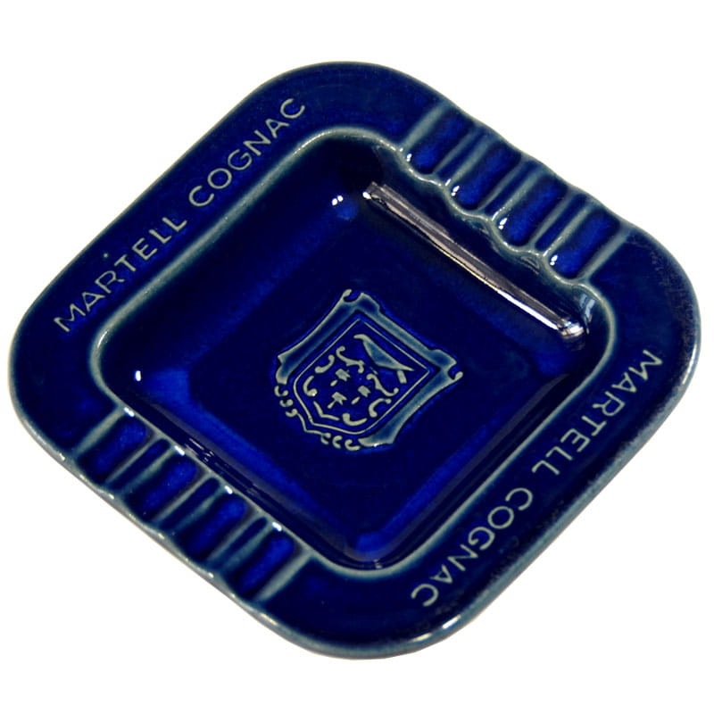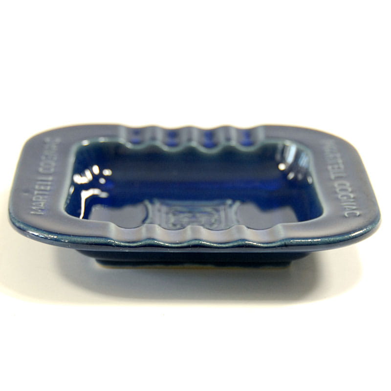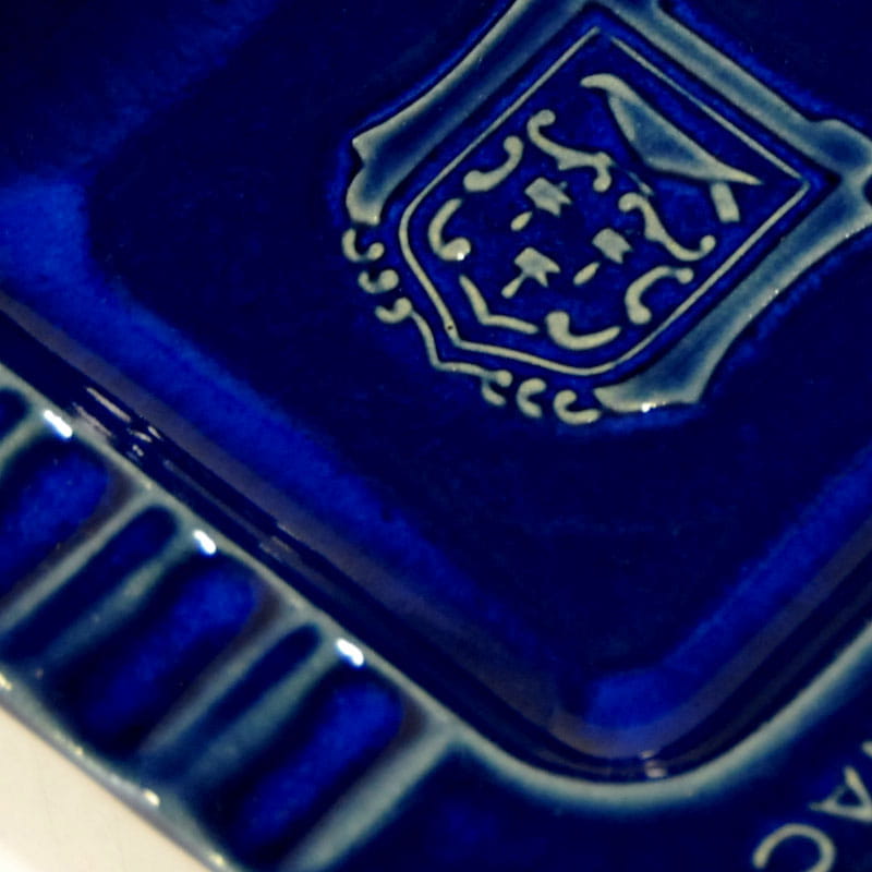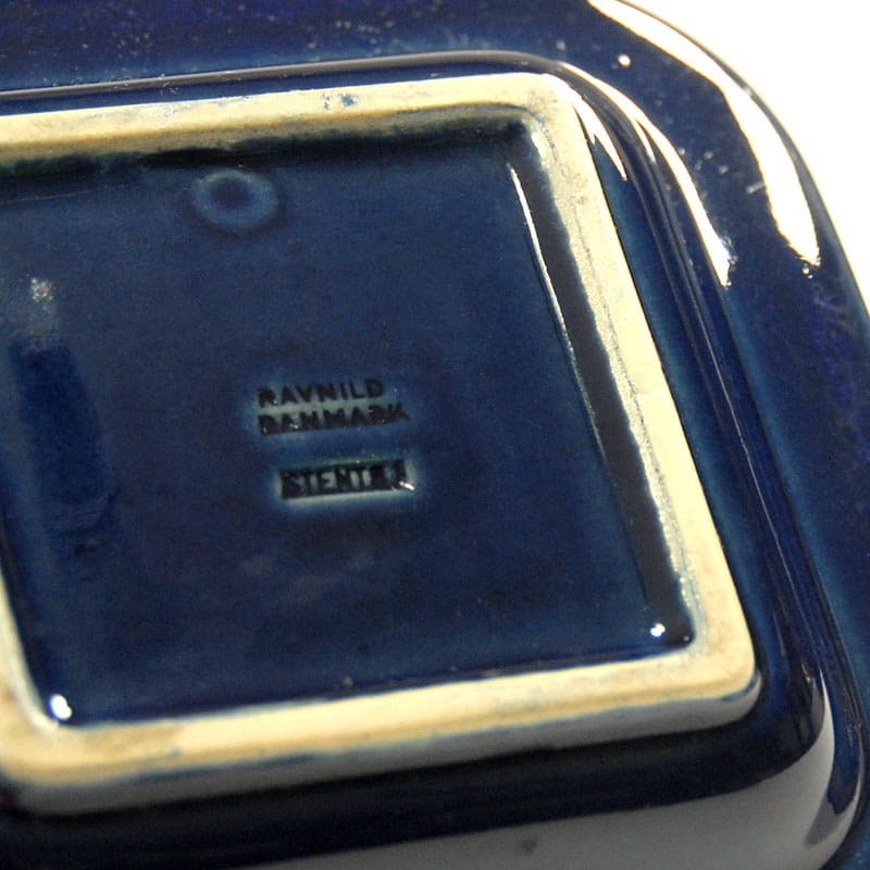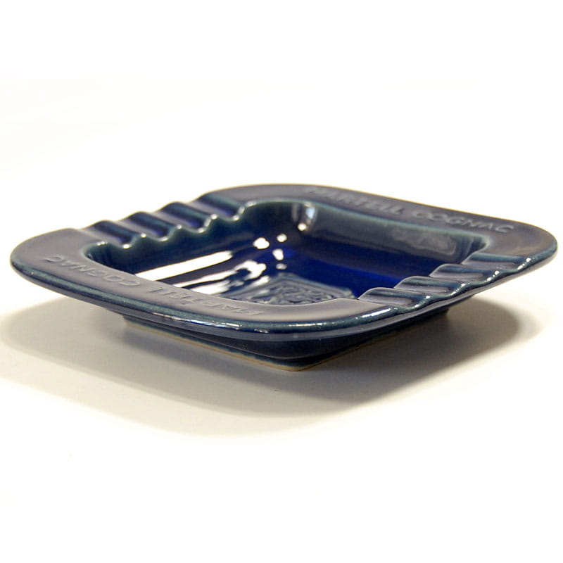 Duża popielnica reklamowa zrobiona z ceramiki i efektownie szkliwiona. Pochodzi z Danii z lat sześćdziesiątych XX wieku. Sygnowana: Ravnil Danmark Stentoj. Zachowana jest w bardzo dobrym stanie z niewielkimi śladami używania głównie w postaci zarysowań powierzchni. Wymiary: 15 x 15 x 3 cm.