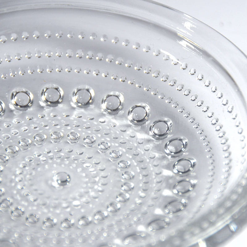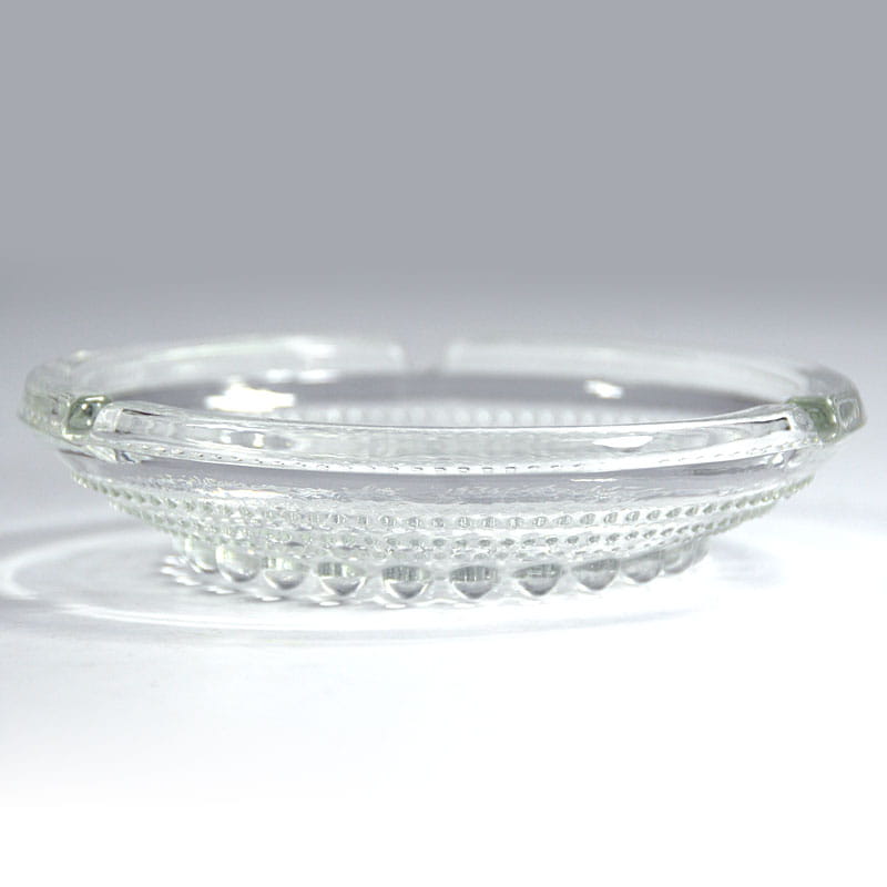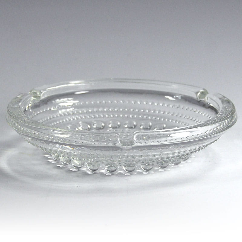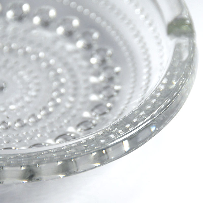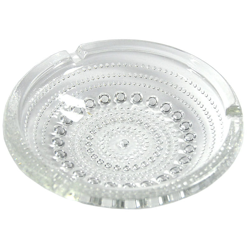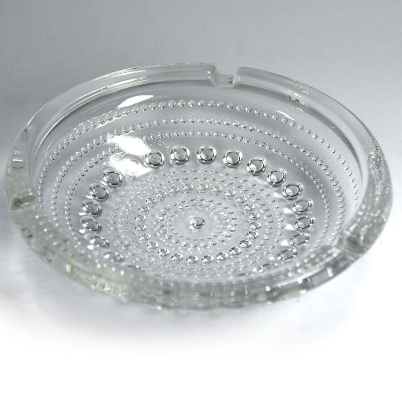 Szklana popielniczka, model Kastehelmi, zaprojektowana przez Oiva Toikka dla fińskiej firmy Iittala. Pochodzi z lat siedemdziesiątych XX wieku. Zachowana w bardzo dobrym stanie. Średnica: 15 cm. Wysokość: 4 cm.