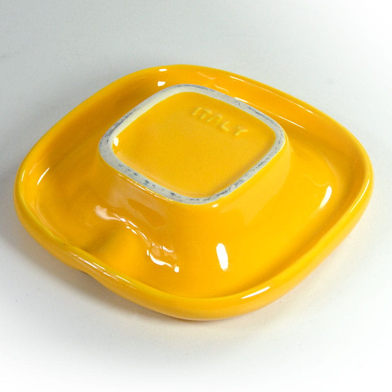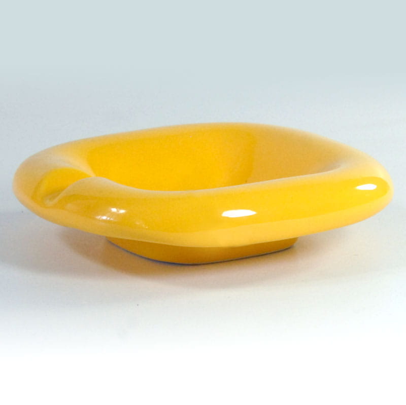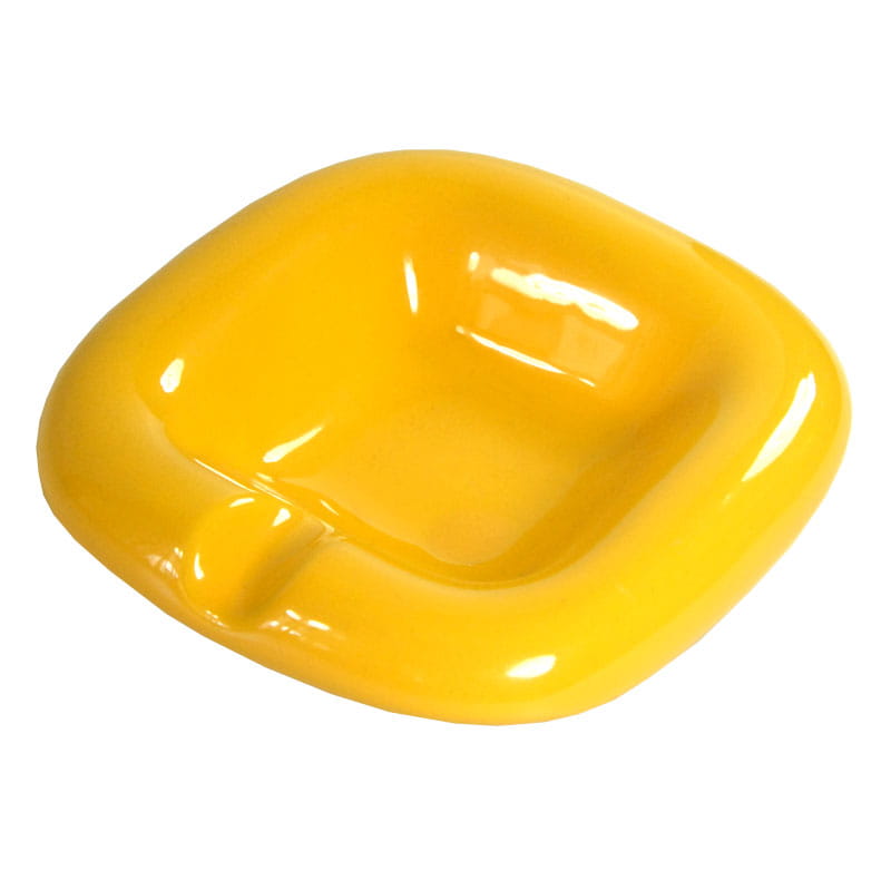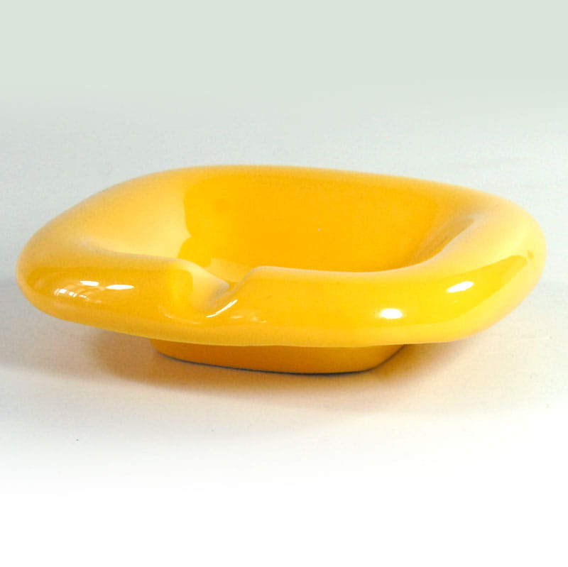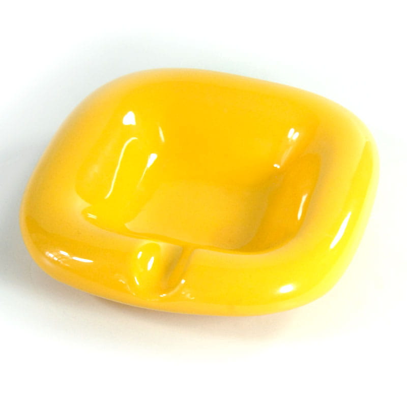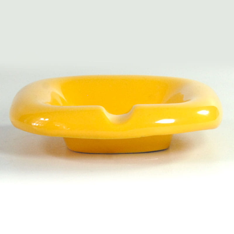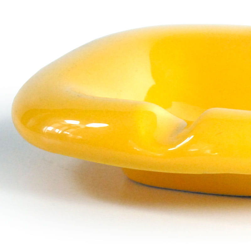 Szkliwiona popielniczka w intensywny, żółtym kolorze. Zaprojektowane zostały w stylistyce Space Age i pochodzą z Włoch z lat siedemdziesiątych XX wieku. Bardzo dobry stan zachowania, z niewielkimi śladami używania. Wymiary: 13 x 13 x 3,5 cm.