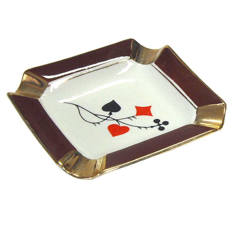 Porcelanowa popielniczka z dekoracją karcianą projektu Wincentego Potackiego, ZPS Ćmielów. Model pochodzący z 1962 roku. Popielniczka zrobiona jest z porcelany, zdobiona malowaniem i złocona. Zachowana w bardzo dobrym stanie. Widoczne niewielkie ślady używania w postaci drobnych zarysowań powierzchni. Wymiary: 9 x 9 x 1,5 cm.