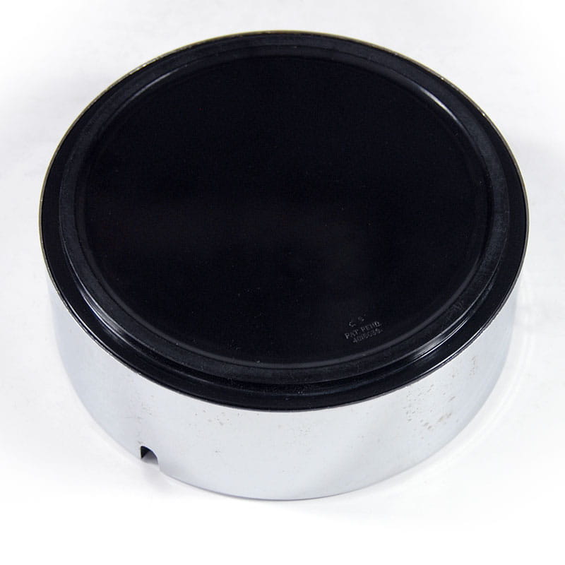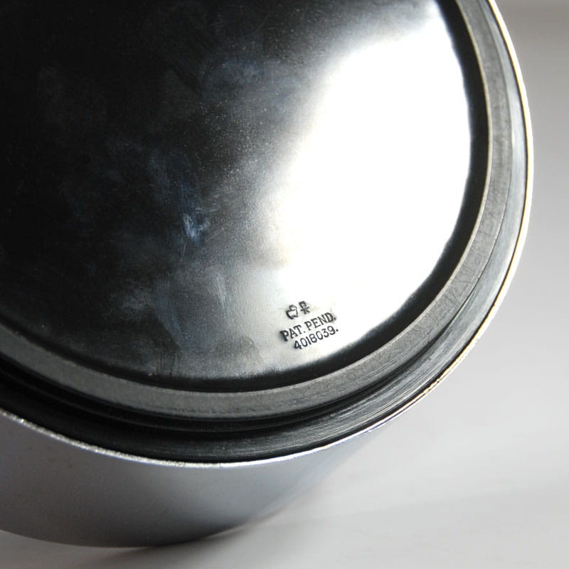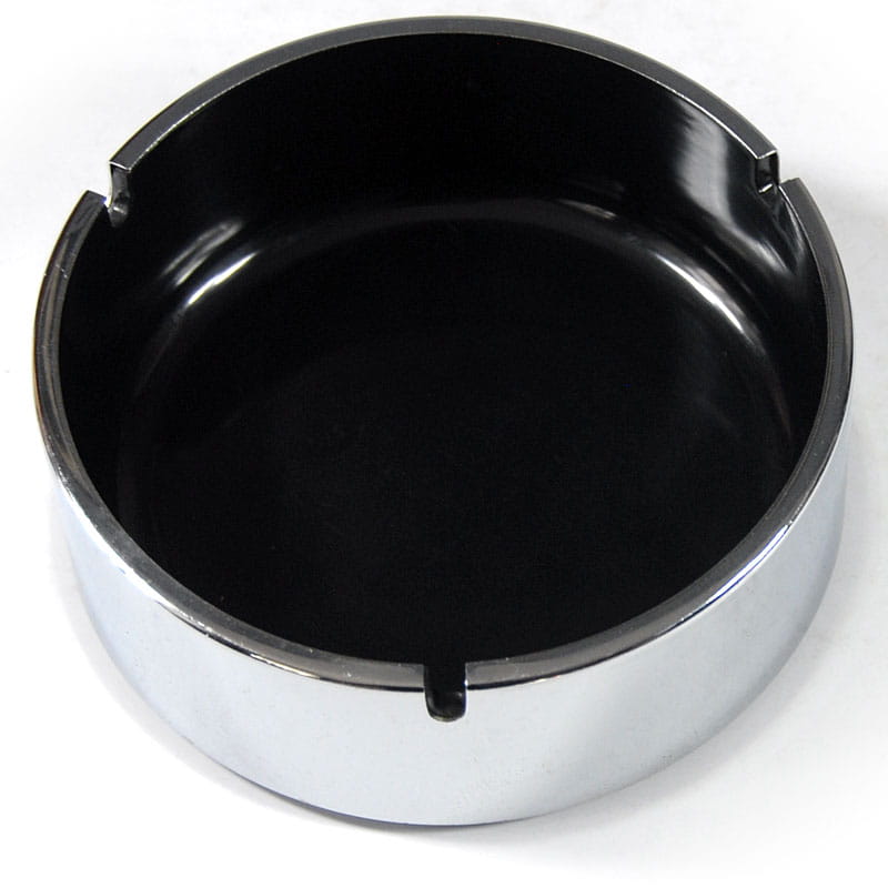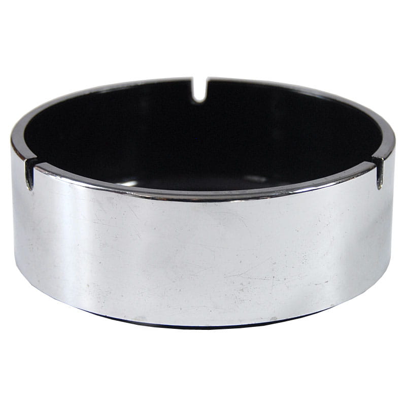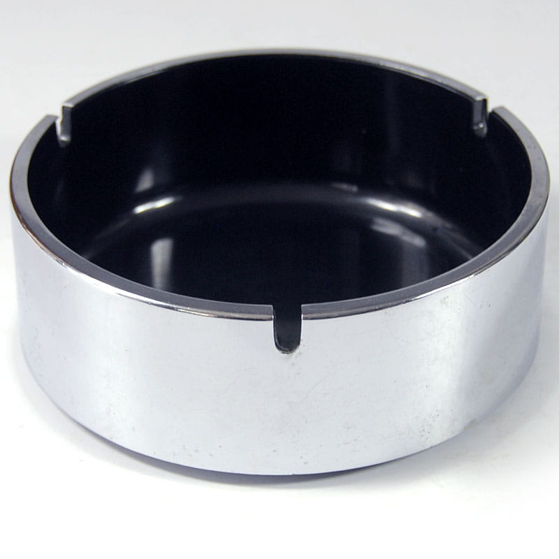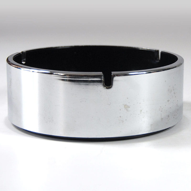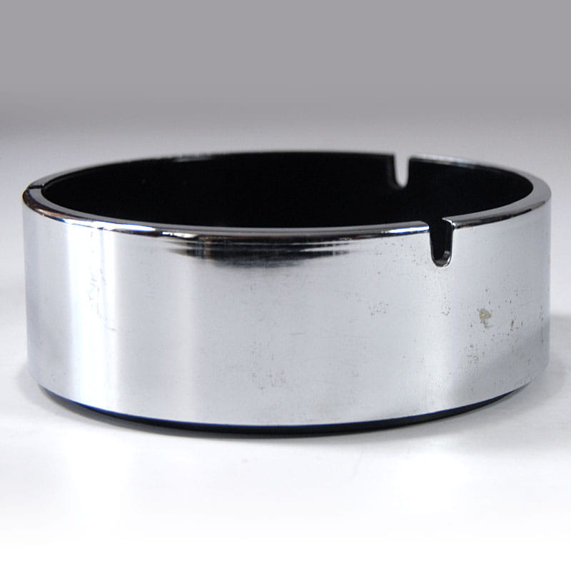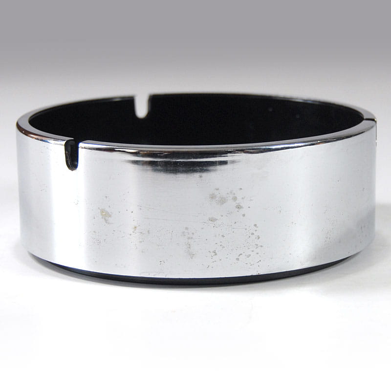 Unikatowa, efektowna popielniczka zaprojektowana przez japońskiego designera Isamu Kenmochi. Zrobiona jest z czarnego tworzywa sztucznego i wykończone chromowanym plastikiem. Pochodzi z lat sześćdziesiątych XX wieku. Sygnowana. Widoczne ślady upływu czasu w postaci defektów powierzchni chromowanej. Wymiary: 15,5 x 5,5 cm.