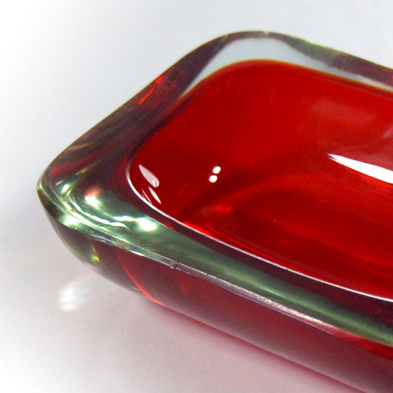 Bardzo efektowna, nieduża szklana popielniczka wykonana techniką sommerso w wytwórni Cenadese w Murano we Włoszech. Piękny głęboki czerwony kolor z efektownymi zielonymi przebarwieniami. Oryginalny przedmiot vintage pochodzący z lat sześćdziesiątych XX wieku. Delikatne ślady używania. Wymiary: 9 x 6,5 x 3 cm.