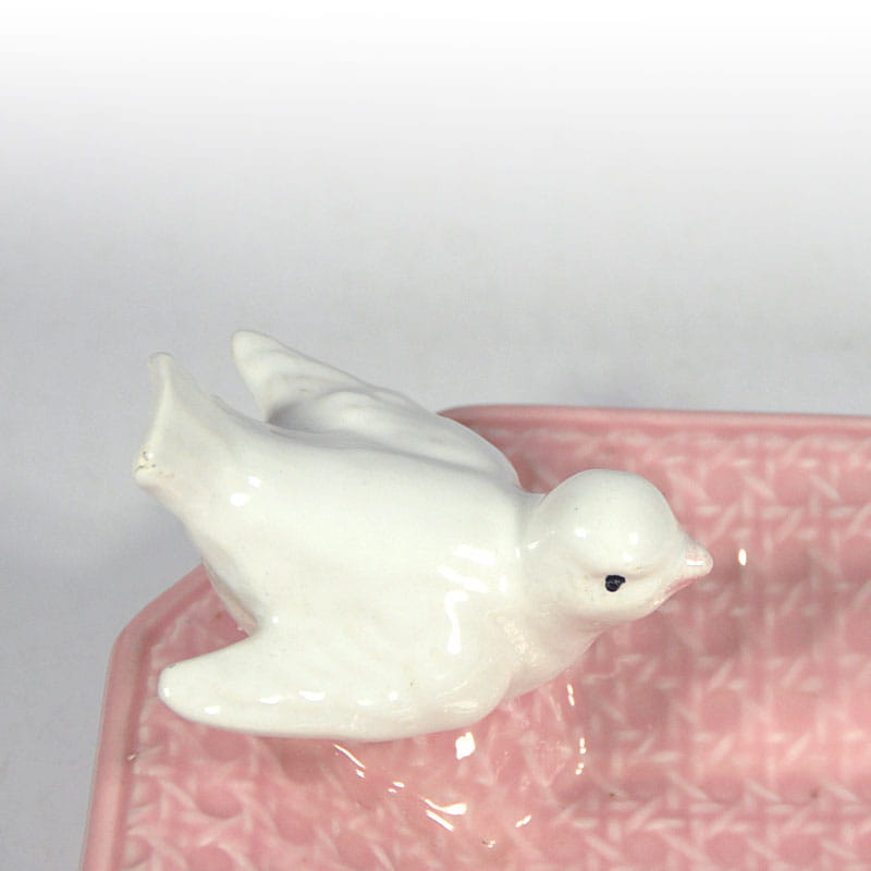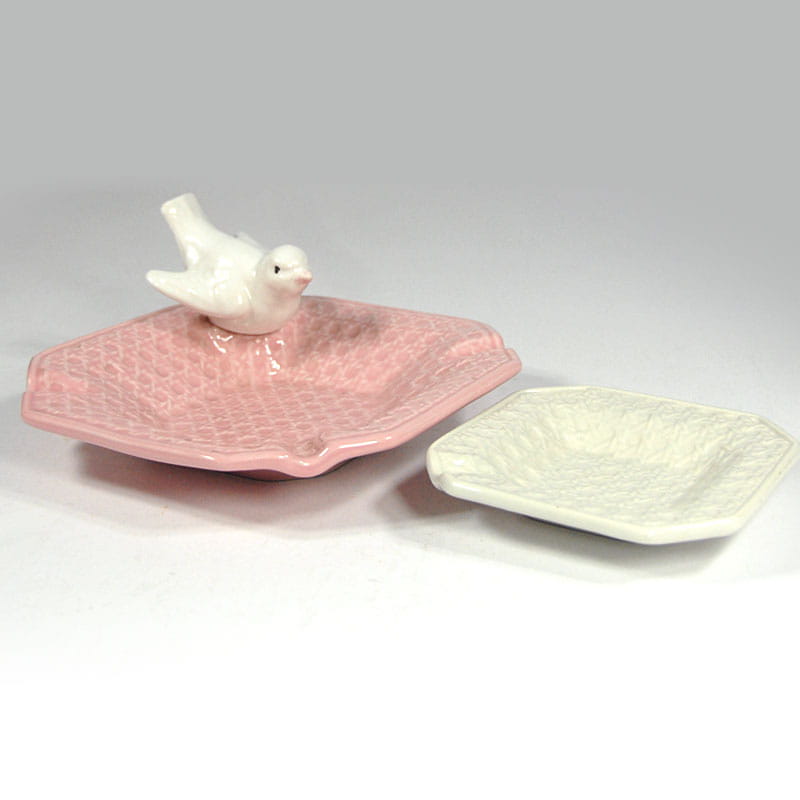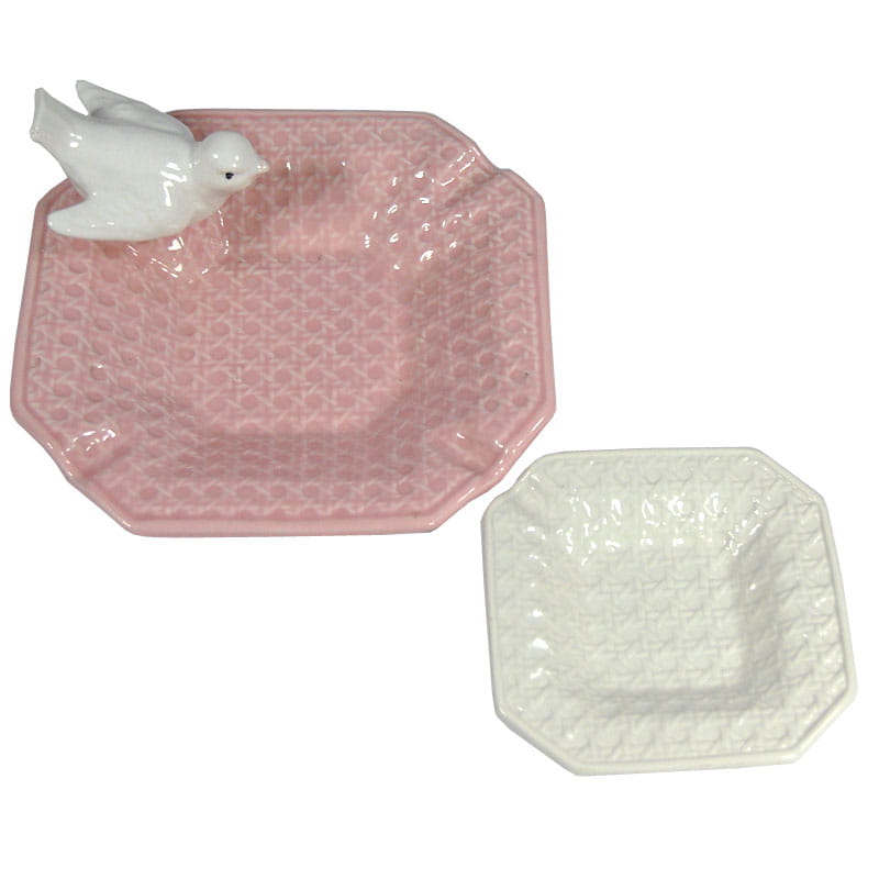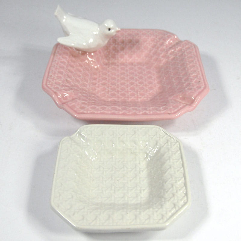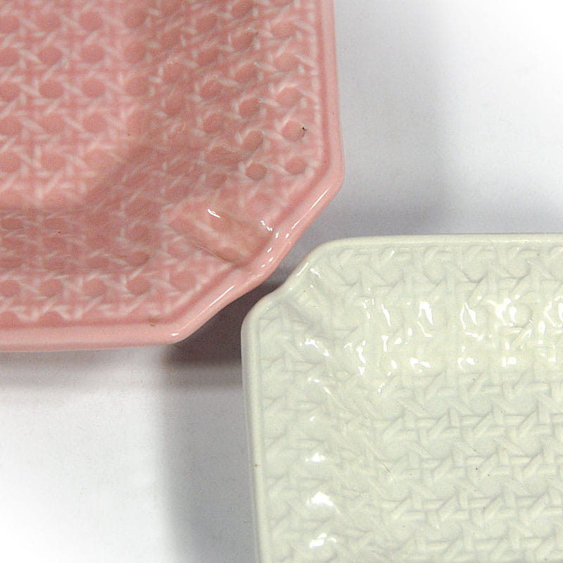 Para ceramicznych popielniczek lub paterek zdobionych reliefową plecionką. Pochodzą z Włoch z lat osiemdziesiątych XX wieku. Sygnowane. Zachowane w bardzo dobrym stanie. Wymiary: 21,5 x 21,5 x 10 cm. oraz 14 x 14 x 3 cm.