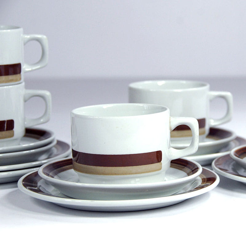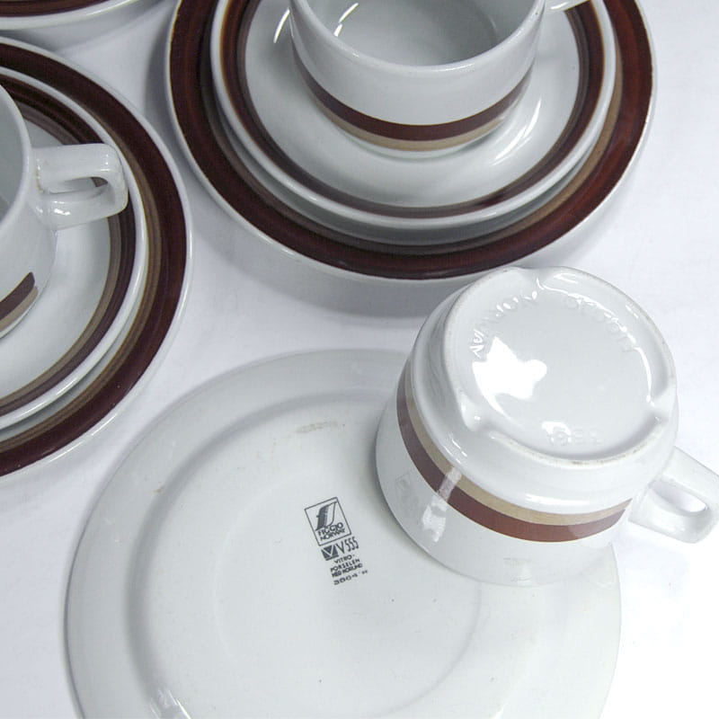 Komplet pięciu zestawów śniadaniowych zrobionych z grubej, białej porcelany zdobionych nadrukiem. Pochodzą z duńskiej wytwórni Figgjo Flint z lat siedemdziesiątych XX wieku. W skład zestawu wchodzi pięć filiżanek ze spodeczkami oraz pięć talerzyków. Zachowane w bardzo dobrym stanie z niewielkimi śladami używania. Wymiary filiżanki: 8,5 x 6,6 cm. Średnica spodka: 14 cm. Średnica talerzyka: 17 cm.