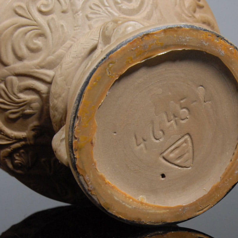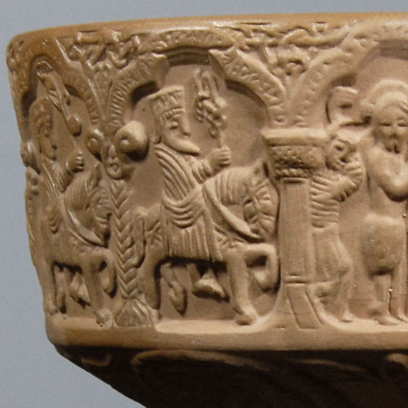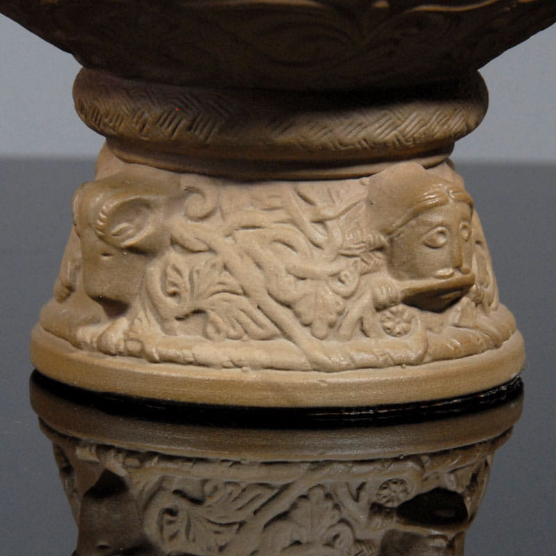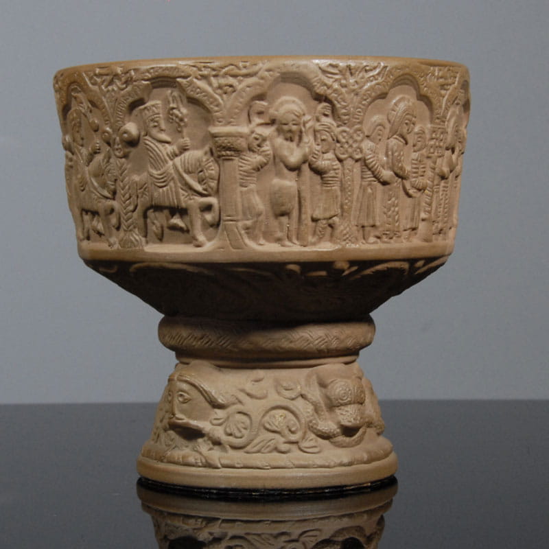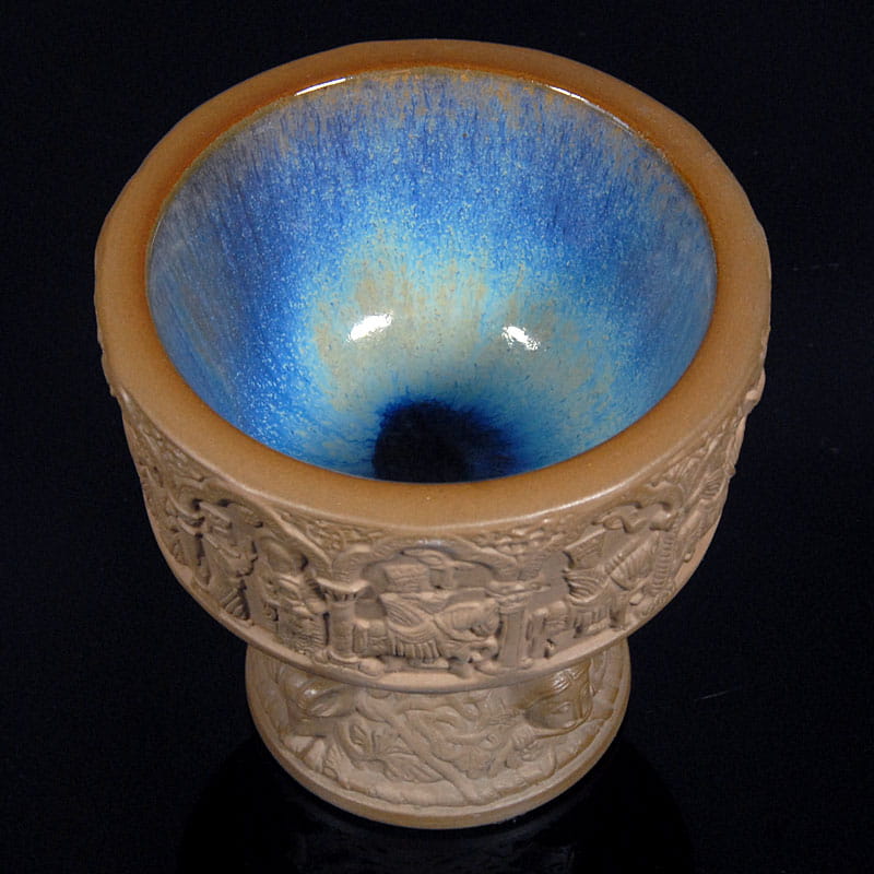 Duński, dekoracyjny puchar z surowej, nieszkliwionej ceramiki. Jedynie wewnątrz piękne niebieskie szkliwo w kilku odcieniach. Pierwowzorem pucharu jest chrzcielnica z XIII wieku. Unikat. Puchar sygnowany wyciskiem. Projekt: Michael Andersen & Son, Bornholm. Przedmiot oryginalne, ręcznie wykonany z lat sześćdziesiątych XX wieku. Wysokość: ok. 14 cm. Średnica: ok. 14 cm.