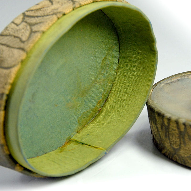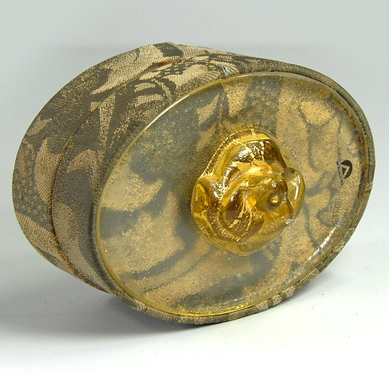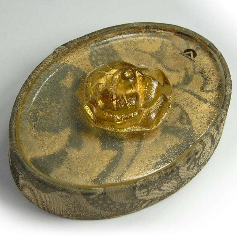 Bardzo dekoracyjne, unikatowe pudełko na drobiazgi zdobione tkaniną gobelinową. Przykrycie zrobione z przejrzystego szkła Murano z zatopionymi drobinkami złota. Zachowane fragmenty oryginalnych sygnatur na naklejkach. Dobry stan zachowania. Wewnątrz widoczne są ślady używania. Wymiary: 12 x 9 x 5,5 cm.