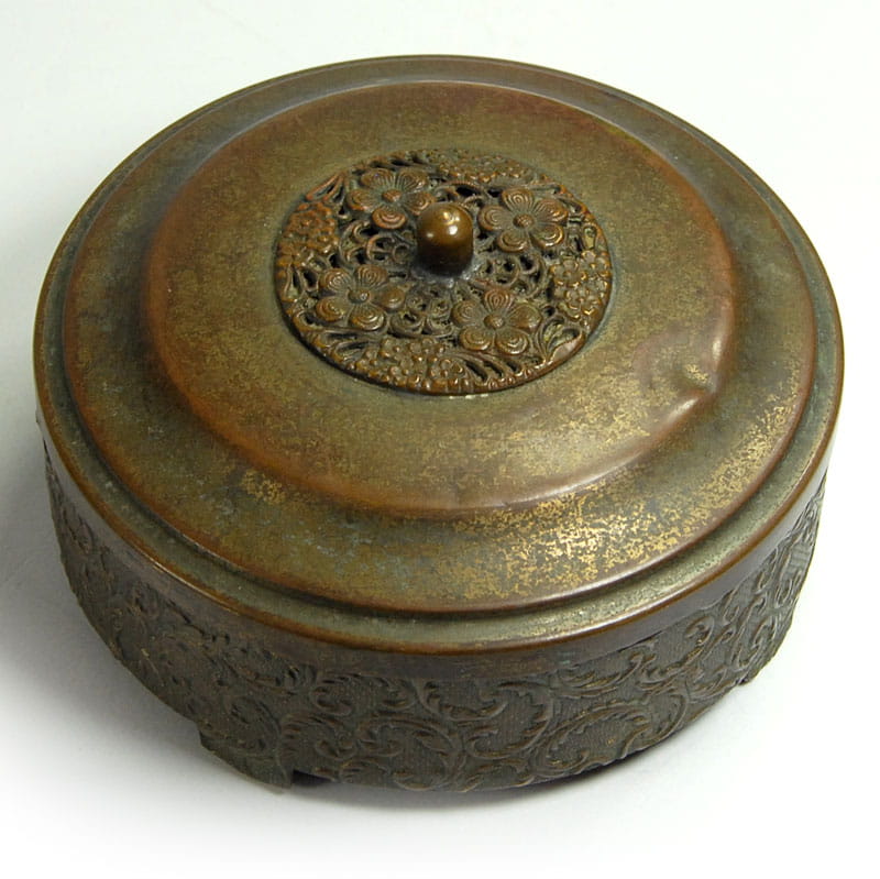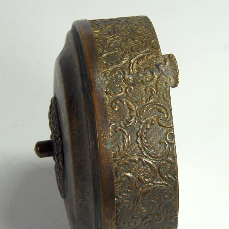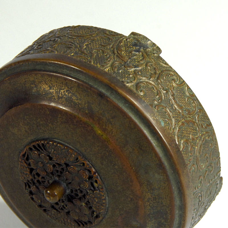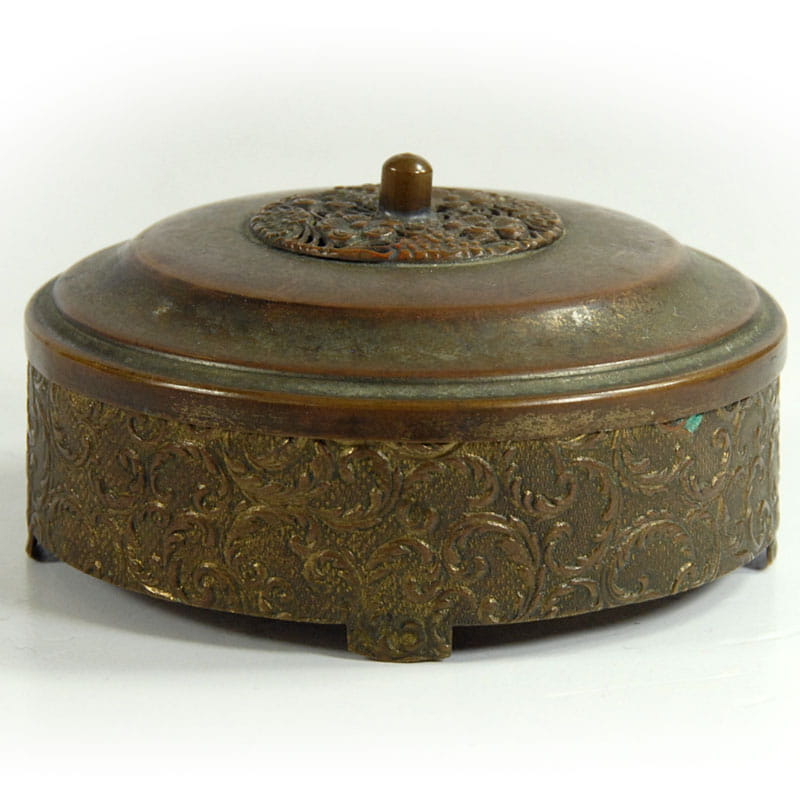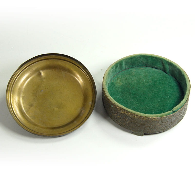 Mały, dekoracyjny pojemniczek Art Deco na biżuterię lub inne drobiazgi. Zrobione jest z brązu, widoczne są resztki złocenia. Wewnątrz wyłożone jest zielonym pluszem. Pochodzi z Francji z lat trzydziestych XX wieku. Puzderko zachowane jest w dobrym stanie. Na przykrywce jest niewielkie wgniecenie. Średnica: 8,5 cm. Wysokość: 4,5 cm.