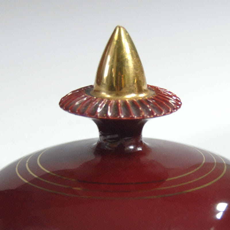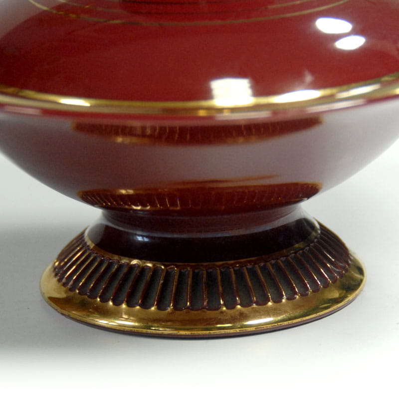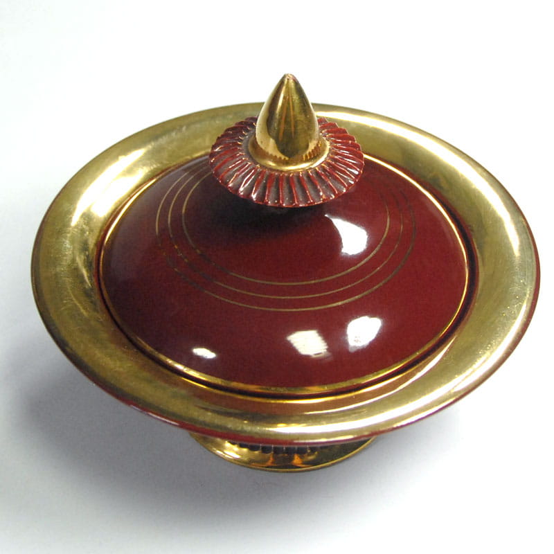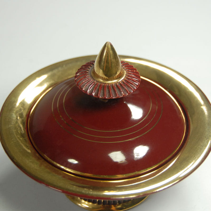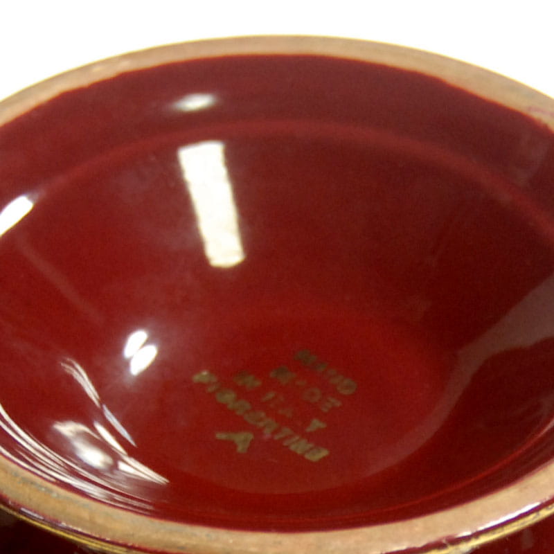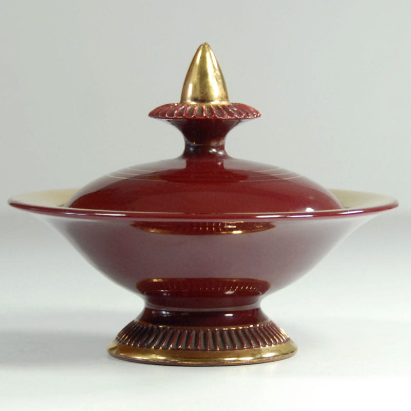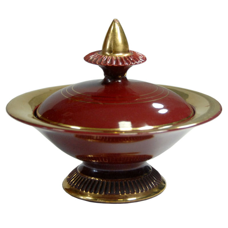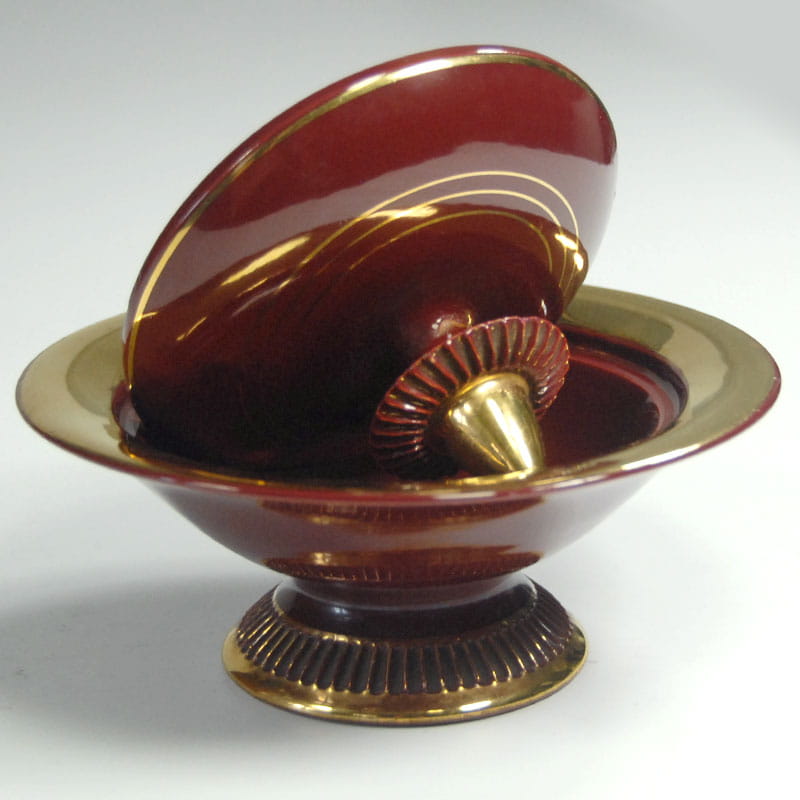 Włoski pojemnik/puzderko ceramiczne szkliwione i złocone. Zaprojektowany prawdopodobnie przez Italo Casini dla Fiorentine Italy. Przedmiot vintage pochodzący z lat pięćdziesiątych XX wieku. Pojemnik zachowany w dobrym stanie. Przykrywka jest uszkodzona, ma klejony uchwyt (nie widoczne podczas używania) oraz ukruszony czubek. Wysokość: 13 cm. Średnica: 16 cm.