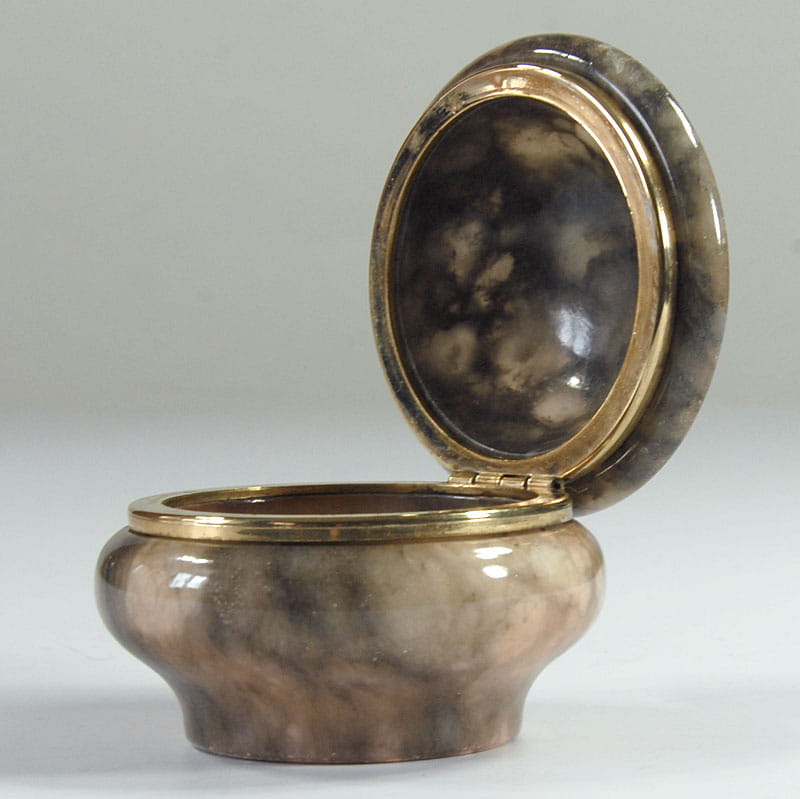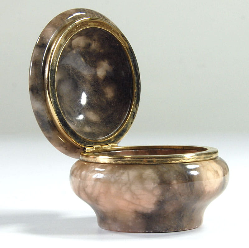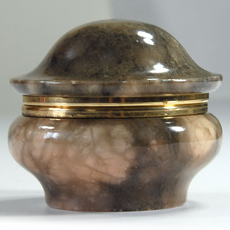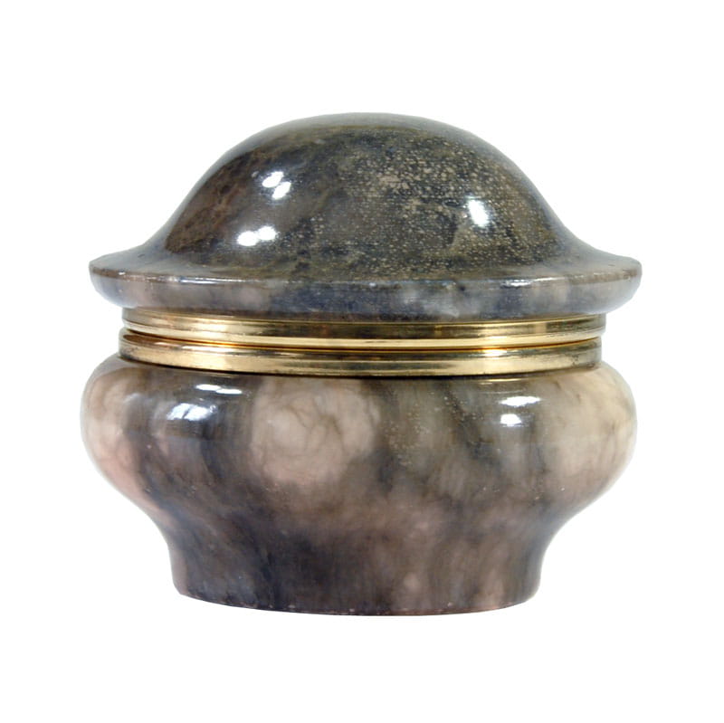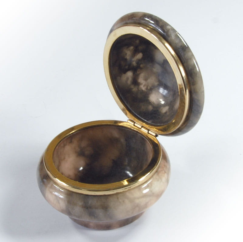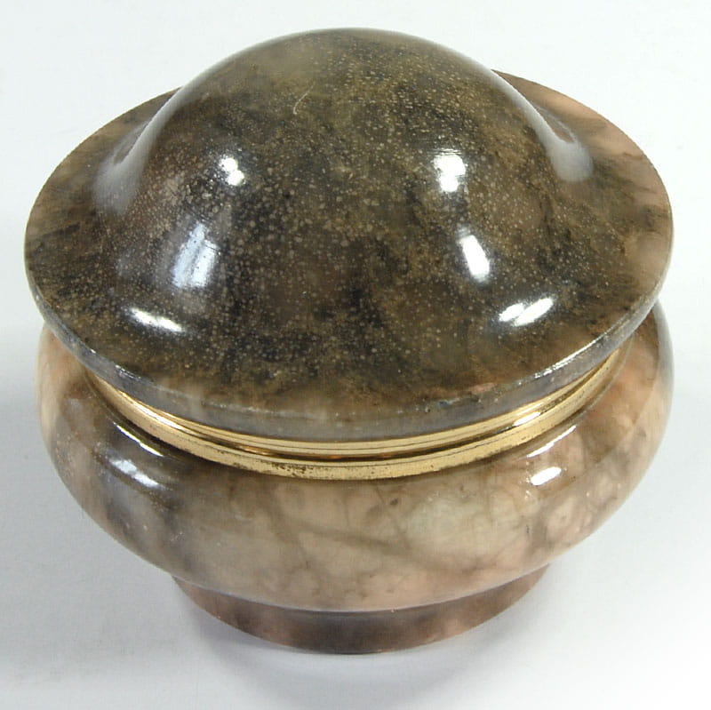 Efektowne puzderko zrobione ręcznie z polerowanego marmuru, wykończone metalem. Pochodzi z Włoch. Nosi delikatne ślady używania głównie w postaci patyny na elementach metalowych. Średnica: 9,5 cm. Wysokość: 8 cm.
