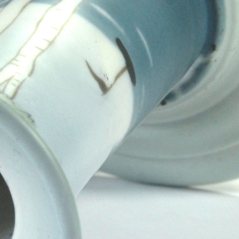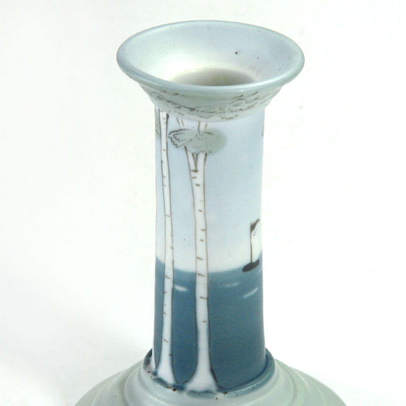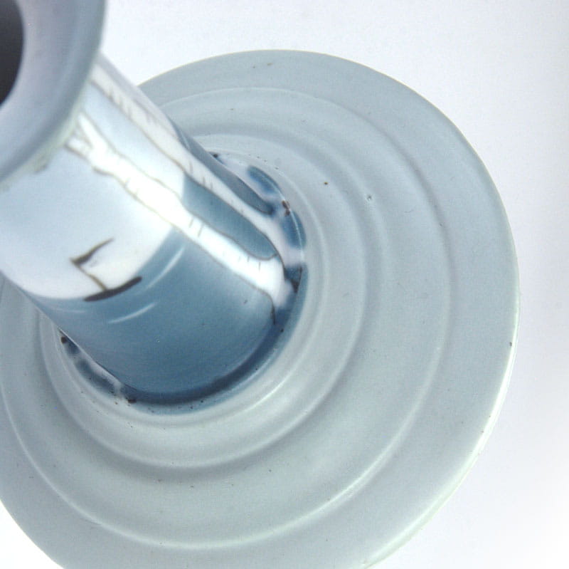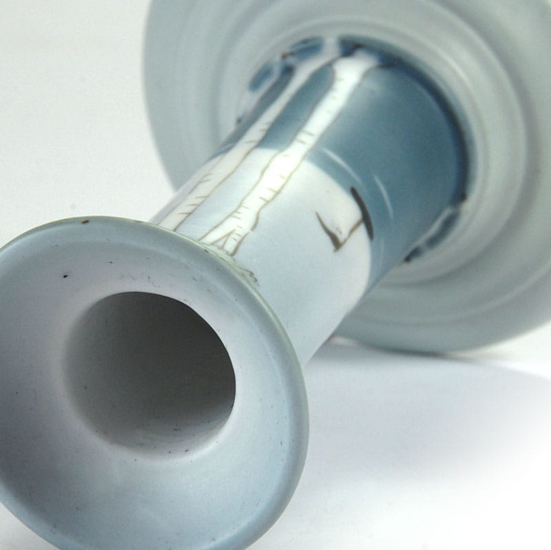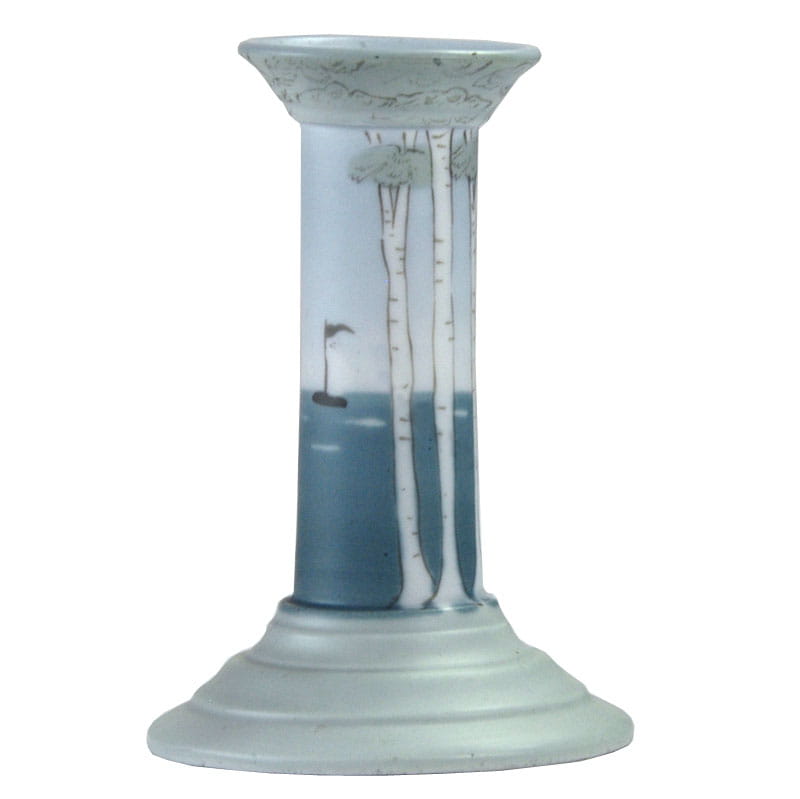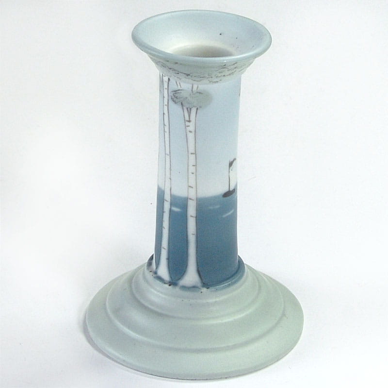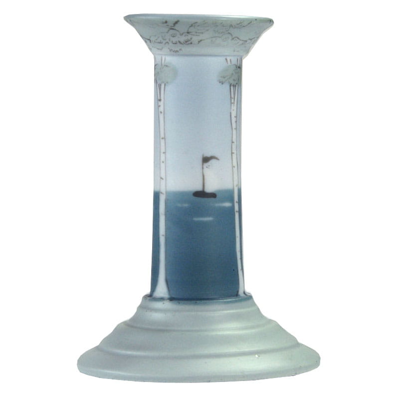 Świecznik stołowy zrobiony z białej, satynowej porcelany. Zdobiony jest ręcznie malowanym pejzażem nadmorskim. Sygnowany. Pochodzi z Danii z lat trzydziestych XX wieku. Zachowany jest w bardzo dobrym stanie. Wysokość: 12,5 cm. Średnica: 8,5 cm.