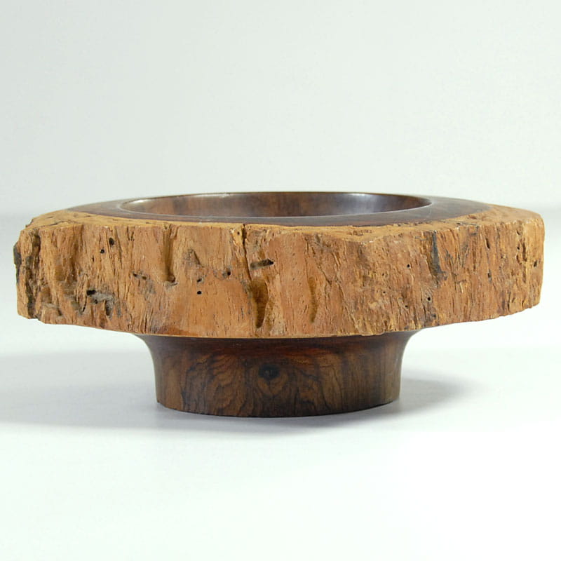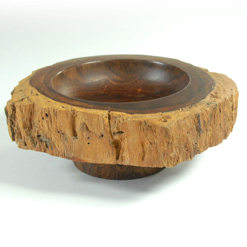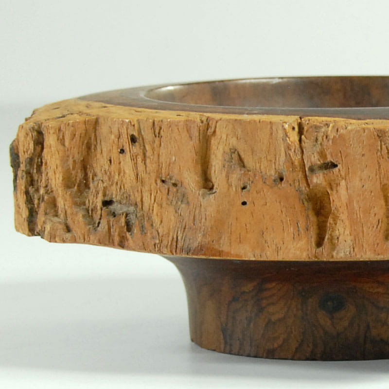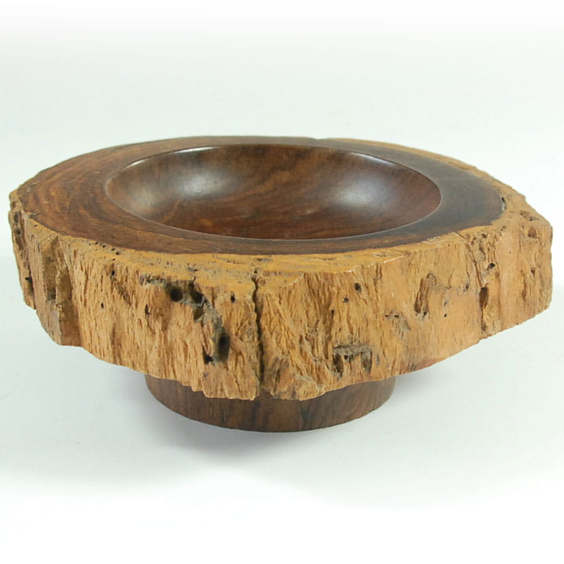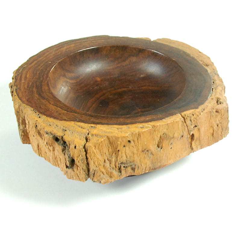 Bardzo dekoracyjna patera zrobiona ręcznie z pnia drzewa egzotycznego. Wnętrze wydrążone i wypolerowane. Na zewnątrz została pozostawiona struktura surowego drewna. Średnica: 18 cm. Wysokość: 7 cm.
