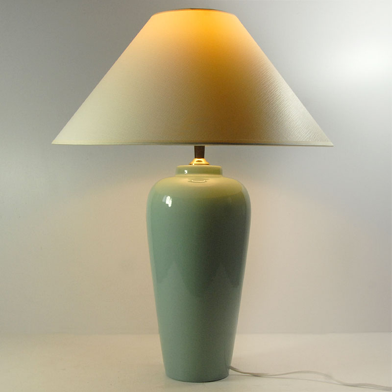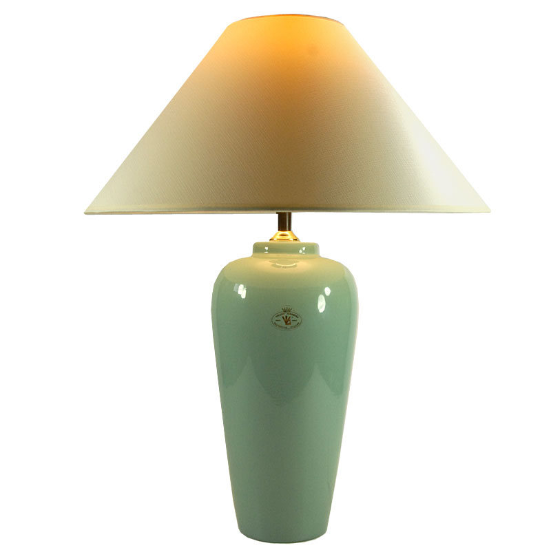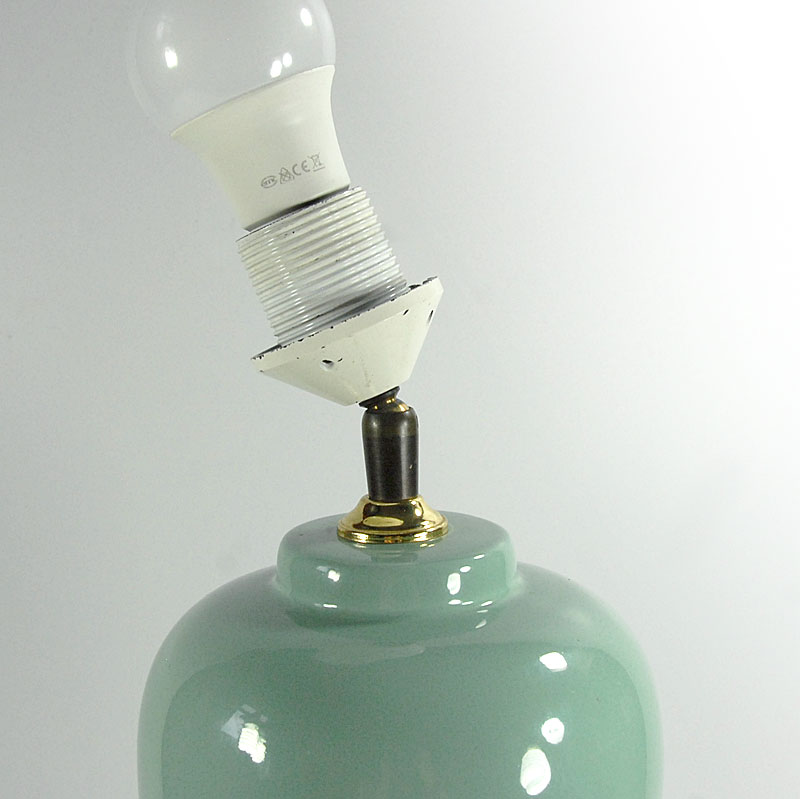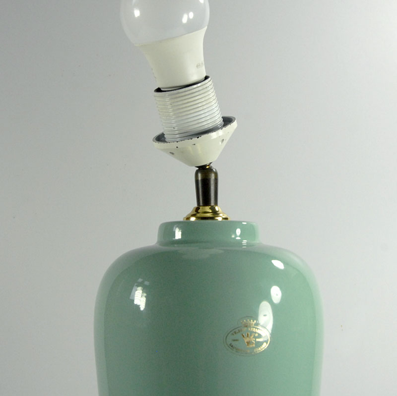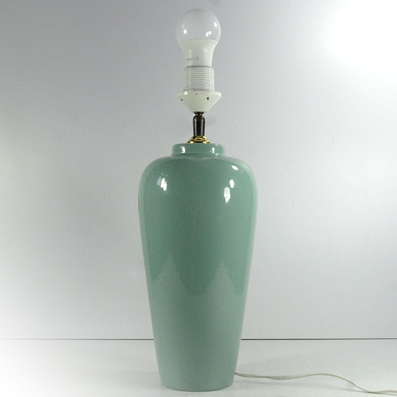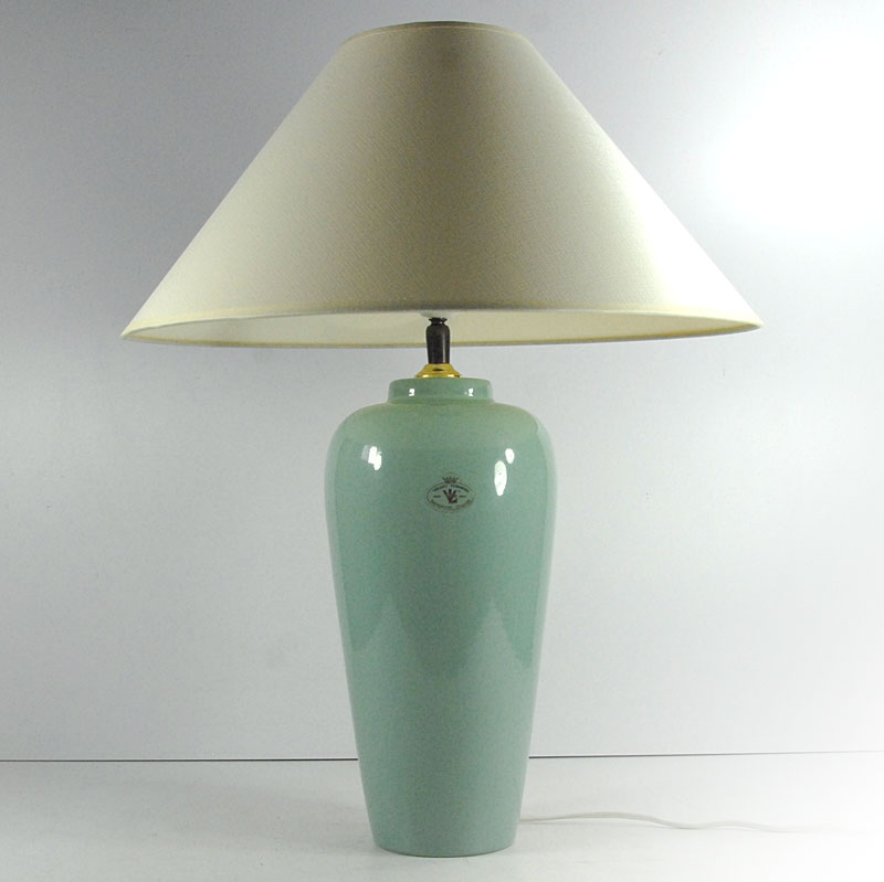 Duża, lampa stołowa zrobiona z ceramiki. Zdobina mocno błyszczącym szkliwem w delikatnym seledynowym kolorze. Lampa pochodzi z Holandii. Wyprodukowana w latach osiemdziesiątych XX wieku. Sygnowana na naklejce. Uzupełniona o współczesny abażur. Lampa zachowana jest w bardzo dobrym stanie. Obsadka na żarówkę E27. Wysokość: 52 cm. Wysokość podstawy (bez żarówki): 40 cm. Średnica: 16 cm. Średnica dołu podstawy: 9 cm. Średnica abażuru: 40 cm.