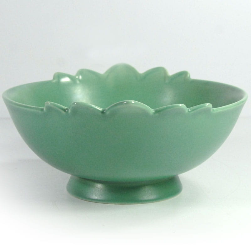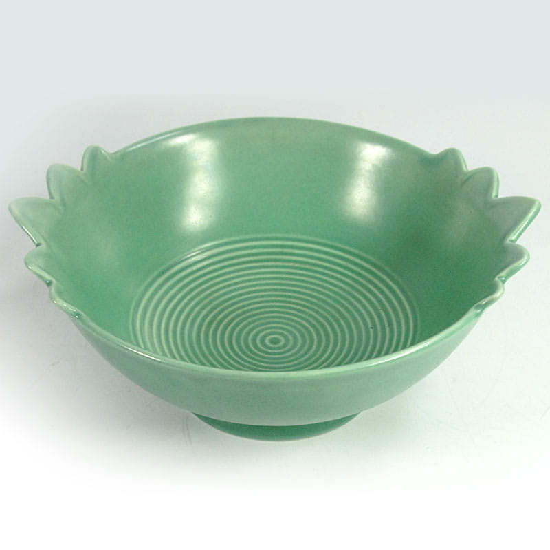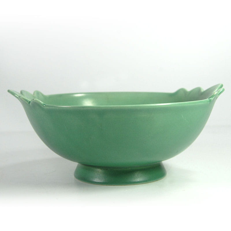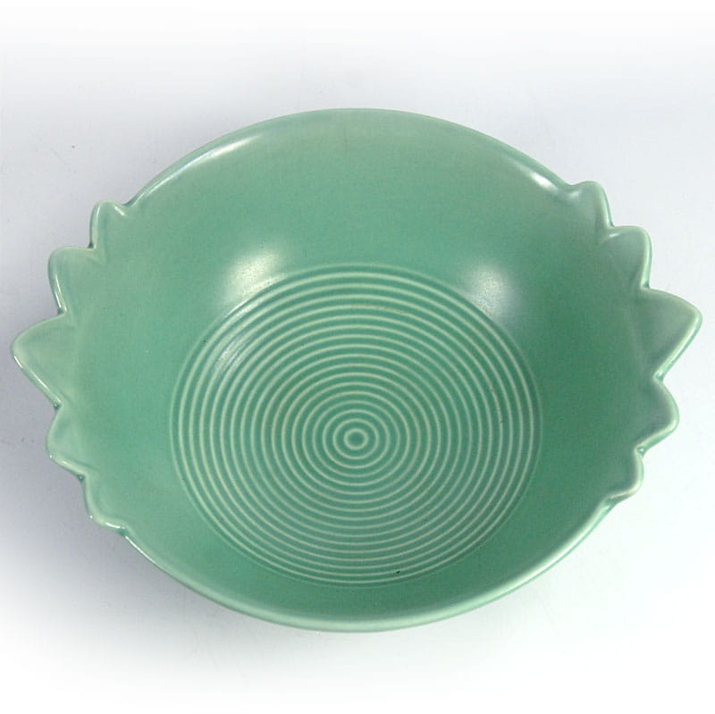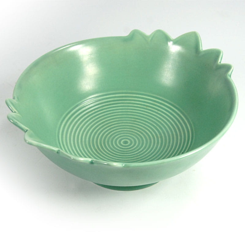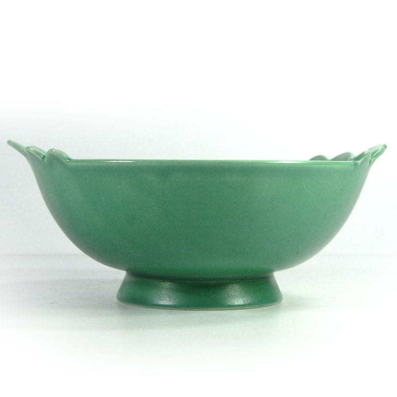 Bardzo dekoracyjna misa w zaprojektowana i wykonana w stylistyce Art Deco. Wyprodukowana w latach trzydziestych XX wieku w wytwórni V&B w Luxemburgu. Wykończona półmatowym szkliwem w delikatnym seledynowym kolorze. Sygnowana. Niewielkie ślady używania głównie w postaci drobnych zarysowań powierzchni. Średnica: 24 cm. Wysokość: 10 cm. Średnica podstawy: 10,5 cm.