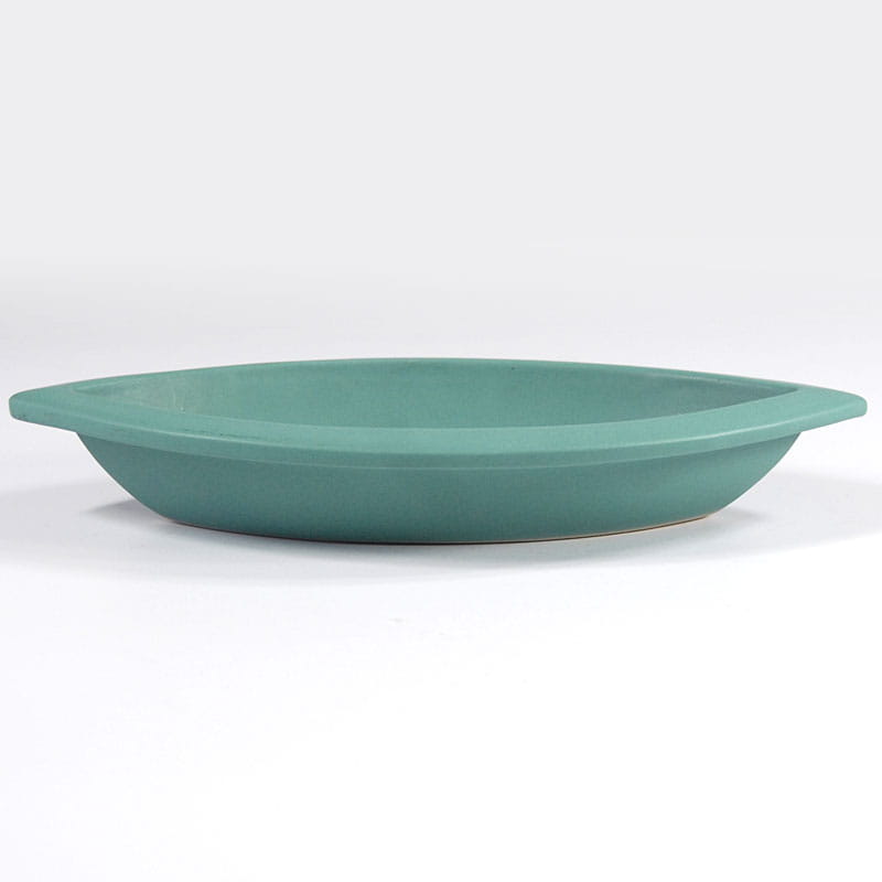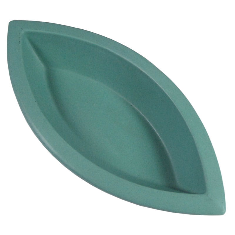 Dekoracyjna patera ceramiczna w kolorze seledynowej zieleni. Sygnowana. Pochodzi z Niemiec z lat osiemdziesiątych XX wieku. Mało widoczna wada produkcyjna na krawędzi. Wymiary: 29 x 14 cm. Wysokość: 5 cm.