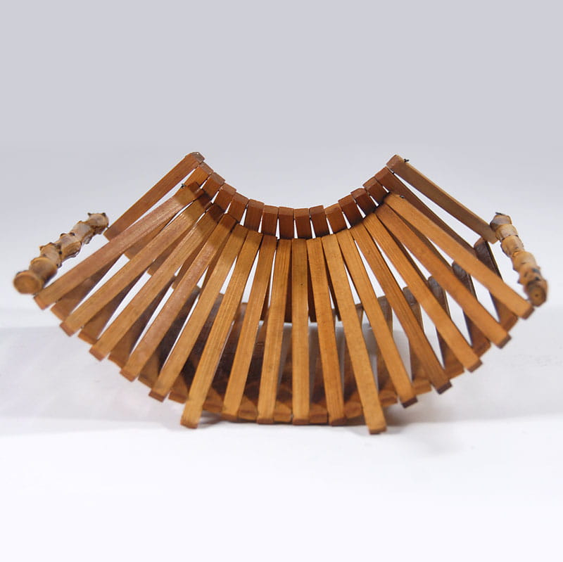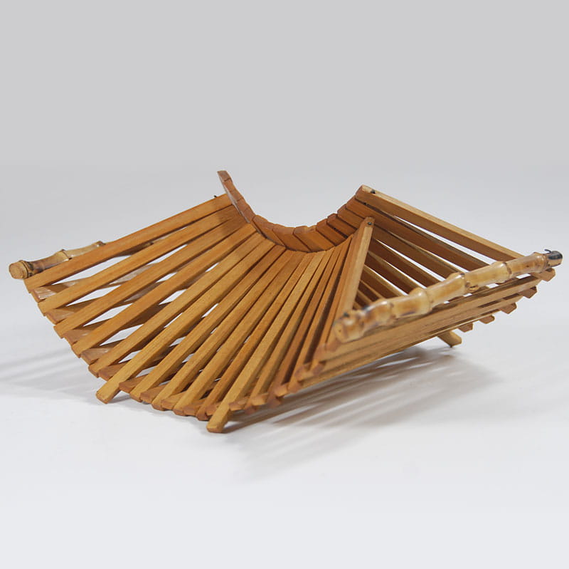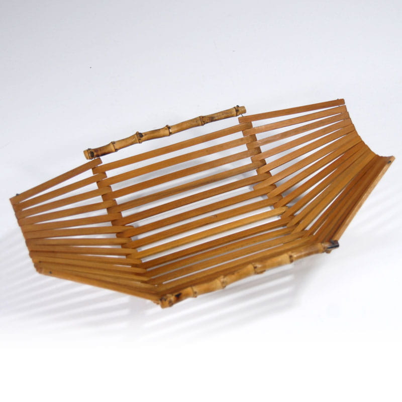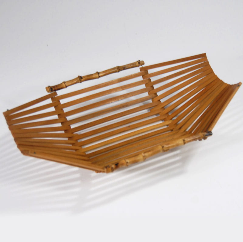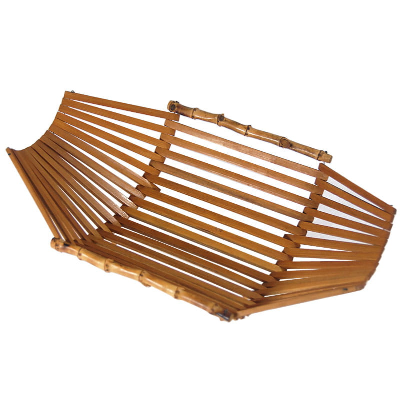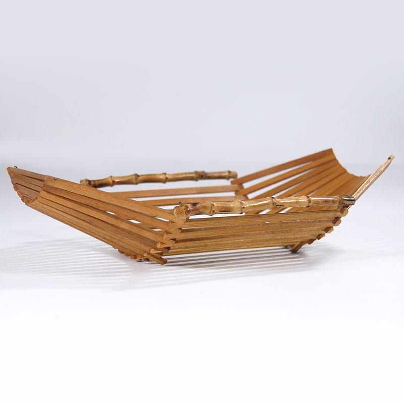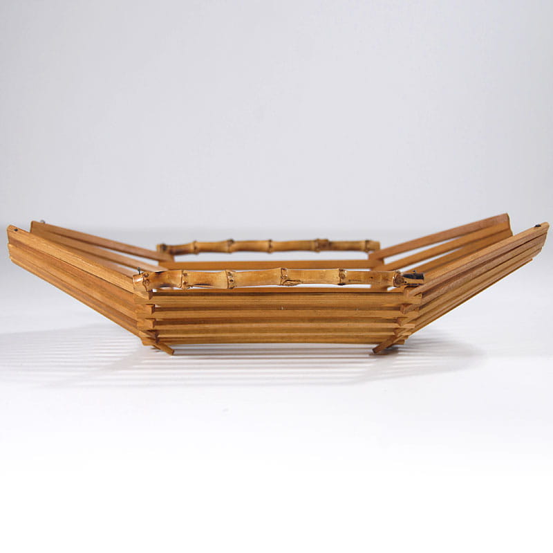 Dekoracyjna, składana patera bambusowa. Wymiary rozłożonej patery: 36 x 22 cm. Wysokość maksymalna: 11 cm. Wymiary złożonej patery: 18 x 22 cm. Wysokość maksymalna: 18 cm.