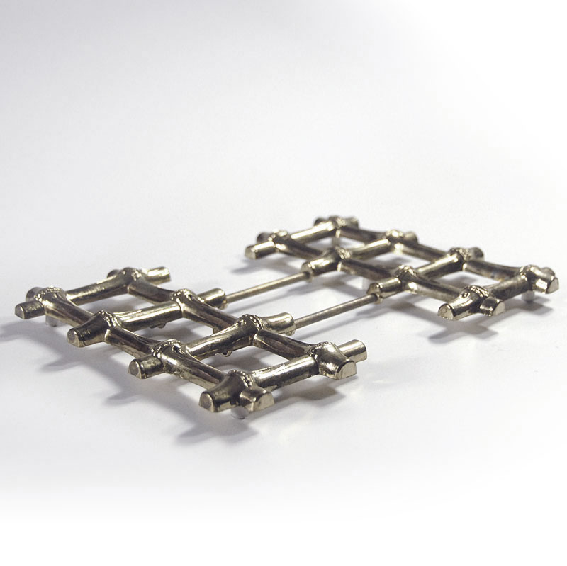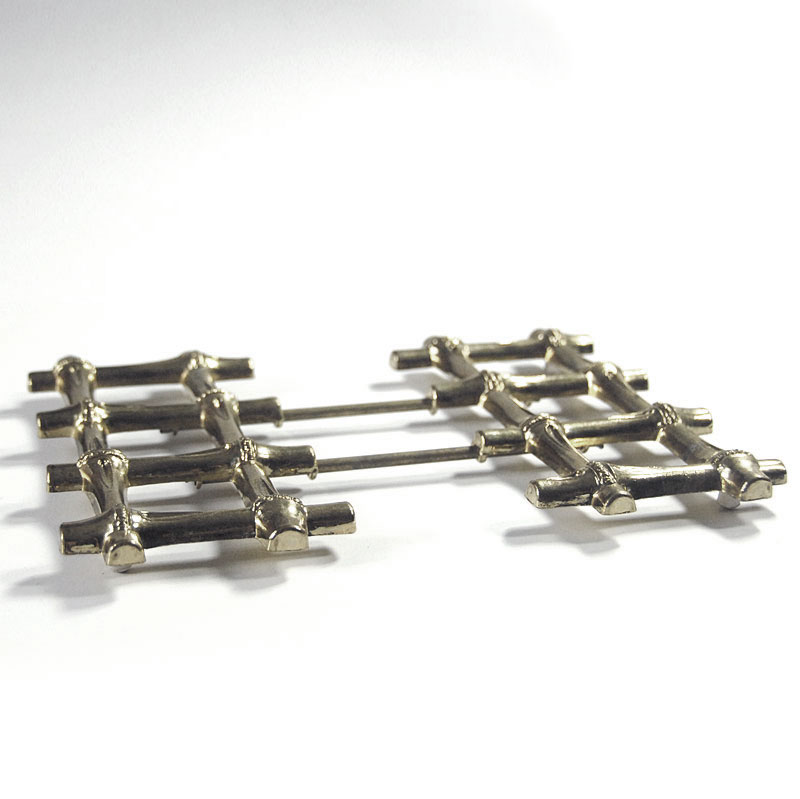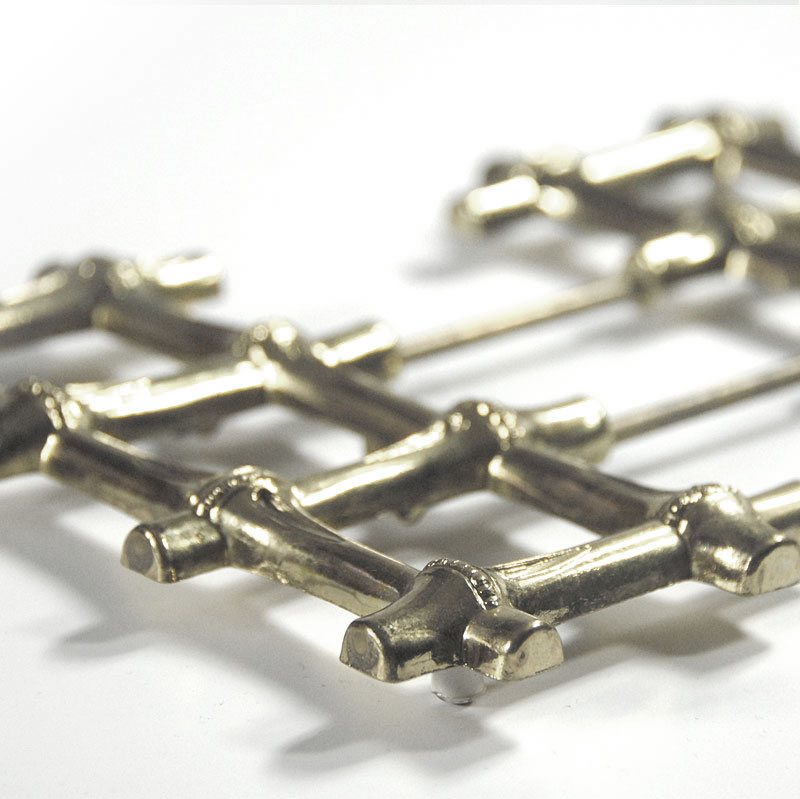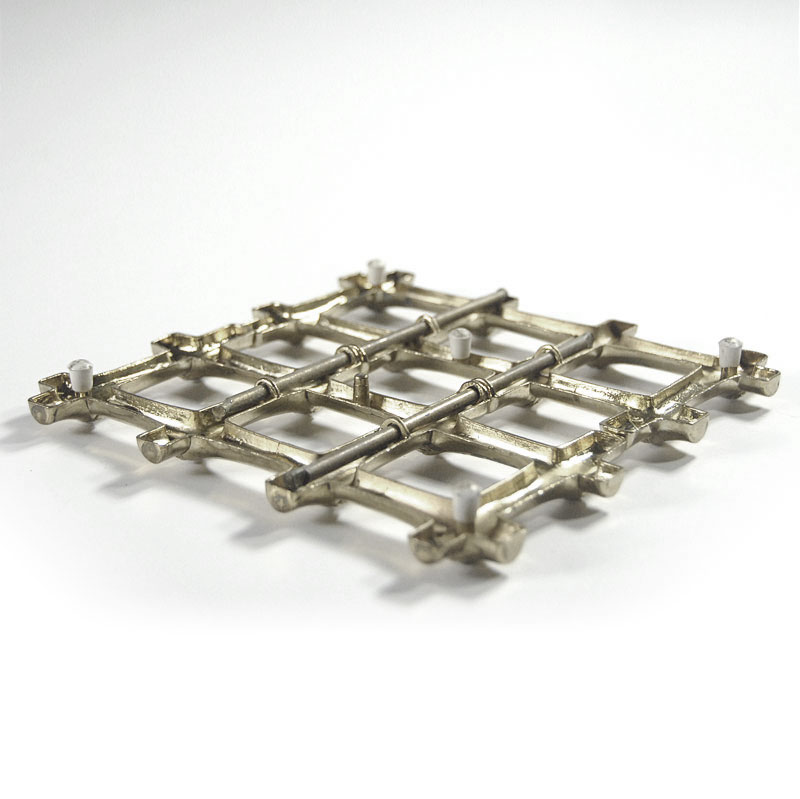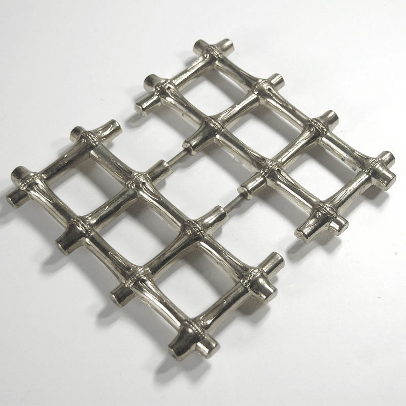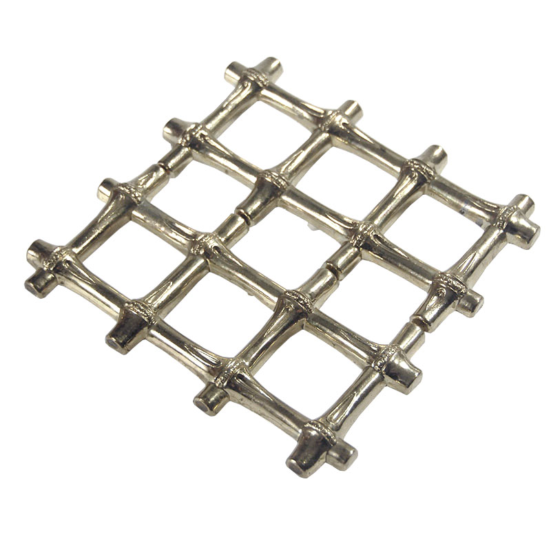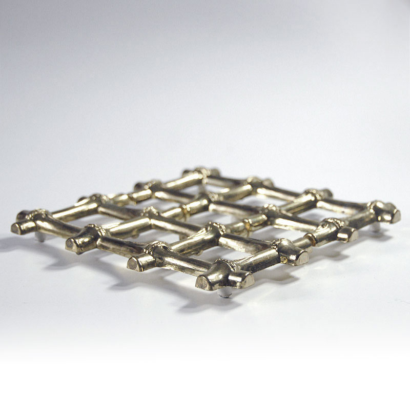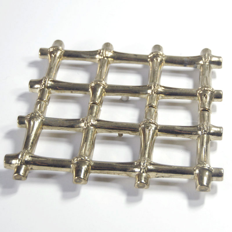 Podstawka pod gorące naczynia zrobiona z metalu i srebrzona. Kształtem nawiązuje do plecionki bambusowej. Posiada regulację szerokości. Podstawka została wyprodukowana we Włoszech w latach pięćdziesiątych XX wieku. Bardzo dobry stan zachowania. Widoczna patyna adekwatna do wieku przedmiotu. Wymiary: 18,5 x 18,5 cm. Wymiary po rozsunięciu: 18,5 x 24,5 cm.