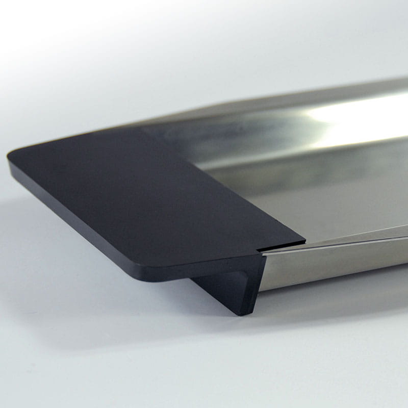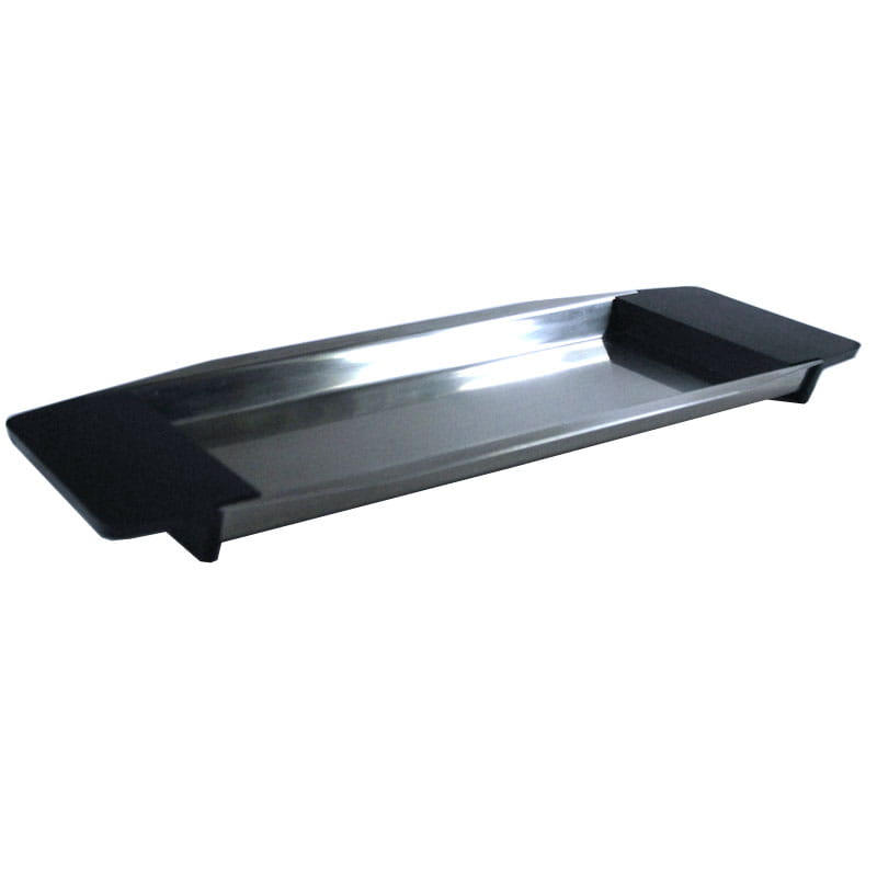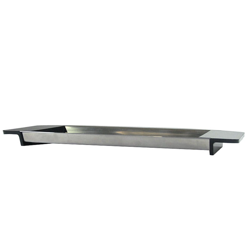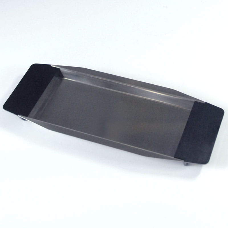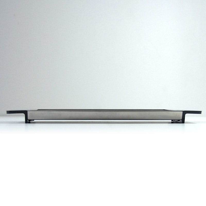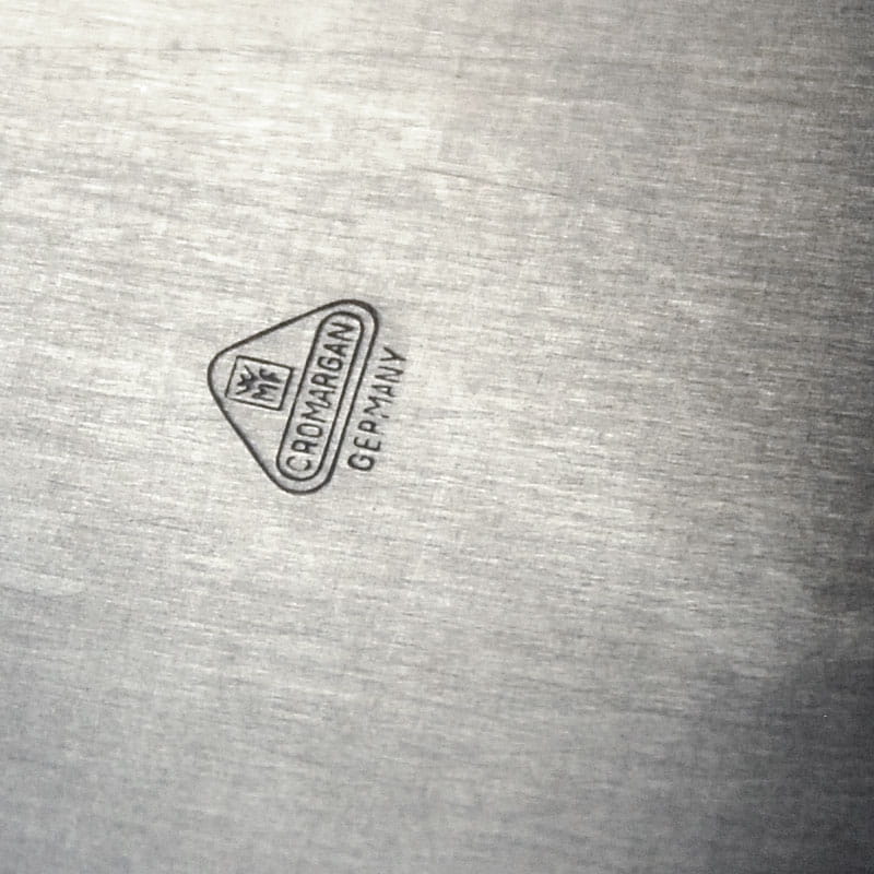 Minimalistyczna, podłużna tacka zrobiona ze stali szczotkowanej. Uchwyty wykonane są z tworzywa sztucznego. Pochodzi z renomowanej niemieckiej wytwórni WFM z lat osiemdziesiątych XX wieku. Nosi delikatne slady uzywania. Wymiary: 33 x 16 cm. Wysokość: 2,5 cm.