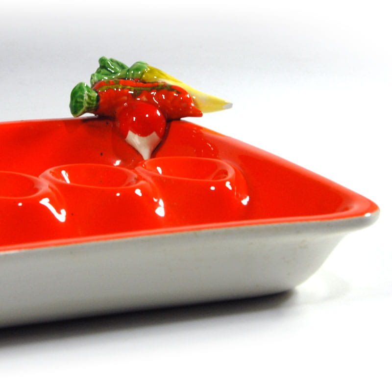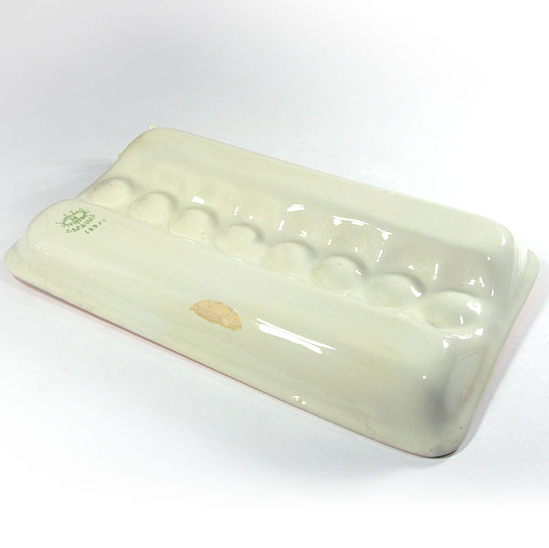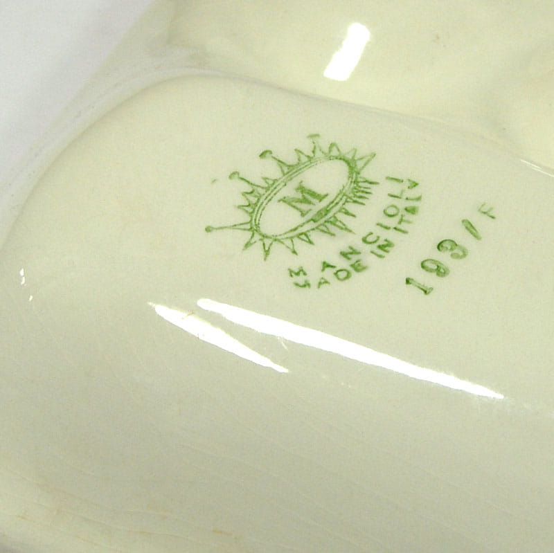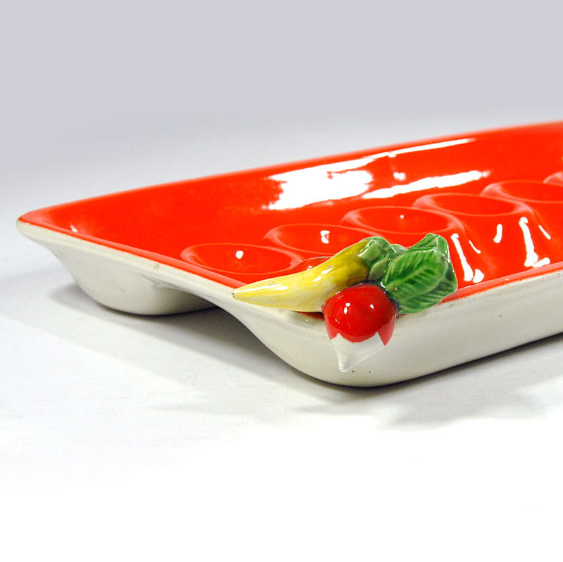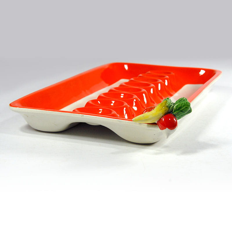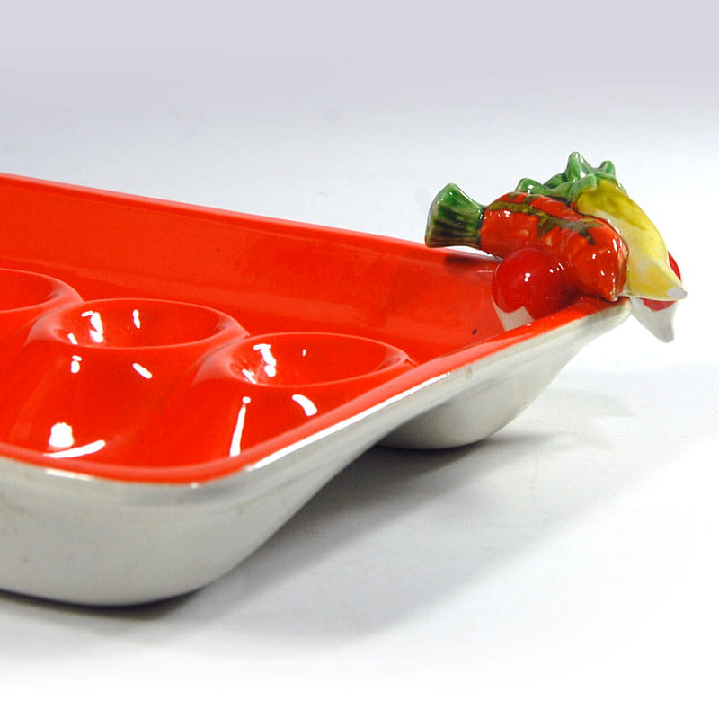 Ceramiczna patera stołowa zdobiona dekoracją przestrzenną. Zaprojektowana i wykonana została we Włoszech. Pochodzi z lat sześćdziesiątych XX wieku z renomowanej wytwórni fajansu Mancioli. Sygnowana. Zachowana w bardzo dobrym stanie. Wymiary: 42 x 23,5 x 7 cm.