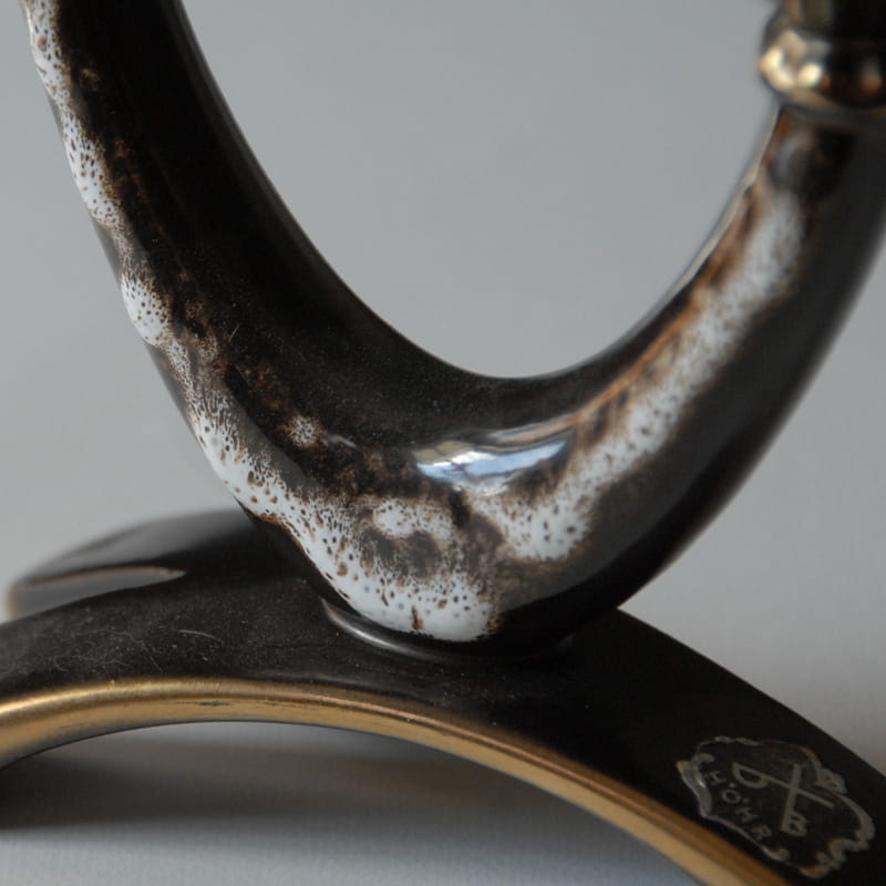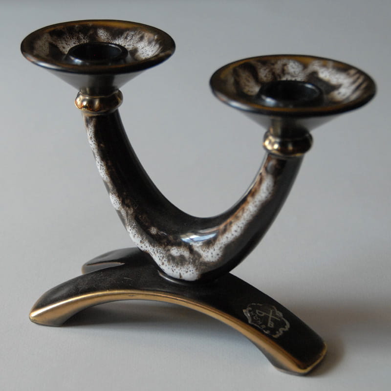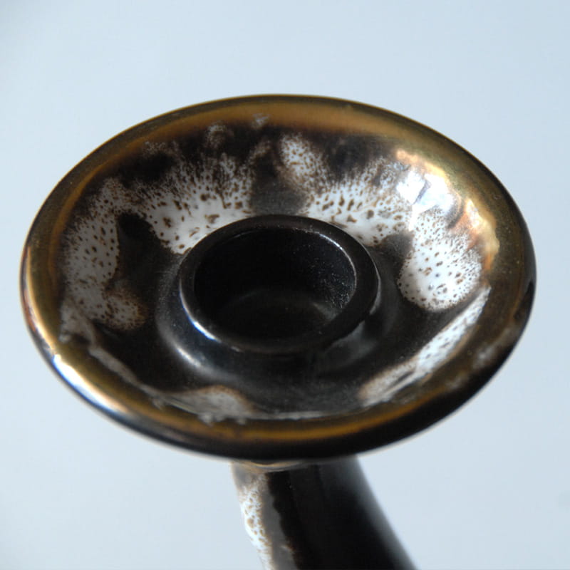 Piękny, efektowny świecznik stoł. Szkliwiony w odcieniach brązu i złota. Wyprodukowana w Niemczech przez firmę Dumler Breiden Hohr Pottery. Przedmiot oryginalny z lat siedemdziesiątych XX wieku. Wysokość: ok.14,5 cm. Szerokość w najszerszym miejscu: ok. 18 cm.