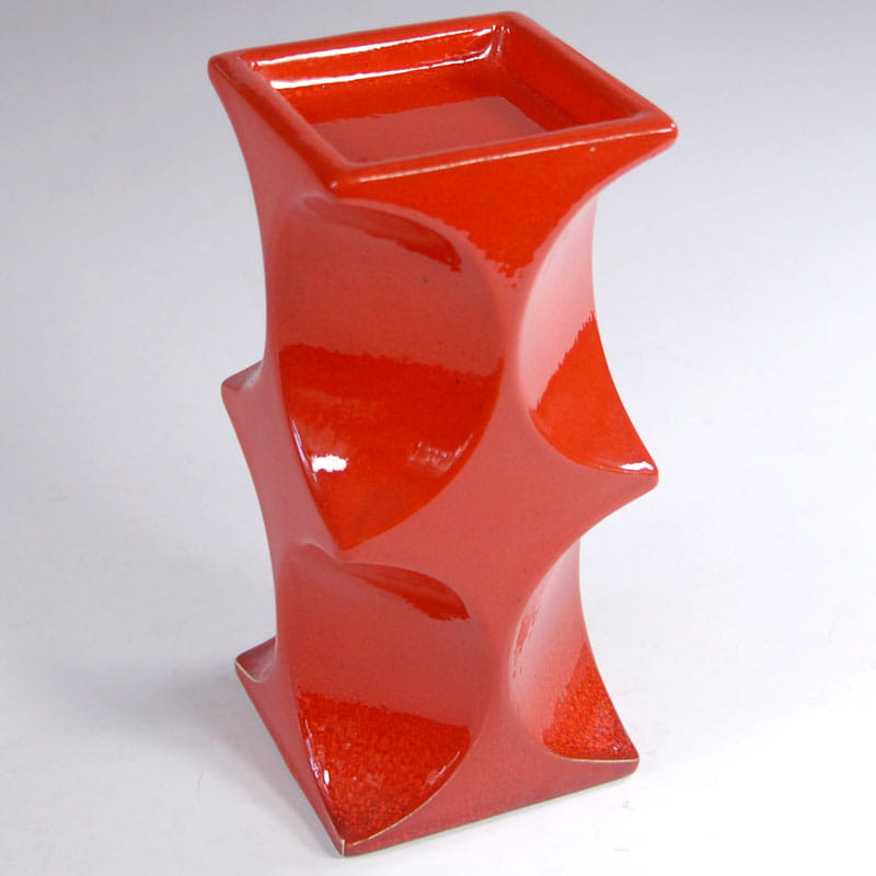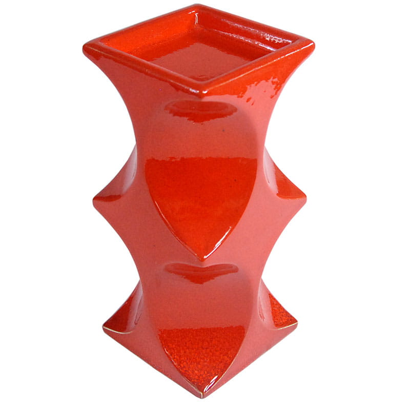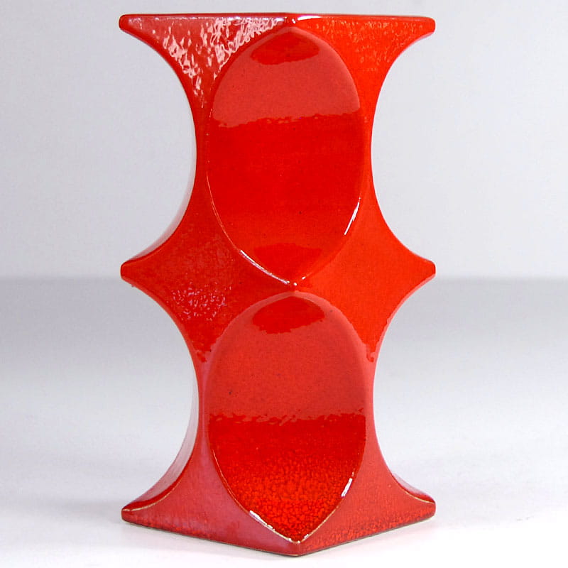 Duży świecznik ceramiczny w stylistyce Op Art w intensywnym pomarańczowym kolorze, zaprojektowany przez Cari Zalloni dla niemieckiej firmy Steuler. Jest elementem z serii Naam. Szkliwo w typie fat lava. Pochodzi z lat sześćdziesiątych XX wieku. Sygnowany. Zachowany w bardzo dobrym stanie z minimalnymi śladami używania. Wysokość: 20 cm. Wymiary podstawy: 9 x 9 cm. Wymiary miejsca pod świecę: 8 x 8 cm.