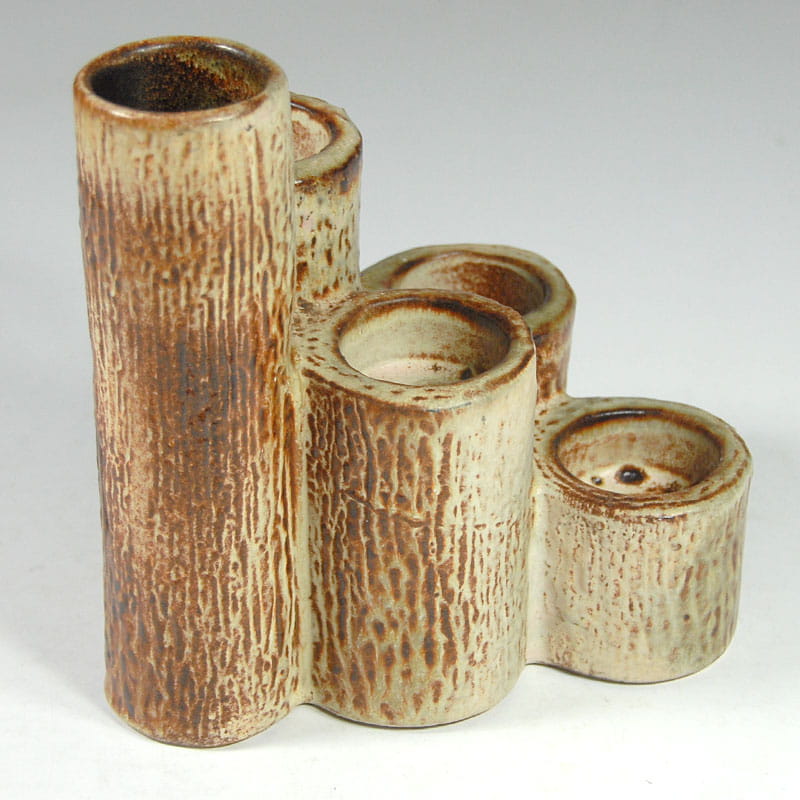 Dekoracyjny świecznik stołowy zrobiony ze szkliwionej ceramiki. Zbudowany jest z modułów które służą do umieszczenia świec lub tilajtów. Najwyższy z modułów może pełnić funkcję wazonu. Sygnowany numerycznie. Zachowany w bardzo dobrym stanie. Pochodzi z lat siedemdziesiątych XX wieku. Wysokość: 17,5 cm. Wymiary podstawy: 17 x 13 cm.