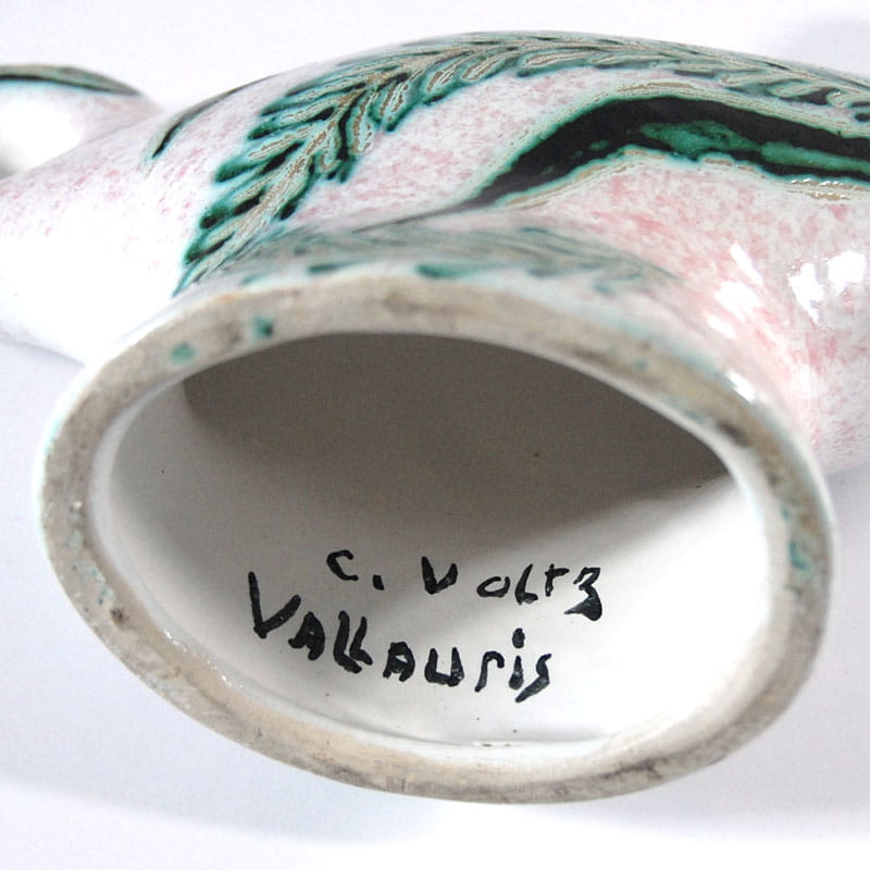 Szkliwiony świecznik ceramiczny pochodzący a Francji z wytwórni Vallauris. Zaprojektowany przez Charlsa Voltza. Sygnowany. Delikatne ślady używania. Dwa drobne ubytki na górnej krawędzi. Wysokość: 18 cm. Szerokość: 25 cm. Głębokość: 9 cm.