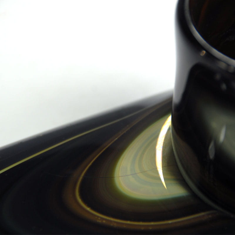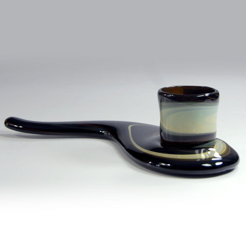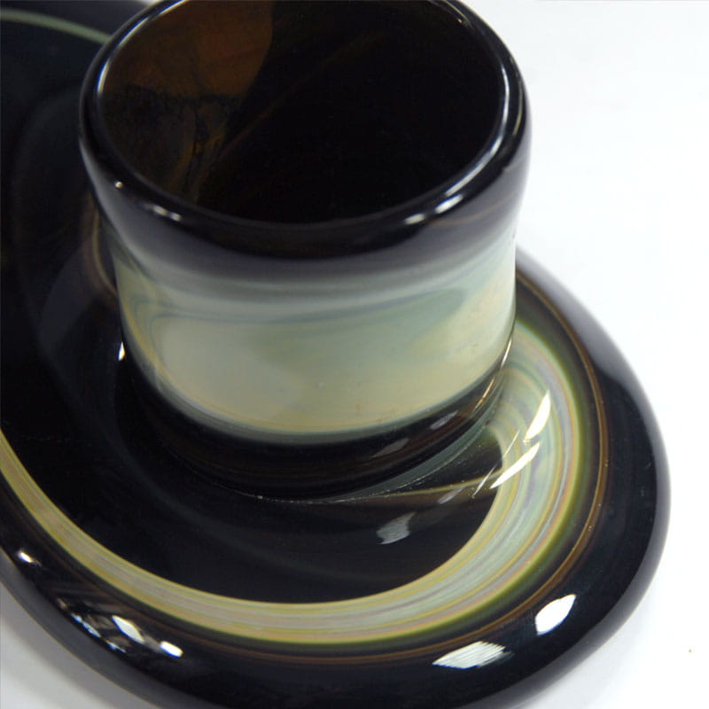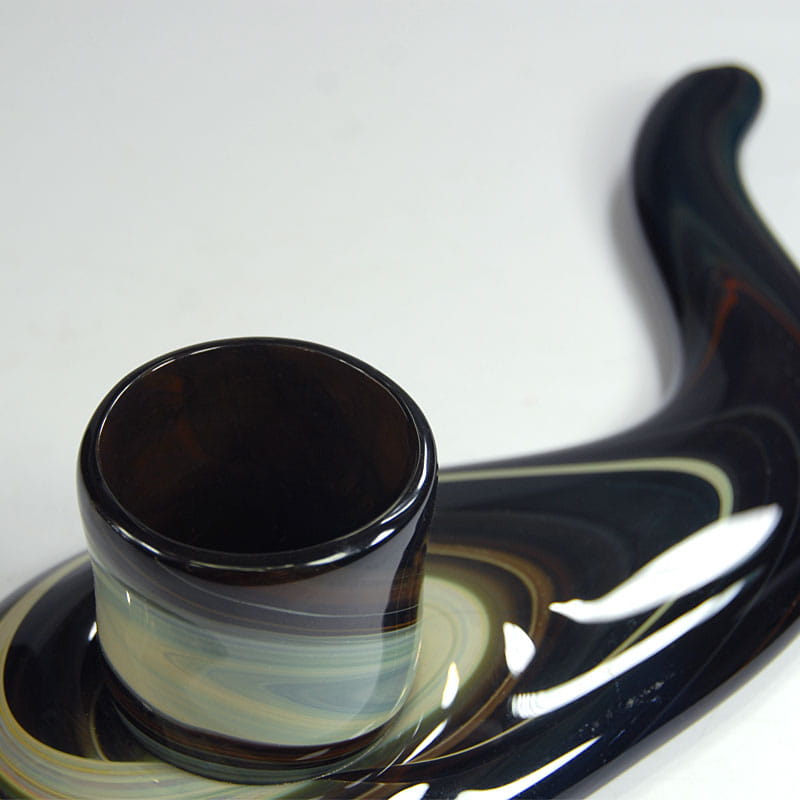 Dekoracyjny świecznik zrobiony z ręcznie formowanego szkła z dużym połyskiem. Pochodzi z Niemiec z lat siedemdziesiątych XX wieku. Nosi niewielkie ślady używania głównie w postaci drobnych zarysowań powierzchni. Średnica otworu pozwala na umieszczenie szerszej świecy lub tealight. Wymiary zewnętrzne: 30 x 15 x 8 cm.