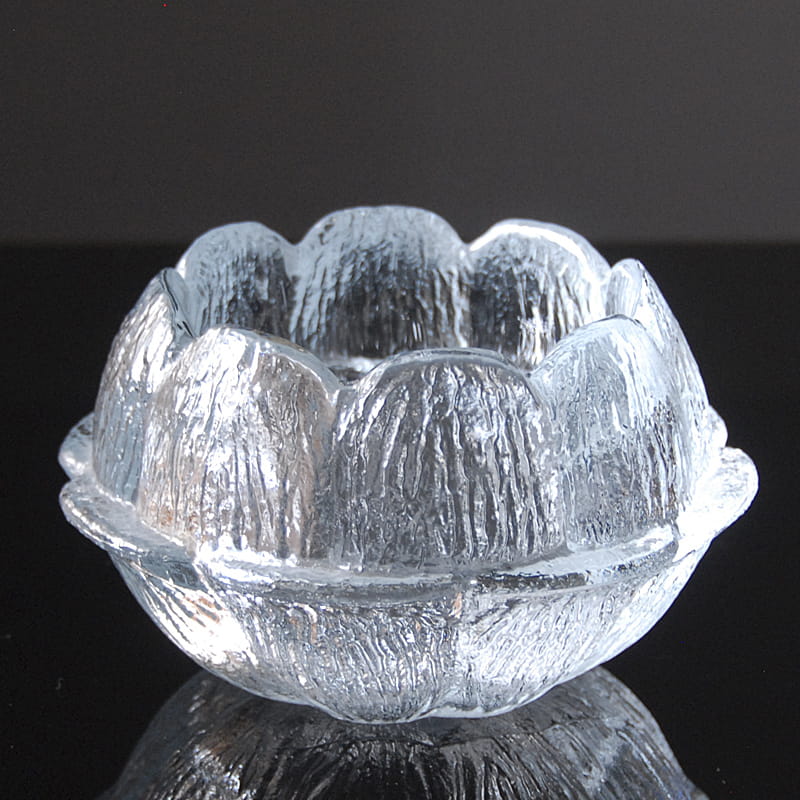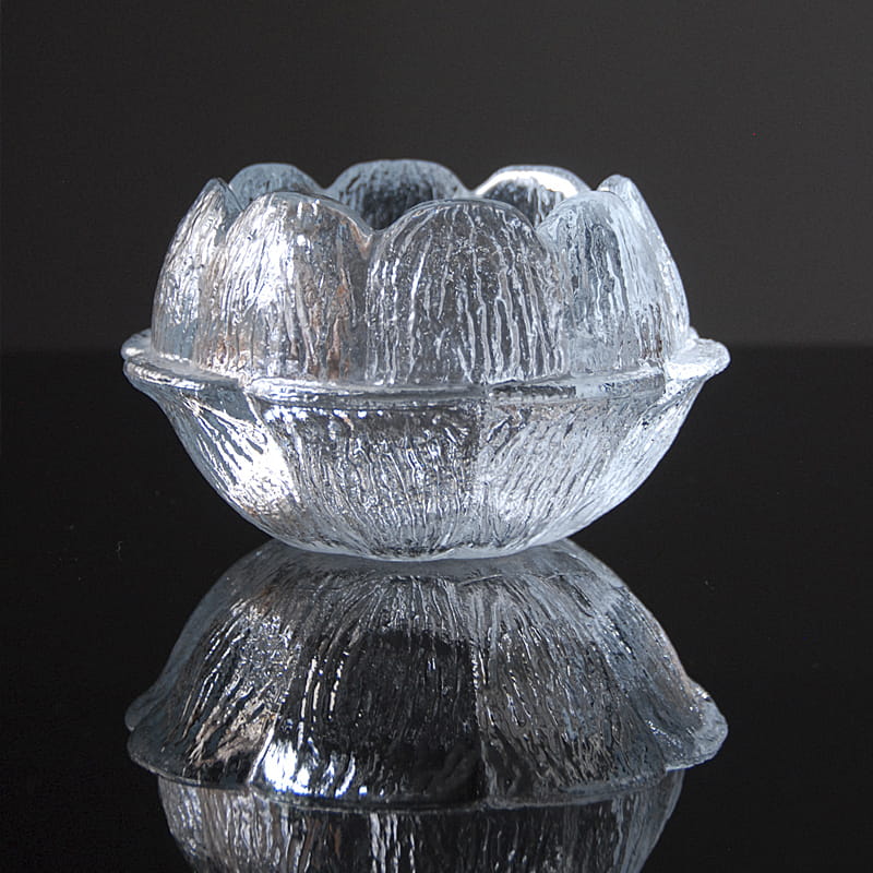 Piękny wazon/świecznik w kształcie lilii wodnej. Wykonany przez duńską firmę Holmegaard. Przedmiot oryginalny vintage z lat siedemdziesiątych XX wieku. Wysokość: ok. 11 cm. Średnica: ok. 18 cm.