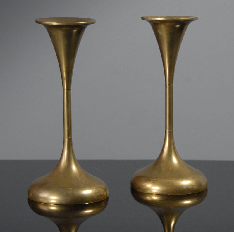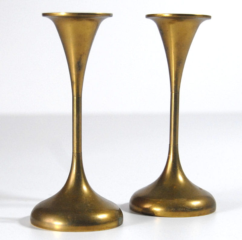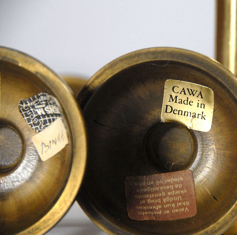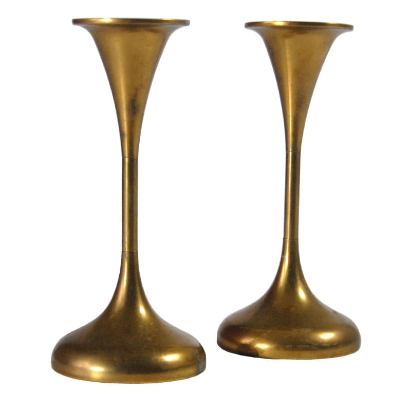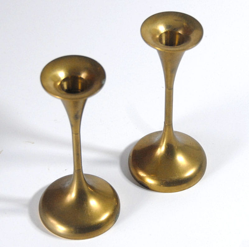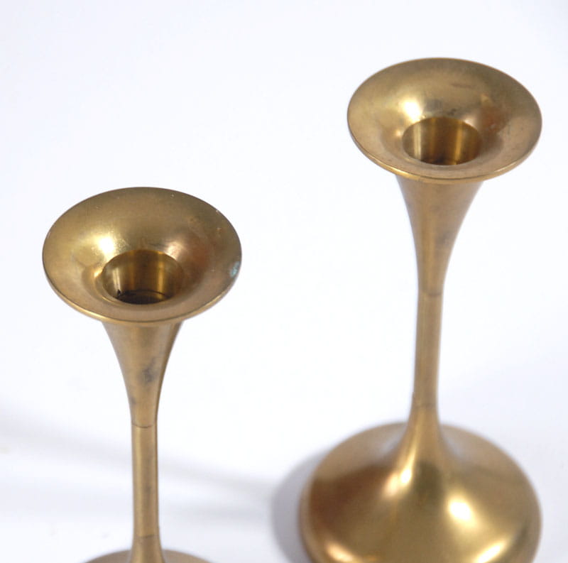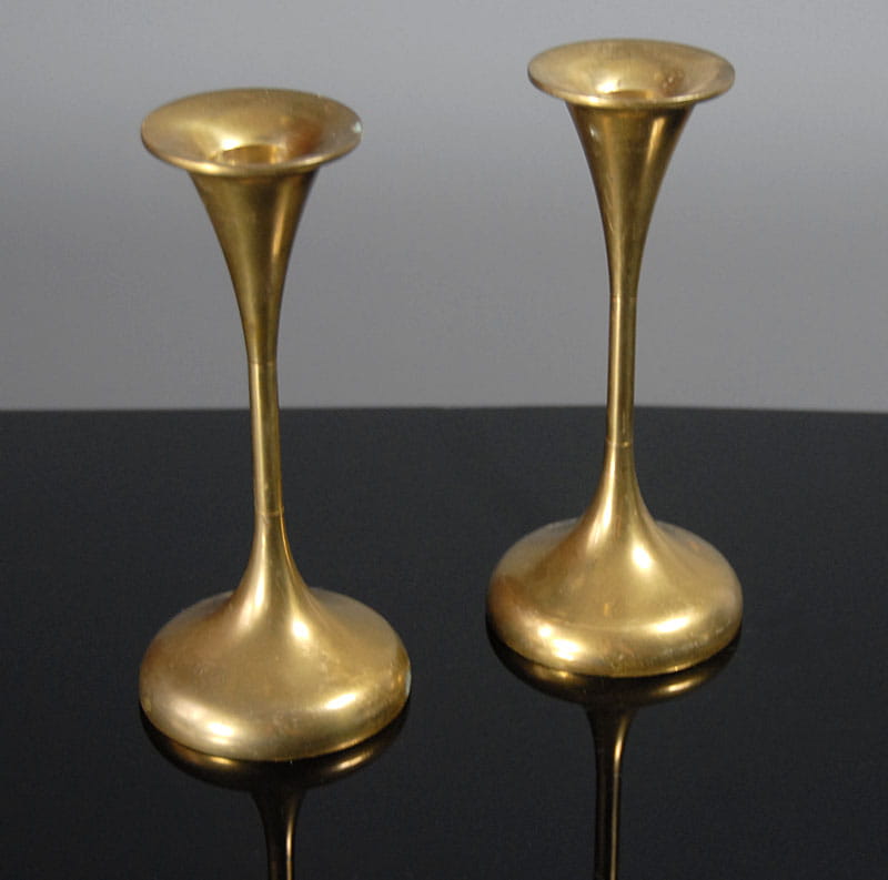 Mosiężne świeczniki pochodzące z lat sześćdziesiątych XX wieku. Wyprodukowane w Danii. Sygnowane. Wysokość: 15 cm. Średnica podstawy: 7 cm.