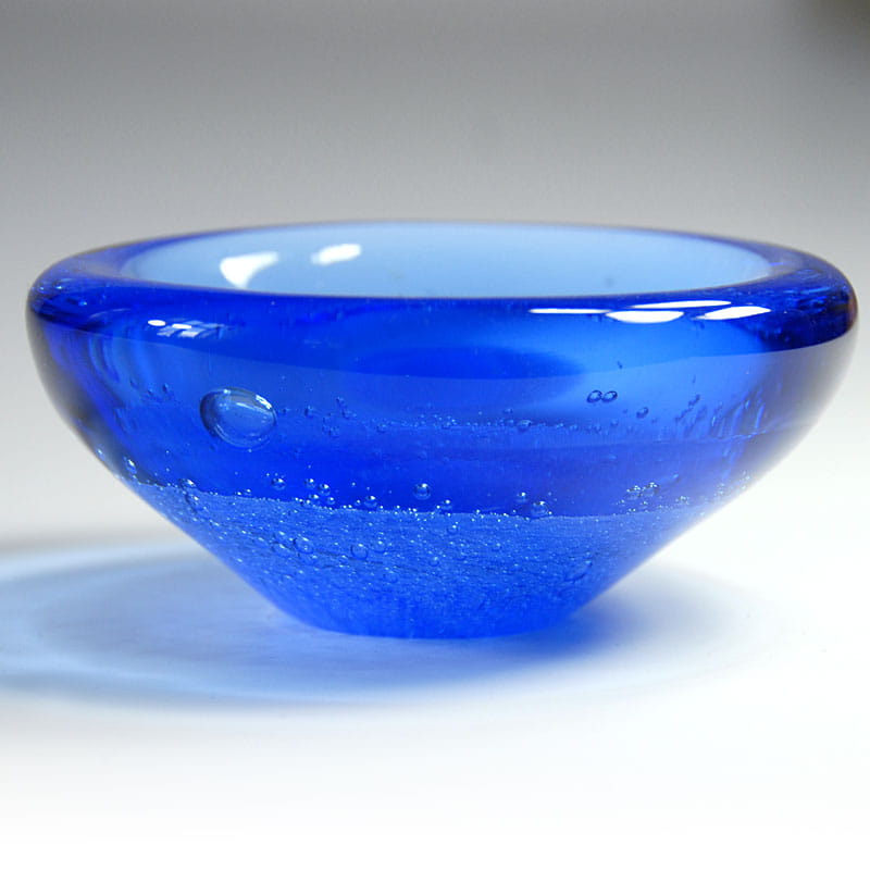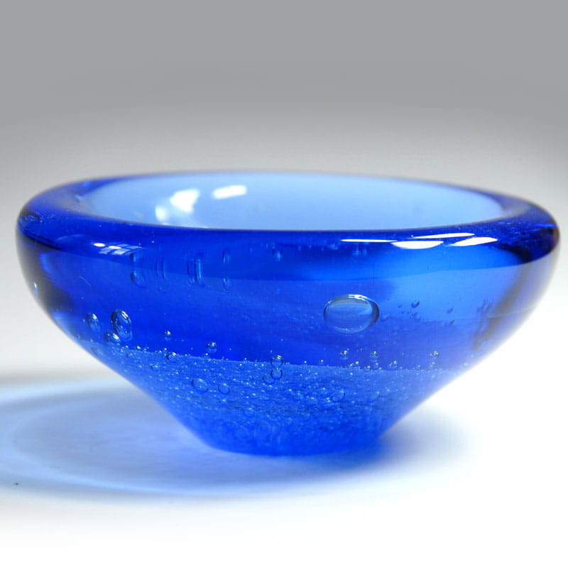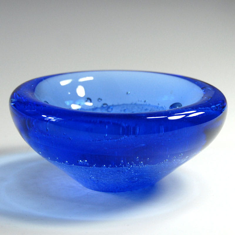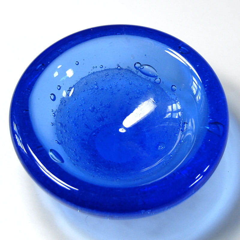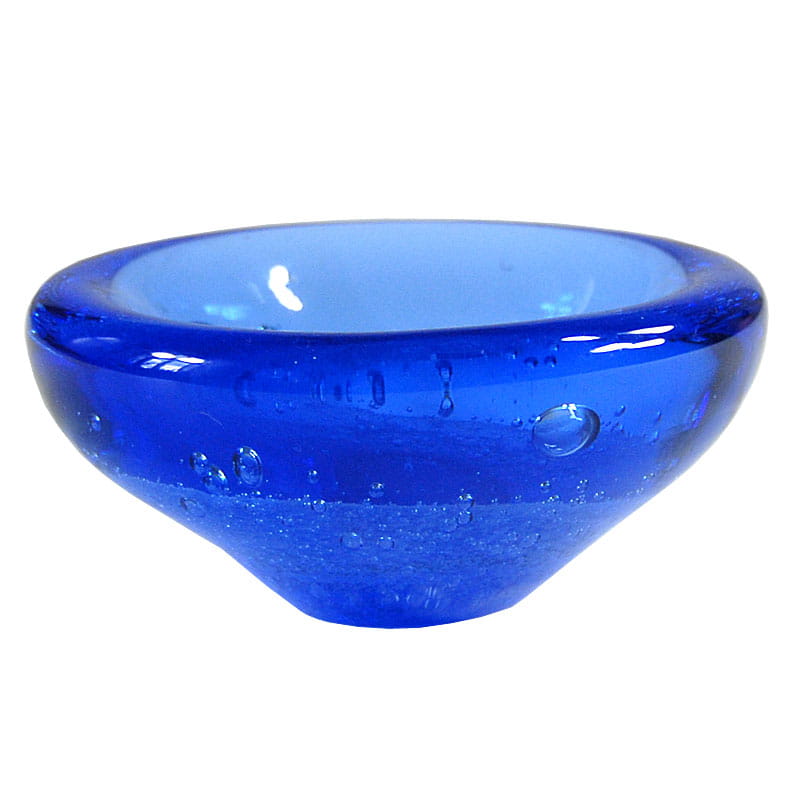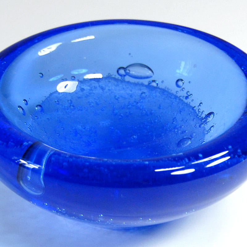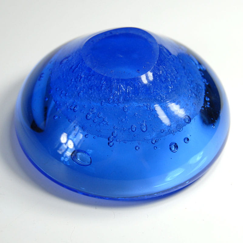 Niewielka, masywna miseczka ze szkła ręcznie formowanego w typie szkieł bullicante pochodzących z włoskiej wyspy Murano. Szkło z bąbelkami powietrza w pięknym szafirowym kolorze. Oryginalny przedmiot vintage pochodzący z lat osiemdziesiątych XX wieku. Wymiary: 12 x 5 cm.