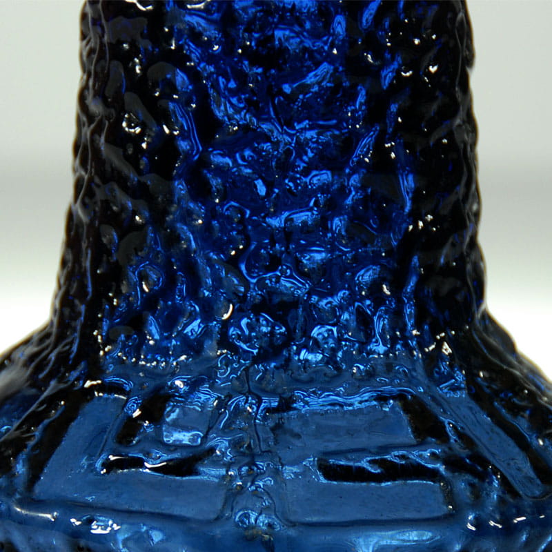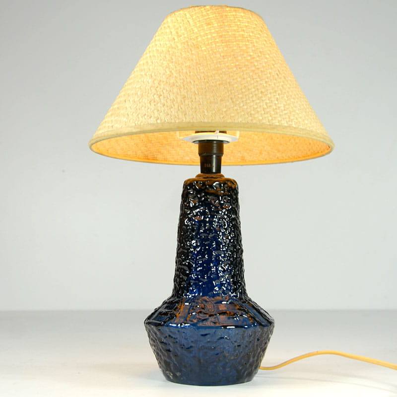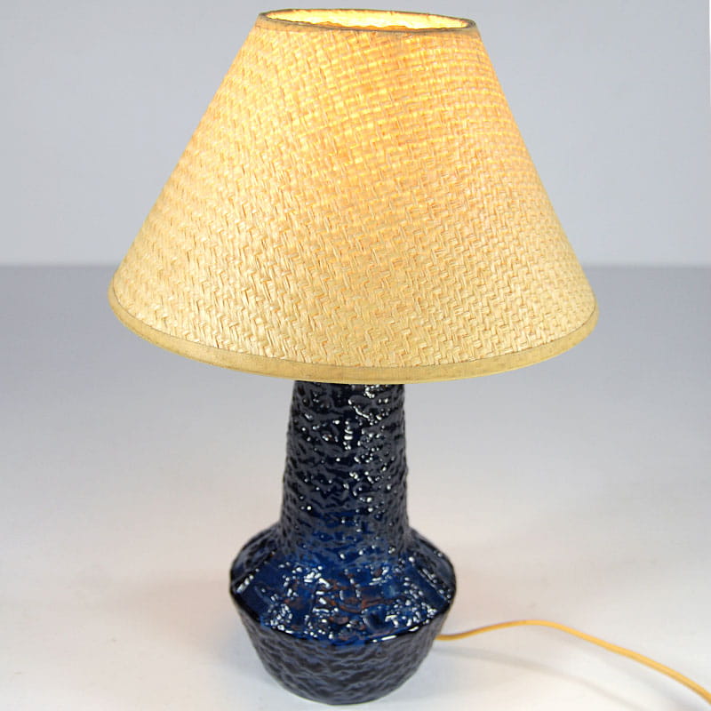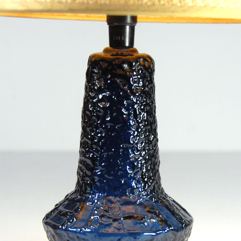 Dekoracyjna lampa stołowa pochodząca ze Szwecji z lat sześćdziesiątych XX wieku. Podstawa zaprojektowana przez Göte Augustsson dla wytwórni Ruda Glasbruk jest zrobiona ze szkła barwur oryginalny. Wysokość: 40 cm. Wysokość podstawy bez żarówki: 28 cm. Średnica maksymalna: 15 cm. Średnica abażura: 25 cm. Średnica dolna podstawy: 9 cm.